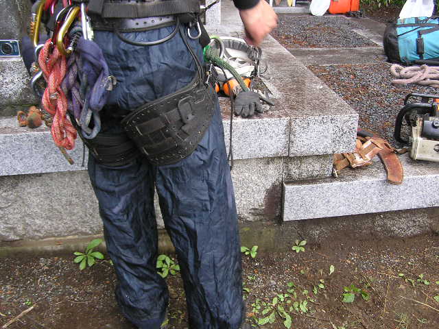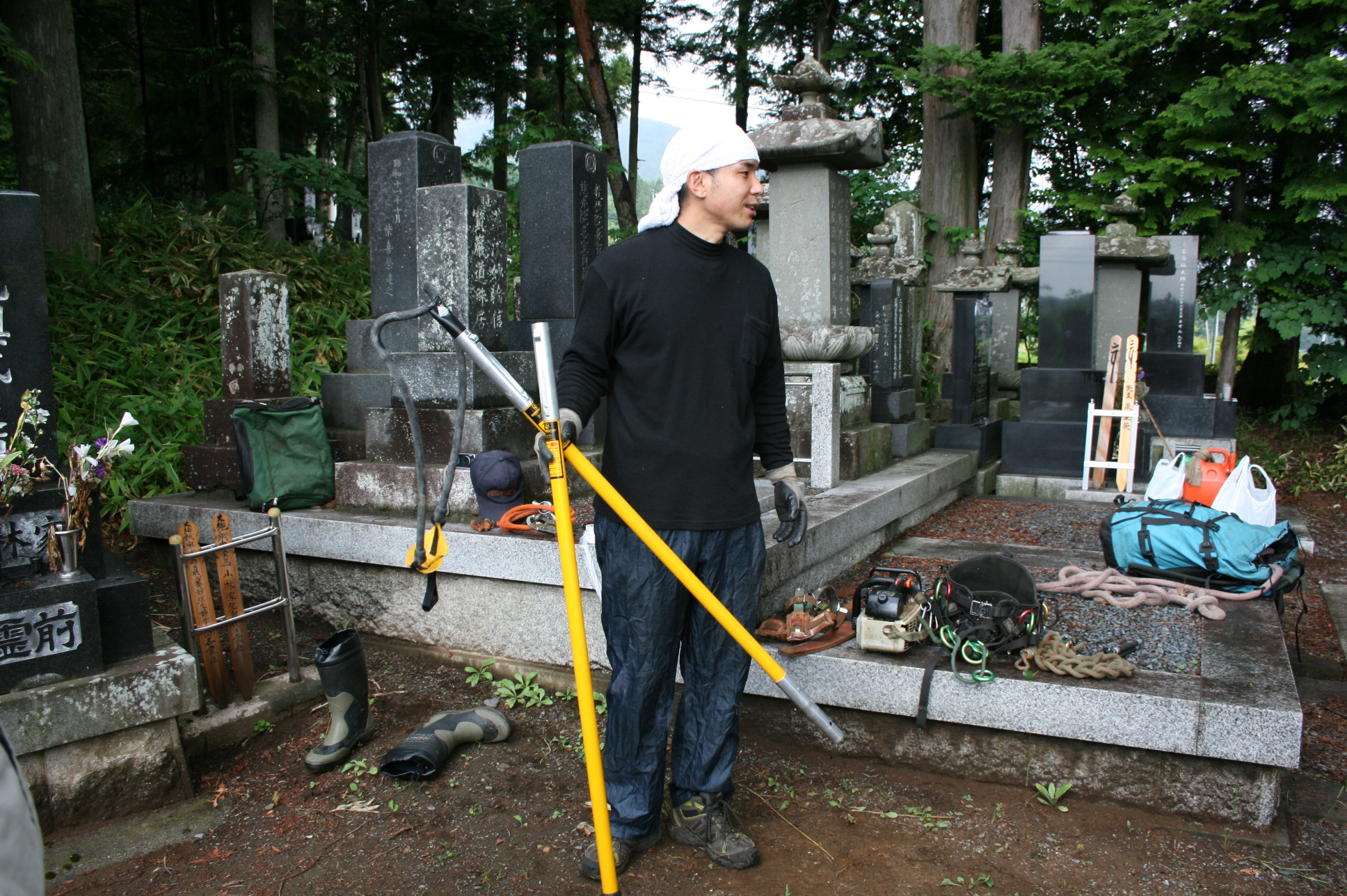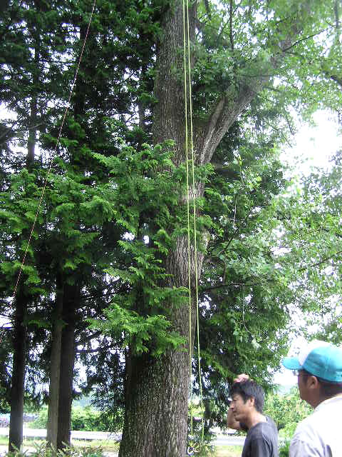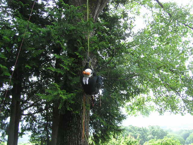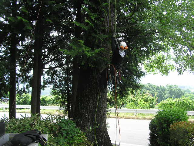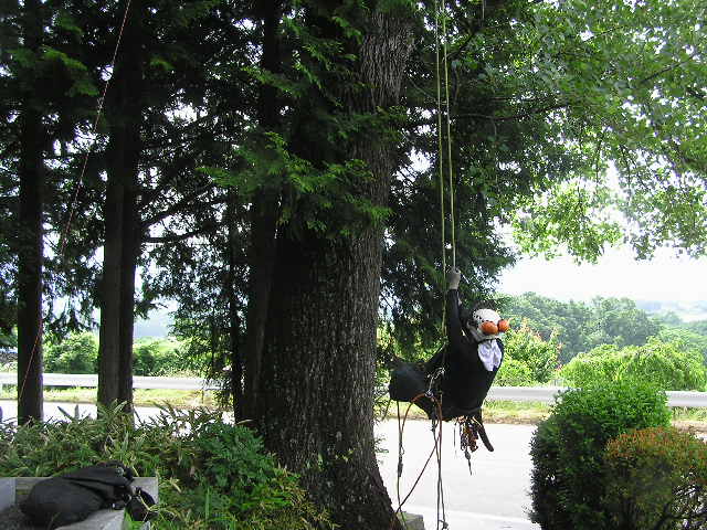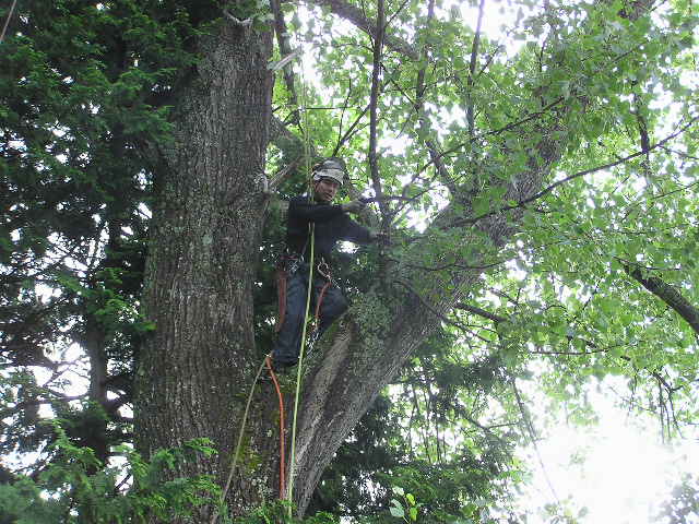 先週末の忙しさの第二弾は、恒例の愉快な仲間達(上伊那民商青年部)の「お仕事訪問」。恒例といいながら、最近はご無沙汰でした。 今回の訪問先は、樵。伊那谷里山研究所のOさんの特殊伐採を見学しました。今回で二度目です。新しい愉快な仲間達(上伊那民商青年部)が増えているので、見たことがない人の希望で再び見学です。 Oさんは、重機を使わないで木を切る「特殊伐採」をやる樵です。建物やお墓の周りなどの重機が入れない場所や、下に枝を落とすことができないような場所など、通常と違った難しい切り方を要求される現場へ行って木を切るのです。 今回も 挟まれた場所で、重機はもちろん入りませんが、木をどちらにも倒すことが出来ません。大変な場所です。 今回切るのは、 「何の木でしょう?」と聞かれますが、誰も分かりません。ヒントは、「喫茶店によくある名前です」それでも誰も分かりません。答えは「ポプラ」。みんな口々に「ポプラって!?」「そんな喫茶店は聞いたことがない」とOさんに文句を言っています。 このポプラは、樹齢47年くらいだそうです。「切ってみないと詳しくは分からない」そうです。 「直径は1m」木の直径は、高さ1.2mのところで測って、かつ一番短いところの長さだそうです。「知らなかった」直径1mより太そうな感じでしたが、そういうことだそうです。 現場に行くと既に木に これは、下から投げて引っ掛けるそうです。 ロープにこの 組み立てると 「凄い!」みんなはしゃいでいます。商品名も「ビッグショット」。楽しいですねぇ。 いよいよ 手の力が要りそうですが、使うのは足の力だそうです。 3階建ての高さ位に登っています。 まずは、 そして、 切った枝は、予めロープを巻いてあったので、ゆっくりと 凄いなあ。いつみても凄い仕事です。 今の時期は、木が水を吸っているので、枝だけ落として、幹を切るのは冬にやるそうです。冬にまた見学にいこうかな。 今回も、樵の仕事に圧倒されました。Oさんありがとうございました。 皆さんのお家でも、重機が入らなくて伸び放題の木は、Oさんにご相談を。 久々のお仕事訪問。やはり面白いです。次は誰の見学かな。 ※カフェは今日6/20(木)18:00〜貸切(L.O.17:00)。21日(金)夜貸切。22日(土)13:00までと17:00〜貸切(L.O.16:00)13:00〜17:00が通常営業。23日(日)終日貸切となります。何卒ご了承ください。その他の6月の営業のお知らせは、5/30(■■■)の記事にあります。ブログ右側の営業カレンダーもご覧下さい。 ※カイロは予約制にて営業しております。予約が埋まってしまいご希望のお時間を承れないことが増えてきましたので、お早めにお問い合わせ・ご予約をいただきますようお願いいたします。