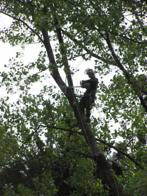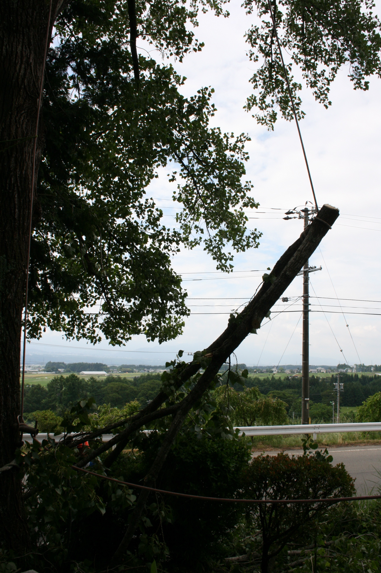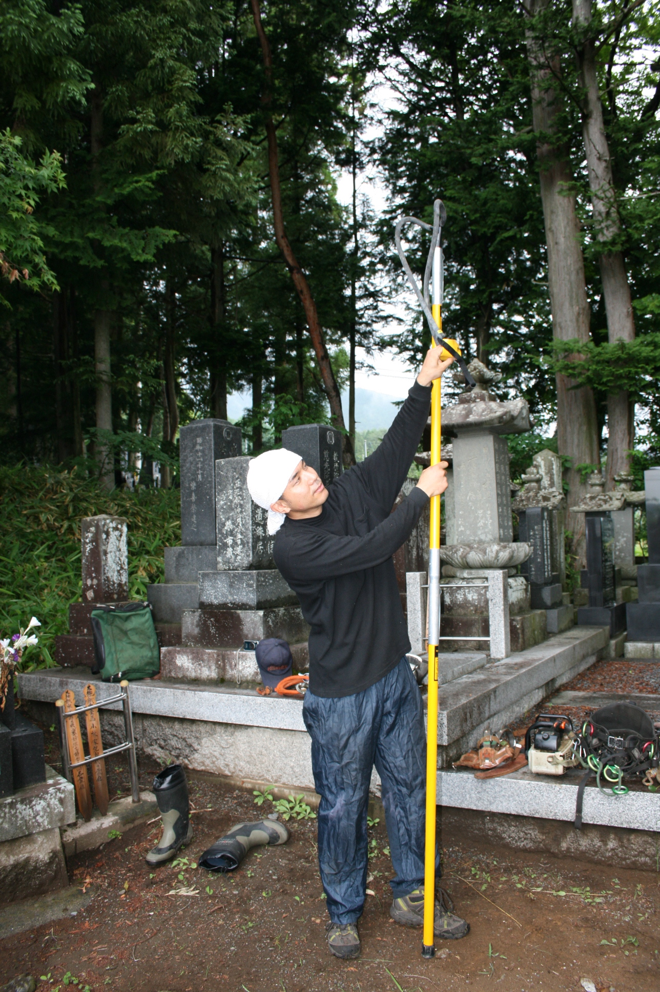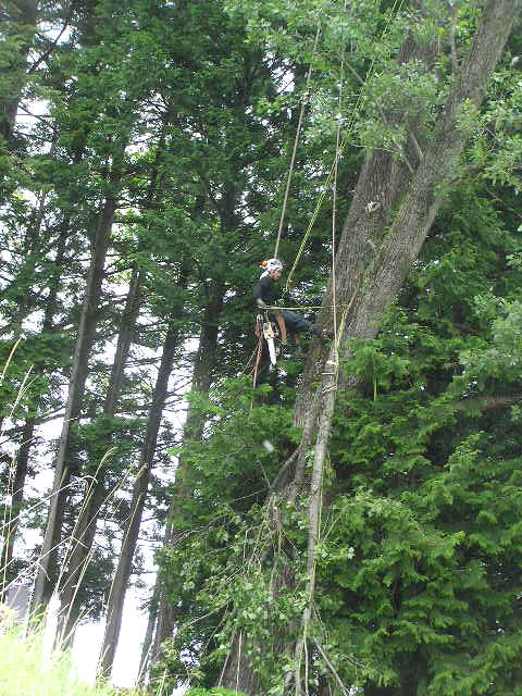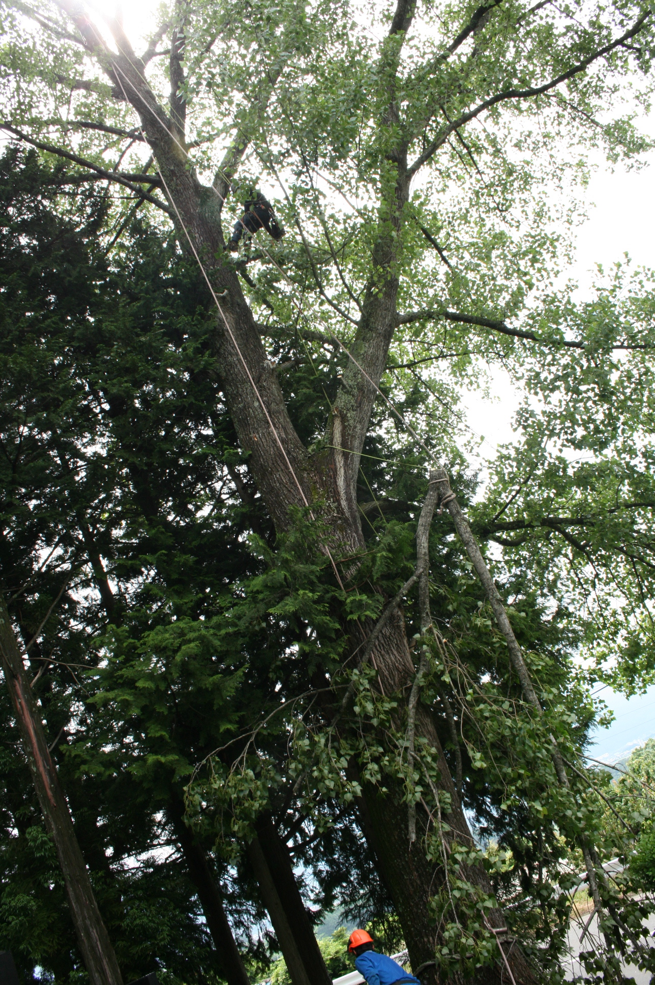 先週末の忙しさの第二弾は、恒例の愉快な仲間達(上伊那民商青年部)の「お仕事訪問」。恒例といいながら、最近はご無沙汰でした。 今回の訪問先は、樵。伊那谷里山研究所のOさんの特殊伐採を見学しました。今回で二度目です。新しい愉快な仲間達(上伊那民商青年部)が増えているので、見たことがない人の希望で再び見学です。 Oさんは、重機を使わないで木を切る「特殊伐採」をやる樵です。建物やお墓の周りなどの重機が入れない場所や、下に枝を落とすことができないような場所など、通常と違った難しい切り方を要求される現場へ行って木を切るのです。 今回も 挟まれた場所で、重機はもちろん入りませんが、木をどちらにも倒すことが出来ません。大変な場所です。 今回切るのは、 「何の木でしょう?」と聞かれますが、誰も分かりません。ヒントは、「喫茶店によくある名前です」それでも誰も分かりません。答えは「ポプラ」。みんな口々に「ポプラって!?」「そんな喫茶店は聞いたことがない」とOさんに文句を言っています。 このポプラは、樹齢47年くらいだそうです。「切ってみないと詳しくは分からない」そうです。 「直径は1m」木の直径は、高さ1.2mのところで測って、かつ一番短いところの長さだそうです。「知らなかった」直径1mより太そうな感じでしたが、そういうことだそうです。 現場に行くと既に木に これは、下から投げて引っ掛けるそうです。 ロープにこの 組み立てると 「凄い!」みんなはしゃいでいます。商品名も「ビッグショット」。楽しいですねぇ。 いよいよ 手の力が要りそうですが、使うのは足の力だそうです。 3階建ての高さ位に登っています。 まずは、 そして、 切った枝は、予めロープを巻いてあったので、ゆっくりと 凄いなあ。いつみても凄い仕事です。 今の時期は、木が水を吸っているので、枝だけ落として、幹を切るのは冬にやるそうです。冬にまた見学にいこうかな。 今回も、樵の仕事に圧倒されました。Oさんありがとうございました。 皆さんのお家でも、重機が入らなくて伸び放題の木は、Oさんにご相談を。 久々のお仕事訪問。やはり面白いです。次は誰の見学かな。 ※カフェは今日6/20(木)18:00〜貸切(L.O.17:00)。21日(金)夜貸切。22日(土)13:00までと17:00〜貸切(L.O.16:00)13:00〜17:00が通常営業。23日(日)終日貸切となります。何卒ご了承ください。その他の6月の営業のお知らせは、5/30(■■■)の記事にあります。ブログ右側の営業カレンダーもご覧下さい。 ※カイロは予約制にて営業しております。予約が埋まってしまいご希望のお時間を承れないことが増えてきましたので、お早めにお問い合わせ・ご予約をいただきますようお願いいたします。
