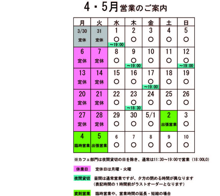 フルーツのヨーグルトサンデーがひっそりと春バージョンになっています。 です。いちごをソースにして使っています。有報堂のすぐ上のみはらしファームで作られているいちごを使った自家製ソースですよ。いちご狩りが人気ですが、有報堂は狩らずに買っています。美味しい春の味を召し上がれ。 ※4月の営業のお知らせは3/25の記事(■■■)にあります。ブログ右側の営業カレンダーもご覧下さい。 ※カイロは完全予約制にて営業しております。早めに電話または窓口でお問い合わせ・ご予約をいただきますようお願いいたします。 4~5月の営業のお知らせです。 月・火は定休日ですが、G.W.の関係で営業している日もあったり色々です。 ↑↑↑ クリックすると大きくなります。 4~5月変則営業 5月2日(土)出張営業 4日(月)臨時営業 5日(火)出張営業 貸切の予定は、 4月 1日(水)夜貸切 9日(木)夜貸切 12日(土)夜貸切 17日(金)夜貸切 23日(木)18:30~貸切(L.O.17:30) 夜貸切の日は、通常営業は19:00までです。 もうゴールデンウイークのお知らせです。早いですねえ。 4~5月は、貸切ではなくても予約が入っている日が多くなっています。 ご来店前にお席のお問い合わせを頂けると確実です。 貸切以外は通常営業をしています。 ぜひお立ち寄りください。 夜の予約営業も貸切日以外は受け付けていますので、 お気軽にお問い合わせください。 ※カイロは完全予約制にて営業しております。早めに電話または窓口でお問い合わせ・ご予約をいただきますようお願いいたします。 今週作った安心安全、完全手作りの 雑穀入り五分づきごはん、筑前煮、チキンkつ、ほうれん草辛子和え、ポテトサラダでした。これで1,000円です。 有報堂のお弁当は、野菜が多くて味付けも薄めにしているので、ヘルシーです。ご希望があれば飲み物やデザートもお付けします。 単価は1000円〜、個数は昼10個〜・夜20個〜で承ります。個数によって単価はご相談に応じます(お安くできることもあります)。有報堂のお弁当はいかがですか?お弁当は予約制です。スタッフにお気軽にお問い合わせください。 ※3月の営業のお知らせは2/25の記事(■■■)にあります。ブログ右側の営業カレンダーもご覧下さい。 ※カイロは完全予約制にて営業しております。早めに電話または窓口でお問い合わせ・ご予約をいただきますようお願いいたします。 今週の月曜日定休日だが、真面目に働いてみた。 安心安全、完全手作りの を作っていました。 金魚飯、筑前煮、天ぷら(鶏肉、白身魚、ふきのとう)、ほうれん草辛子和え、里芋サラダでした。これで、1,000円です。 春のお弁当。最近気候が良いからかお弁当の注文が少し増えています。皆さんもいかがですか。 有報堂のお弁当は、野菜が多くて味付けも薄めにしているので、ヘルシーです。ご希望があれば飲み物やデザートもお付けします。 単価は1000円〜、個数は昼10個〜・夜20個〜で承ります。個数によって単価はご相談に応じます(お安くできることもあります)。有報堂のお弁当はいかがですか?お弁当は予約制です。スタッフにお気軽にお問い合わせください。 ※3月の営業のお知らせは2/25の記事(■■■)にあります。ブログ右側の営業カレンダーもご覧下さい。 ※カイロは完全予約制にて営業しております。早めに電話または窓口でお問い合わせ・ご予約をいただきますようお願いいたします。
