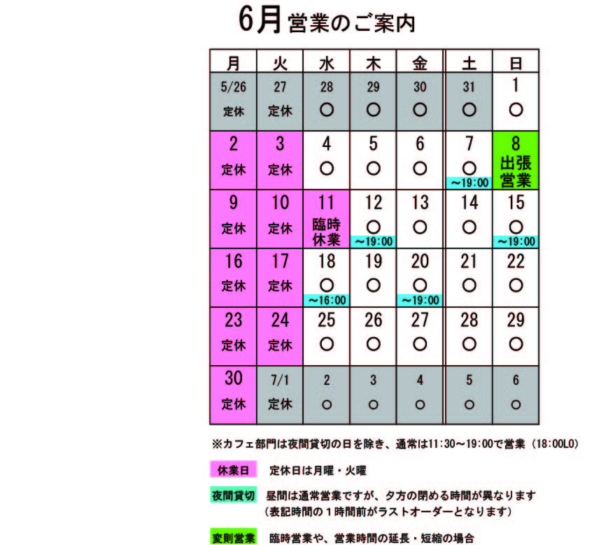 有報堂カフェのお食事予約。コース料理をご注文いただくと、当たり前ですが通常とはちょっと違ったメニューが出ます。 先週作った安心安全、完全手作りの 雑穀入り五分づきごはん、海老ブロッコリーチリマヨソース、とんかつ、ラディッシュ酢漬け、たけのこの天ぷらでした。これで1,000円です。 有報堂のお弁当は、野菜が多くて味付けも薄めにしているので、ヘルシーです。ご希望があれば飲み物やデザートもお付けします。 単価は1000円〜、個数は昼10個〜・夜20個〜で承ります。個数によって単価はご相談に応じます(お安くできることもあります)。有報堂のお弁当はいかがですか?お弁当は予約制です。スタッフにお気軽にお問い合わせください。 ※6月の営業のお知らせは5/25の記事(■■■)にあります。ブログ右側の営業カレンダーもご覧下さい。 ※カイロは完全予約制にて営業しております。早めに電話または窓口でお問い合わせ・ご予約をいただきますようお願いいたします。 有報堂カフェのお食事予約。コース料理をご注文いただくと、当たり前ですが通常とはちょっと違ったメニューが出ます。 5月に毎年人気なのは、 写真の日は、タラの芽とこごみと筍の天ぷらでした。 この日は、朝堀りの筍を頂いたのです。「今日食べれば穂先は、アク抜きしなくても食べられるよ」とのことでしたので、穂先をそのまま揚げました。アク抜きしないのが最高に楽。そして美味しい。 あなたも予約でしか食べられない、特別メニューを食べてみませんか? ※6月の営業のお知らせは5/25の記事(■■■)にあります。ブログ右側の営業カレンダーもご覧下さい。 ※カイロは完全予約制にて営業しております。早めに電話または窓口でお問い合わせ・ご予約をいただきますようお願いいたします。 有報堂カフェのお食事予約。コース料理をご注文いただくと、当たり前ですが通常とはちょっと違ったメニューが出ます。 先日も書いた(■■■)ように筍が豊作なので、 最近の有報堂のコース料理は が良く出ています。せっせと瓶詰を作っていますが瓶詰だけ作っていても減らないので、せっせとたけのこ料理を作っています。たけのこご飯は、お弁当や出張営業のおにぎりでも大人気です。 最近有報堂は、筍まつり。あなたも予約でしか食べられない、特別メニューを食べてみませんか? ※6月の営業のお知らせは5/25の記事(■■■)にあります。ブログ右側の営業カレンダーもご覧下さい。 ※カイロは完全予約制にて営業しております。早めに電話または窓口でお問い合わせ・ご予約をいただきますようお願いいたします。 6月の営業のお知らせです。 月・火が定休日です。 ↑↑↑ クリックすると大きくなります。 6月変則営業 8日(日)終日出張営業 11日(日)臨時休業 貸切の予定は、 6月 7日(土)夜貸切 12日(木)夜貸切 15日(日)夜貸切 18日(水)16:00~貸切(L.O.15:00) 20日(金)夜貸切 となっております。夜貸切の日は、通常営業は19:00までです。(いずれも通常営業の1時間前がL.Oになります) 貸切以外は通常営業をしています。 ぜひお立ち寄りください。 夜の予約営業も貸切日以外は受け付けていますので、 お気軽にお問い合わせください。 ※カイロは完全予約制にて営業しております。早めに電話または窓口でお問い合わせ・ご予約をいただきますようお願いいたします。 |