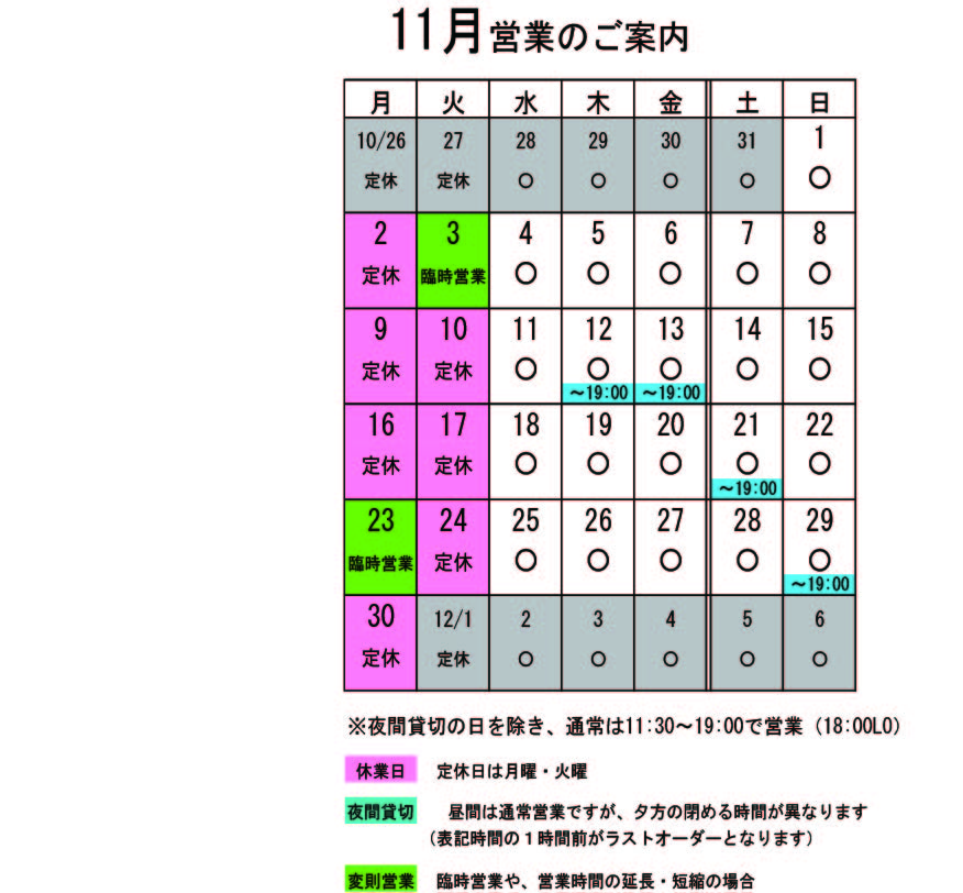 11月の営業のお知らせです。 月・火が定休日ですが、祝日の関係で不規則営業になっています。 ↑↑↑ クリックすると大きくなります。 11月変則営業 3日(火)臨時営業 23日(月)臨時営業 貸切の予定は、 11月 12日(木)夜貸切 13日(金)夜貸切 21日(土)夜貸切 29日(日)夜貸切 となっております。夜貸切の日は、通常営業は19:00までです。(いずれも通常営業の1時間前がL.Oになります) だんだん忘年会のシーズンになってきましたので、予約の入っている日が増えてきました。貸切ではなくても予約が入っている場合がありますので、有報堂で忘年会がやりたい!という方は、お早めにお問い合わせ下さい。お昼に予約したい!という方も大歓迎です。(お昼から飲めるならそれもいいですよね) 貸切以外は通常営業をしています。 ぜひお立ち寄りください。 夜の営業も貸切日以外は受け付けていますので、 お気軽にお問い合わせください。 ※カイロは完全予約制にて営業しております。早めに電話または窓口でお問い合わせ・ご予約をいただきますようお願いいたします。