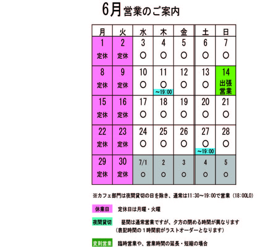 随分暑くなったので、夏季限定ドリンクを始めました。 夏季限定ドリンクの王者は、 です。 何の王者かといえば、長居の王者です。氷が溶けても薄くならない!氷が溶けるのを待ちながら、ゆっくり飲むのがお薦め!本を読みながら、ゆっくり飲む。ブックカフェにぴったりのドリンクです。 冷たいコーヒーの氷に冷たい牛乳。冷え冷えきんきんのコラボ。さあ召し上がれ。 夏季限定ドリンクを始めたので、秋冬限定ドリンクは終了です。またシーズンをお待ちください。 ※6月の営業のお知らせは5/30の記事(■■■)にあります。ブログ右側の営業カレンダーもご覧下さい。 ※カイロは完全予約制にて営業しております。早めに電話または窓口でお問い合わせ・ご予約をいただきますようお願いいたします 6月の営業のお知らせです。 月・火が定休日です。 ↑↑↑ クリックすると大きくなります。 6月変則営業 14日(日)終日出張営業 貸切の予定は、 6月 11日(木)夜貸切 27日(土)夜貸切 となっております。夜貸切の日は、通常営業は19:00までです。(いずれも通常営業の1時間前がL.Oになります) 貸切以外は通常営業をしています。 ぜひお立ち寄りください。 夜の予約営業も貸切日以外は受け付けていますので、 お気軽にお問い合わせください。 新型コロナウイルスの感染拡大に伴う飲食店への休業要請は、解除されましたが、しばらくの間、夜間は予約営業のみとさせて頂きます。 ※カイロは完全予約制にて営業しております。早めに電話または窓口でお問い合わせ・ご予約をいただきますようお願いいたします。