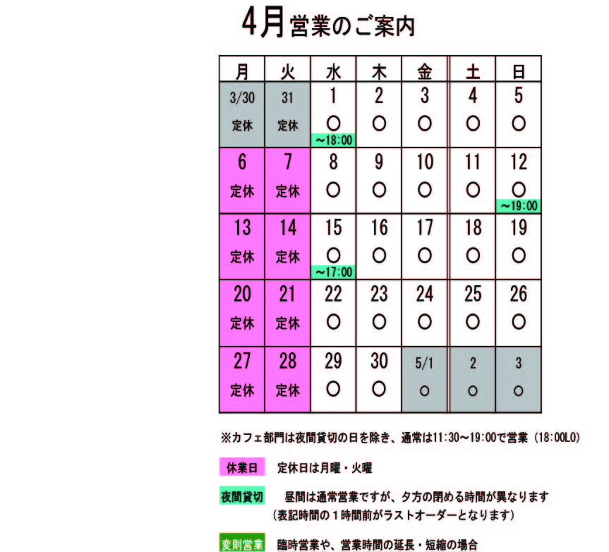 月・火が定休日です。 ↑↑↑ クリックすると大きくなります。 貸切の予定は、 4月 1日(水)18:00〜貸切(L.O.17:00) 12日(日)夜貸切 15日(金)17:00〜貸切(L.O.16:00) となっております。夜貸切の日は、通常営業は19:00までです。(いずれも通常営業の1時間前がL.Oになります) 貸切以外は通常営業をしています。 ぜひお立ち寄りください。 夜の営業も貸切日以外は受け付けていますので、 お気軽にお問い合わせください。 ※カイロは完全予約制にて営業しております。早めに電話または窓口でお問い合わせ・ご予約をいただきますようお願いいたします。