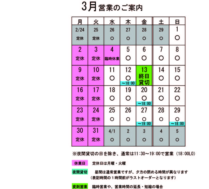 月・火が定休日です。 ↑↑↑ クリックすると大きくなります。 3月変則営業 4日(水)伊那の夜オリ(■■■)のため臨時休業 13日(木)予約のため終日貸切 貸切の予定は、 3月 12日(木)18:00〜貸切(L.O.17:00) 20日(金)18:00〜貸切(L.O.17:00) 27日(金)夜貸切 29日(日)18:00〜貸切(L.O.17:00) となっております。夜貸切の日は、通常営業は19:00までです。(いずれも通常営業の1時間前がL.Oになります) 貸切以外は通常営業をしています。 ぜひお立ち寄りください。 夜の営業も貸切日以外は受け付けていますので、 お気軽にお問い合わせください。 ※カイロは完全予約制にて営業しております。早めに電話または窓口でお問い合わせ・ご予約をいただきますようお願いいたします。