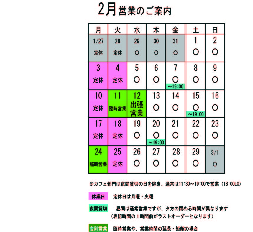 2月の営業のお知らせです。お知らせが遅くなって申し訳ありません。先月末からブログのサーバーの調子が悪くて書き込みが出来なかったのです。随分復旧したみたいなので、今後はまめに更新したい(希望)。