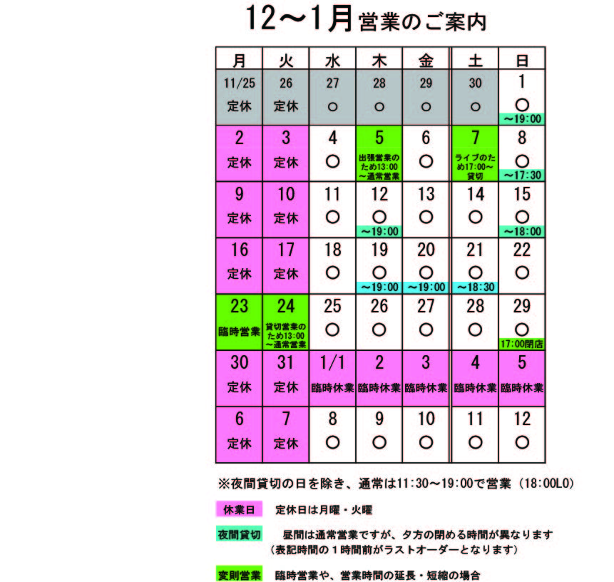 12月・1月の営業のお知らせです。 早いものでもう今年もあと1ヶ月。 月・火が定休日ですが、年末年始の関係で不規則営業になっています。 ↑↑↑ クリックすると大きくなります。 12月〜1月変則営業 12月 23(月)・24(火)日臨時営業 29日(日)17:00閉店 ※年末年始休みは12/30〜1/7です。年末年始を健やかに過ごしたい方は、カイロの予約をお早めに。 貸切の予定は、 12月 1日(日)夜貸切 5日(木)出張営業のため13時から通常営業 7日(土)夜ライブ「歌とギターとぬくもりと。」(■■■) (準備のため16:00L.O. 17:00〜18:00close、18:00〜ライブのため再開) 8日(日)17:30〜貸切(L.O.16:30) 9日(日)14:00まで貸切17:00〜貸切(L.O.16:00) 12日(木)夜貸切 15日(日)18:00〜貸切(L.O.17:00) 19日(木)夜貸切 20日(金)夜貸切 21日(土)18:30〜貸切(L.O.17:30) となっております。 夜貸切の日は、通常営業は19:00までです。(いずれも通常営業の1時間前がL.Oになります) 一年で一番忙しい12月です。おかげさまで貸切や予約が入り始めています。貸切ではなくても予約が入っている場合がありますので、有報堂で忘年会がやりたい!という方は、お早めにお問い合わせ下さい。お昼に予約したい!という方も大歓迎です。(お昼から飲めるならそれもいいですよね) 貸切以外は通常営業をしています。 ぜひお立ち寄りください。 夜の営業も貸切日以外は受け付けていますので、 お気軽にお問い合わせください。 ※カイロは完全予約制にて営業しております。早めに電話または窓口でお問い合わせ・ご予約をいただきますようお願いいたします。
