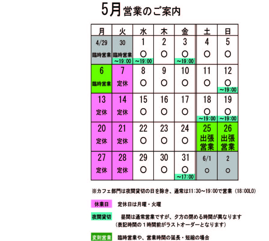 月・火は定休日ですが、G.W.の関係で営業している日もあったり色々です。 ↑↑↑ クリックすると大きくなります。 5月変則営業 6日(月)臨時営業 25日(土)終日出張営業 26日(日)終日出張営業 貸切の予定は、 5月 1日(水)夜貸切 3日(金)夜貸切 12日(日)夜貸切 18日(土)夜貸切 19日(日)夜貸切 31日(金)夜ライブ (■■■) (準備のため16:00L.O. 17:00〜18:00close、18:00〜ライブのため再開) 夜貸切の日は、通常営業は19:00までです。 5月は、貸切ではなくても予約が入っている日が多くなっています。ご来店前にお席のお問い合わせを頂けると確実です。 貸切以外は通常営業をしています。 ぜひお立ち寄りください。 夜の予約営業も貸切日以外は受け付けていますので、 お気軽にお問い合わせください。 ※カイロは完全予約制にて営業しております。早めに電話または窓口でお問い合わせ・ご予約をいただきますようお願いいたします。