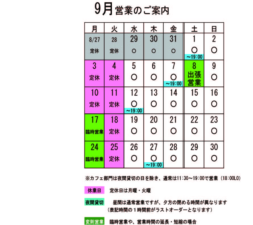 月・火が定休日ですが、祝日の関係で不規則営業になっています。 ↑↑↑ クリックすると大きくなります。 9月変則営業 8日(土)出張営業 17日(月・祝)臨時営業 24日(月・祝)臨時営業 貸切の予定は、 9月 1日(土)夜貸切 7日(金)夜貸切 12日(水)夜貸切 27日(木)夜貸切 夜貸切の日は、通常営業は19:00までです。 貸切以外は通常営業をしています。 ぜひお立ち寄りください。 夜の予約営業も貸切日以外は受け付けていますので、 お気軽にお問い合わせください。 ※カイロは完全予約制にて営業しております。早めに電話または窓口でお問い合わせ・ご予約をいただきますようお願いいたします。 8月19日に行われた 「第6回商工フェア〜これが私の生きる道〜」 は、おかげ様で無事終了しました。 ご来場頂いた皆さま本当にありがとうございました。 今年は、暑くもなく雨も降らずこれまで最高の天気となりました。 いつものように抽選会場も、 今年は、1000人の皆様にご来場頂きました。毎年ご参加頂いているお客さんや、体験系だけを目指してくるお客さんもたくさんいらして、商工フェアの趣旨が伝わり始めているのかなと実感しました。いつかは、全体が一つの場所で運営できる会場を探せるといいなと思っています。(いつになるんだろう…) 商工フェアの忙しさは変わらず、自分たちでは全然写真が撮れなかったので、愉快な仲間たちからデータを貰って詳細についてはまたご報告します。(始まる前の写真しかないのです) ※8月の営業のお知らせは7/26の記事(■■■)にあります。ブログ右側の営業カレンダーもご覧下さい。 ※カイロは完全予約制にて営業しております。早めに電話または窓口でお問い合わせ・ご予約をいただきますようお願いいたします。 先週の土曜日に、有報堂おなじみの福澤歩さんのライブで してきましたよ。 ライブでした。私はクリスチャンではないので、初めて伊那の教会に入りましたが、趣のある建物でした。 今回のライブは、福澤さんの5年ぶりのCDリリースを記念してのライブでした。ワンマンライブで100人を集めるというすごさです。福澤さんは、今週末の商工フェア(■■■)にもご出演いただきます。新CD「Collage」も販売しますよ。ぜひお越しください。 ※8月の営業のお知らせは7/26の記事(■■■)にあります。ブログ右側の営業カレンダーもご覧下さい。 ※カイロは完全予約制にて営業しております。早めに電話または窓口でお問い合わせ・ご予約をいただきますようお願いいたします。