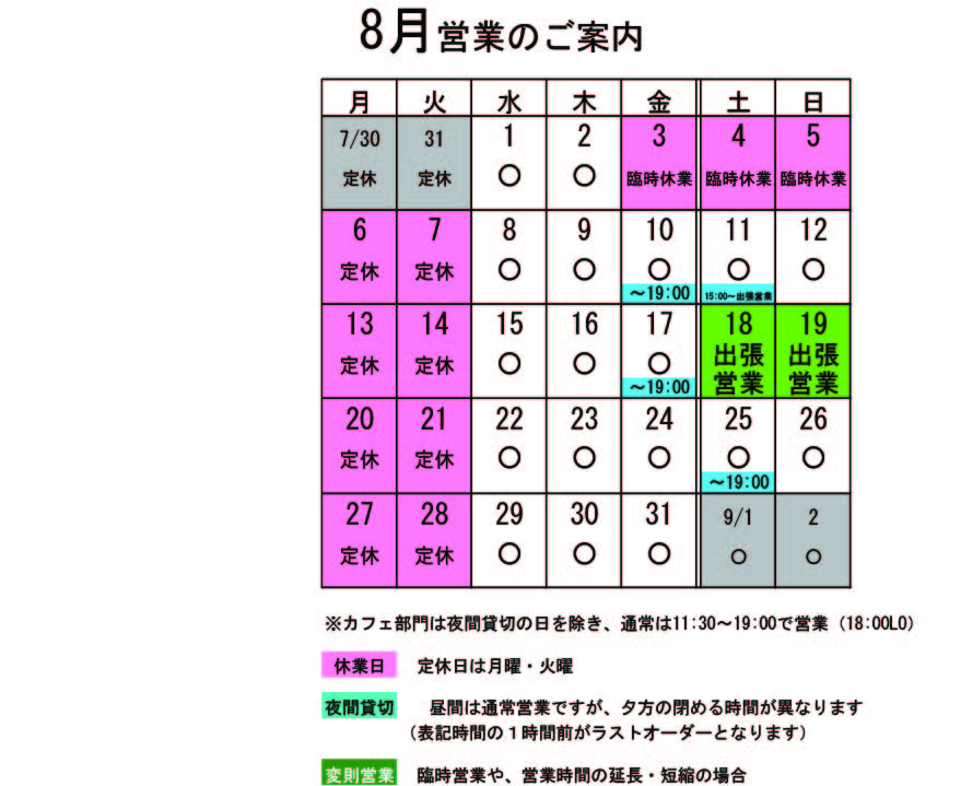 月・火が定休日です。臨時休業もあります。 ↑↑↑ クリックすると大きくなります。 8月変則営業 3日(金)〜5日(日)臨時休業 貸切の予定は、 8月 10日(金)夜貸切 11日(土)15:00〜出張営業(L.O.14:00) 17日(金)夜貸切 18日(土)商工フェア準備のため終日出張営業 19日(日)商工フェア(■■■)のため終日出張営業 25日(土)夜貸切 となっております。夜貸切の日は、通常営業は19:00までです。(いずれも通常営業の1時間前がL.Oになります) 月頭の連休は、いつものように皆さまの折り鶴(■■■)を持って広島に行ってきますよ。 早めの夏休みだと思ってご理解ください。よろしくね。 貸切以外は通常営業をしています。 ぜひお立ち寄りください。 夜の予約営業も貸切日以外は受け付けていますので、 お気軽にお問い合わせください。 ※カイロは完全予約制にて営業しております。早めに電話または窓口でお問い合わせ・ご予約をいただきますようお願いいたします。