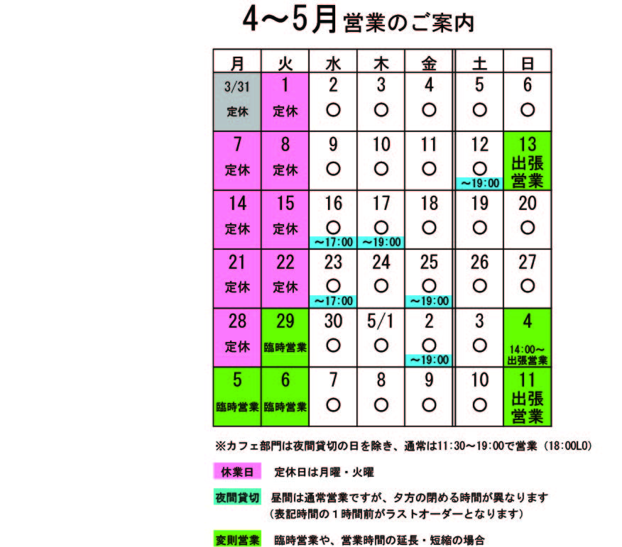 4~5月の営業のお知らせです。 月・火は定休日ですが、G.W.の関係で営業している日もあったり色々です。 ↑↑↑ クリックすると大きくなります。 4~5月変則営業 4月13日(日)出張営業 29日(火)臨時営業 5月4日(日)14:00まで通常営業 以降出張営業 5日(月)臨時営業 6日(火)臨時営業 11日(日)出張営業 貸切の予定は、 4月 12日(土)夜貸切 16日(水)17:00~貸切(L.O.16:00) 17日(木)夜貸切 23日(水)17:00~貸切(L.O.16:00) 25日(金)夜貸切 5月 2日(金)夜貸切 夜貸切の日は、通常営業は19:00までです。 もうゴールデンウイークのお知らせです。早いですねえ。 4~5月は、貸切ではなくても予約が入っている日が多くなっています。 ご来店前にお席のお問い合わせを頂けると確実です。 貸切以外は通常営業をしています。 ぜひお立ち寄りください。 夜の予約営業も貸切日以外は受け付けていますので、 お気軽にお問い合わせください。 ※カイロは完全予約制にて営業しております。早めに電話または窓口でお問い合わせ・ご予約をいただきますようお願いいたします。 有報堂カフェのお食事予約。コース料理をご注文いただくと、当たり前ですが通常とはちょっと違ったメニューが出ます。 2月のご予約でお出ししたのは ちょっと豪華にしたいとのご希望もあり、和風きのこソースに牛肉100%のハンバーグでした。これは美味しくないわけない♪「牛肉って美味しいな」とおしゃってました。 あなたも予約でしか食べられない、特別メニューを食べてみませんか? ※3月の営業のお知らせは2/28の記事(■■■)にあります。ブログ右側の営業カレンダーもご覧下さい。 ※カイロは完全予約制にて営業しております。早めに電話または窓口でお問い合わせ・ご予約をいただきますようお願いいたします。 雪です。この冬は、この辺は雪が少なくて助かるなあと思っていましたが、3月に入って4回目の雪かきです。そんなに甘くなかった(-_-;) 3月になったのに、12月の話題を。 12月に毎年恒例の手帳のハードカバー製本をやりました。 何の変哲もない なりました。全部で11冊頑張りました。 全部洋服などの古布を使っています。布も生まれ変わって満足しています。 ハードカバー製本や糸綴じノートのワークショップは、職員体制の都合で、ご要望に応じて開催することになっています。3人以上集まれば皆様のご都合に合わせて日程を組みますので、お気軽にお問い合わせください。料金は、製本する本の大きさや冊数で異なりますのでスタッフにご確認ください。 あなたも世界で一つだけの手帳やノートを作ってみませんか。 ※3月の営業のお知らせは2/28の記事(■■■)にあります。ブログ右側の営業カレンダーもご覧下さい。 ※カイロは完全予約制にて営業しております。早めに電話または窓口でお問い合わせ・ご予約をいただきますようお願いいたします。 昨日作った安心安全、完全手作りの 金魚めし、エビチリ、チキンカツ(タルタルソース)、大根の梅酢漬け、里芋の煮物でした。これで1,000円です。 有報堂のお弁当は、野菜が多くて味付けも薄めにしているので、ヘルシーです。ご希望があれば飲み物やデザートもお付けします。 単価は1000円〜、個数は昼10個〜・夜20個〜で承ります。個数によって単価はご相談に応じます(お安くできることもあります)。有報堂のお弁当はいかがですか?お弁当は予約制です。スタッフにお気軽にお問い合わせください。 ※3月の営業のお知らせは2/28の記事(■■■)にあります。ブログ右側の営業カレンダーもご覧下さい。 ※カイロは完全予約制にて営業しております。早めに電話または窓口でお問い合わせ・ご予約をいただきますようお願いいたします。 |