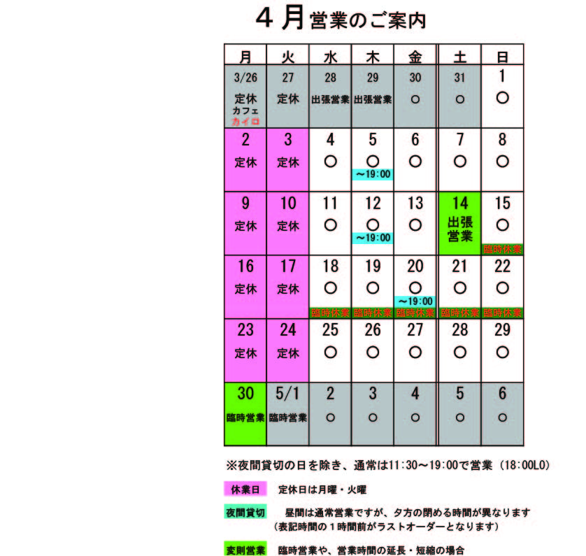 有報堂カフェのお食事予約。コース料理をご注文いただくと、当たり前ですが通常とはちょっと違ったメニューが出ます。 先日の予約でお出ししたのは、 ムネ肉でもモモ肉でもどちらでも美味しいですが、今回はモモ肉です。有報堂の鶏チャーシューは、酢がポイント。酢で煮るので、パサパサしないでふっくらジューシー。 あなたも予約でしか食べられない、特別メニューを食べてみませんか? ※4月の営業のお知らせは3/25の記事(■■■)にあります。ブログ右側の営業カレンダーもご覧下さい。※カイロは予約制にて営業しております。予約が埋まってしまいご希望のお時間を承れないことが増えてきましたので、お早めにお問い合わせ・ご予約をいただきますようお願いいたします。 有報堂カフェのお食事予約。コース料理をご注文いただくと、当たり前ですが通常とはちょっと違ったメニューが出ます。 先日の予約でお出ししたのは、 これは、ベトナムの鯰です。白身魚で淡水魚だから割と淡白な味なので、濃いソースと合います。今回はバジルソースでした。 あなたも予約でしか食べられない、特別メニューを食べてみませんか? ※4月の営業のお知らせは3/25の記事(■■■)にあります。ブログ右側の営業カレンダーもご覧下さい。※カイロは予約制にて営業しております。予約が埋まってしまいご希望のお時間を承れないことが増えてきましたので、お早めにお問い合わせ・ご予約をいただきますようお願いいたします。 有報堂カフェのお食事予約。コース料理をご注文いただくと、当たり前ですが通常とはちょっと違ったメニューが出ます。 チリソースは、海老(■■■)だけじゃない。先日お出ししたのは、 今回は、ムネ肉で作りましたが、モモ肉でも美味しいです。鶏とエリンギが同じくらい入っています。エリンギはチリソースによく合うんですよねえ。歯ごたえもあって食べ応え十分です。 あなたも予約でしか食べられない、特別メニューを食べてみませんか? ※4月の営業のお知らせは3/25の記事(■■■)にあります。ブログ右側の営業カレンダーもご覧下さい。 ※カイロは予約制にて営業しております。予約が埋まってしまいご希望のお時間を承れないことが増えてきましたので、お早めにお問い合わせ・ご予約をいただきますようお願いいたします。 4月の営業のお知らせです。 月・火が定休日ですが、祝日の関係で不規則営業になっています。 ↑↑↑ クリックすると大きくなります。 4月変則営業 14日(土)終日出張営業 30日(月)臨時営業 15日(日)〜22日(日)カイロ臨時休業 貸切の予定は、 4月 5日(木)夜貸切 12日(木)夜貸切 20日(金)夜貸切 となっております。夜貸切の日は、通常営業は19:00までです。(いずれも通常営業の1時間前がL.Oになります) 貸切以外は通常営業をしています。 ぜひお立ち寄りください。 夜の予約営業も貸切日以外は受け付けていますので、 お気軽にお問い合わせください。 ※カイロは予約制にて営業しております。予約が埋まってしまいご希望のお時間を承れないことが増えてきましたので、お早めにお問い合わせ・ご予約をいただきますようお願いいたします。 有報堂カフェのお食事予約。コース料理をご注文いただくと、当たり前ですが通常とはちょっと違ったメニューが出ます。 先日のご予約でお出ししたのは、 久々の中華有報楼です。海老は、安心安全美味のエコシュリンプ。有報楼のエビチリは、必ずきのこ類が入ります。今回は、舞茸が入っています。きのこの出汁と中華の出汁が相まってとても美味しくなります。しかもヘルシー。有報堂っぽい。 あなたも予約でしか食べられない、特別メニューを食べてみませんか? ※3月の営業のお知らせは2/25の記事(■■■)にあります。ブログ右側の営業カレンダーもご覧下さい。 ※カイロは予約制にて営業しております。予約が埋まってしまいご希望のお時間を承れないことが増えてきましたので、お早めにお問い合わせ・ご予約をいただきますようお願いいたします。 |