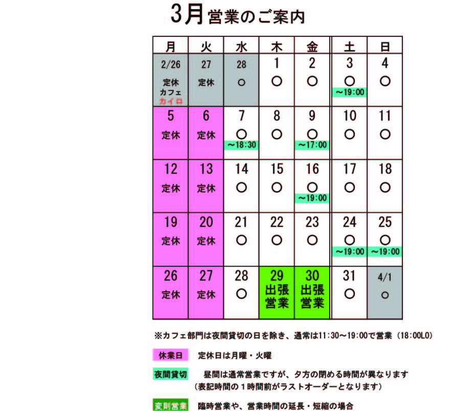 もう3月です。どんどん今年も終わっていく気分です。 昨日、今日と有報堂は大荒れです。これが春一番か?関東では昨日春一番が吹いたそうですね。いよいよ春に突入なのか。 2月28日の伊那夜の街オリエンテーリング(■■■)は、なんとか天気も持って大盛況で成功しました。ありがとうございました。ご報告はまた後日。 フローズンヨーグルトが、春バージョンになっています。 フローズンヨーグルトは、被災地応援頑張りメニュー(■■■)の一つなので、定価350円に募金分150円をのせて500円になっています。「お茶しに来たのでごはんはちょっと・・・」という方も、募金に協力できますよ。 最初はかなり凍っているので、シャキシャキした口当たりですが、溶けてくると濃厚なヨーグルトがとろりとしてクリーム状になって、これも美味しい。後味は意外とさっぱりしています。今日は、ちょっと肌寒いけど、これからの季節にはお勧めですよ。 ※3月の営業のお知らせは2/25の記事(■■■)にあります。ブログ右側の営業カレンダーもご覧下さい。 ※カイロは予約制にて営業しております。予約が埋まってしまいご希望のお時間を承れないことが増えてきましたので、お早めにお問い合わせ・ご予約をいただきますようお願いいたします。 3月の営業のお知らせです。 月・火が定休日です。 ↑↑↑ クリックすると大きくなります。 3月変則営業 29日(木)終日出張営業 30日(金)終日出張営業 貸切の予定は 3日(土)夜貸切 7日(水)18:30〜貸切(L.O.17:30) 9日(金)夜ライブ (準備のため16:00L.O. 17:00〜18:30close、18:30〜ライブのため再開) 16日(金)夜貸切 24日(土)夜貸切 25日(日)夜貸切 となっております。夜貸切の日は、通常営業は19:00までです。(いずれも通常営業の1時間前がL.Oになります) 貸切以外は通常営業をしています。 ぜひお立ち寄りください。 夜の予約営業も貸切日以外は受け付けていますので、 お気軽にお問い合わせください。 ※カイロは予約制にて営業しております。予約が埋まってしまいご希望のお時間を承れないことが増えてきましたので、お早めにお問い合わせ・ご予約をいただきますようお願いいたします。 チョコレートまつり(■■■)に合わせた季節限定メニュー、今年の新作はもう一つあります。 ラム酒の利いたちょっと大人味のチョコボール。これは有報堂では作っていません。憧れのさくらカフェ(■■■)から仕入れています。かなり美味しいよ。お値段もお手頃だから結構なペースで売れています。早くこないと売り切れてしまうかも。 ※2月の営業のお知らせは1/24の記事(■■■)にあります。ブログ右側の営業カレンダーもご覧下さい。 ※カイロは予約制にて営業しております。予約が埋まってしまいご希望のお時間を承れないことが増えてきましたので、お早めにお問い合わせ・ご予約をいただきますようお願いいたします。 チョコレートまつり(■■■)に合わせた季節限定メニュー、 通常メニューで大人気のベーグルのフレンチトースト(■■■)を変形。普段のメープルシロップをココアソースにしました。チョコレートまつりですが、メインはチョコではなくベーグル!もちもちうまうま。ココアソースとも良く合う。今食べなければ、もう来年まで食べられない。有報堂へ急げ! ※2月の営業のお知らせは1/24の記事(■■■)にあります。ブログ右側の営業カレンダーもご覧下さい。 ※カイロは予約制にて営業しております。予約が埋まってしまいご希望のお時間を承れないことが増えてきましたので、お早めにお問い合わせ・ご予約をいただきますようお願いいたします。 |