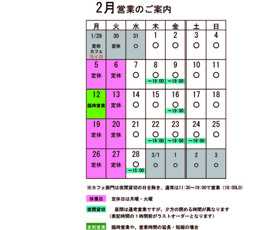 月・火が定休日ですが、祝日の関係で不規則営業になっています。 ↑↑↑ クリックすると大きくなります。 2月変則営業 12日(月)臨時営業 28日(水)15:00営業終了(伊那の夜オリのため) 貸切の予定は、 2月 8日(木)夜貸切 9日(金)夜貸切 16日(金)夜貸切 22日(木)夜貸切 23日(金)夜貸切 24日(土)夜貸切 となっております。夜貸切の日は、通常営業は19:00までです。(いずれも通常営業の1時間前がL.Oになります) 貸切以外は通常営業をしています。 ぜひお立ち寄りください。 夜の予約営業も貸切日以外は受け付けていますので、 お気軽にお問い合わせください。 ※カイロは予約制にて営業しております。予約が埋まってしまいご希望のお時間を承れないことが増えてきましたので、お早めにお問い合わせ・ご予約をいただきますようお願いいたします。 |