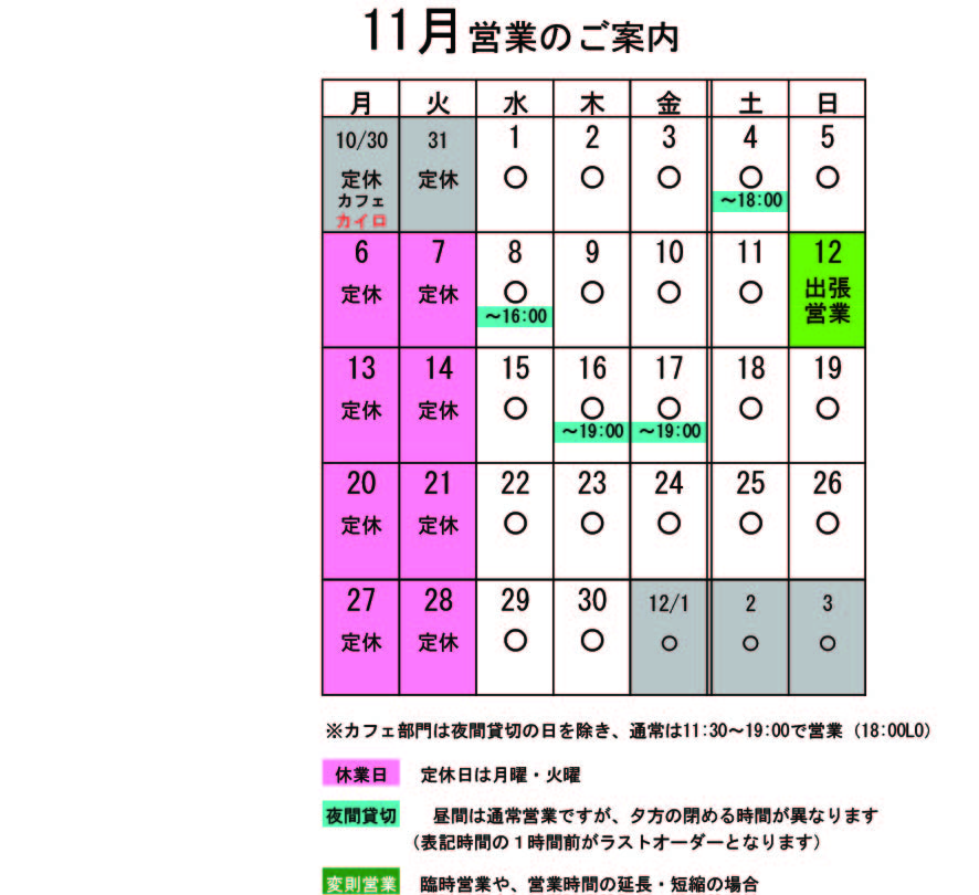 月・火が定休日です。 ↑↑↑ クリックすると大きくなります。 11月変則営業 8日(水)16:00閉店 ※駒ヶ根夜の街オリエンテーリングのため 12日(日)終日出張営業 貸切の予定は、 11月 4日(土)夜貸切 16日(木)夜貸切 17日(金)夜貸切 となっております。夜貸切の日は、通常営業は19:00までです。(いずれも通常営業の1時間前がL.Oになります) 貸切以外は通常営業をしています。 ぜひお立ち寄りください。 夜の予約営業も貸切日以外は受け付けていますので、 お気軽にお問い合わせください。 ※カイロは予約制にて営業しております。予約が埋まってしまいご希望のお時間を承れないことが増えてきましたので、お早めにお問い合わせ・ご予約をいただきますようお願いいたします。 紅玉のシーズンは、 テイクアウトもリンゴです。 も始まりました。 やっぱりアップルパイは、紅玉が美味しいね。毎日焼いても、毎日すぐに売切れる人気者。 どうしても「アップルパイを食べたい!」という方は、ご予約をお薦めします。2営業日前までにお申し込みください。2個からご予約を承ります。 この時期、ちょっとしたお使い物としても好評です。その日の在庫があればお取り置きも可能ですので、当日でも諦めずに電話をしてみてくださいね。 寒くなってきて、テイクアウトのシーズンです。毎日せっせと焼いているので、レジ横のテイクアウト商品もお見逃しなく。 ※10月の営業のお知らせは9/27の記事(■■■)にあります。ブログ右側の営業カレンダーもご覧下さい。 ※カイロは予約制にて営業しております。予約が埋まってしまいご希望のお時間を承れないことが増えてきましたので、お早めにお問い合わせ・ご予約をいただきますようお願いいたします。