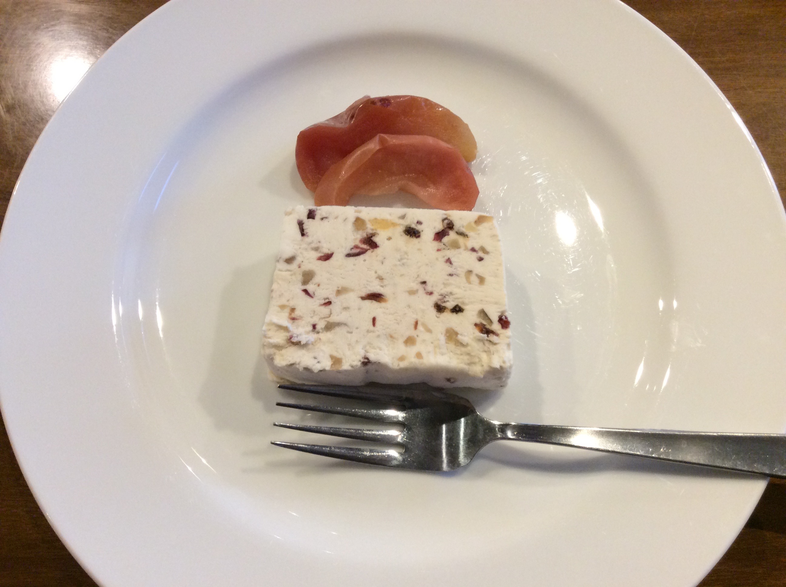 有報堂カフェのお食事予約。コース料理をご注文いただくと、当たり前ですが通常とはちょっと違ったメニューが出ます。 この間は鹿(■■■)だったけど、今回は 角煮にしてみました。有報堂には、圧力鍋はありませんが、ペチカがあるので、時間をかけて煮込んでみました。とても綺麗に処理されていたので、臭みもなく、美味しく出来上がりました。 あなたも予約でしか食べられない、特別メニューを食べてみませんか? ※12月の営業のお知らせは、11/26の記事(■■■)にあります。ブログ右側の営業カレンダーもご覧下さい。 ※カイロは予約制にて営業しております。予約が埋まってしまいご希望のお時間を承れないことが増えてきましたので、お早めにお問い合わせ・ご予約をいただきますようお願いいたします。 好評の製本教室、来月も開催します。 日 時 1月21日(土)13:00〜 参加費 2,000円(製本材料費、お茶・お菓子代込み) ※文庫・新書サイズより大きなものを製本する場合は、追加料金がかかります 持ち物 製本したい手帳や文庫本・製本に使う布・はさみ・定規 定 員 8名(定員になり次第受付終了) お申し込みは、有報堂(76-4353)まで。 1月ならこれから使う手帳の製本でもまだいけるかも。あなたもお気に入りの手帳と布を見つけてぜひご参加くださいね。 ポケットつきの布を使えば、 あなたもお気に入りの本で、お気に入りの布で、自分だけの世界に一つしかない、特別な一冊を作りませんか。ご予約、お待ちしております。 ※29日まで休まず営業しています。皆さん今年最後の有報堂にぜひお越しください。 ※12月の営業のお知らせは、11/26の記事(■■■)にあります。ブログ右側の営業カレンダーもご覧下さい。 ※カイロは予約制にて営業しております。予約が埋まってしまいご希望のお時間を承れないことが増えてきましたので、お早めにお問い合わせ・ご予約をいただきますようお願いいたします。 有報堂カフェのお食事予約。コース料理をご注文いただくと、当たり前ですが通常とはちょっと違ったメニューが出ます。 先日のご予約では、 お出ししました。もの凄く大きなコロッケになってしまった… こちらは別の日にお出しした、 この時は、ジャガイモとカボチャのコロッケを一つずつでした。焼きコロッケはヘルシーな感じがしますね。有報堂のコロッケは、安心・安全・完全手作り、パン粉も有報堂のパンを使って作っています。だから大きくなってしまうのか… 今回の後半のご予約は、コース全部を野菜でというご要望だったので、コロッケにはお肉は入っていません。そんなこともできますよ。 あなたも予約でしか食べられない、特別メニューを食べてみませんか? ※今日から29日まで休まず営業になります。皆さん今年最後の有報堂にぜひお越しください。 ※12月の営業のお知らせは、11/26の記事(■■■)にあります。ブログ右側の営業カレンダーもご覧下さい。 ※カイロは予約制にて営業しております。予約が埋まってしまいご希望のお時間を承れないことが増えてきましたので、お早めにお問い合わせ・ご予約をいただきますようお願いいたします。 先日の製本教室(■■■)のお茶は、 でしたよ。セミフレッドは、イタリア料理で出される、アイスクリームのケーキのようなデザートのことです。セミ(半分)フレッド(冷たい)という意味だとか。 ナッツ、ドライフルーツがたくさん入って甘さはちょっと控えめ。洋酒が入って、ちょっと大人の味です。ケーキのように少しずつ切って食べるのも、ちょっと豪華な気分に浸れます。有報堂の予約では人気のスイーツです。 製本教室全部の代金2,000円で、お茶菓子も結構豪華。これはかなりお得です。 あなたもいつもと違ったスイーツを食べに、製本教室に参加しませんか。 ※12月の営業のお知らせは、11/26の記事(■■■)にあります。ブログ右側の営業カレンダーもご覧下さい。 ※カイロは予約制にて営業しております。予約が埋まってしまいご希望のお時間を承れないことが増えてきましたので、お早めにお問い合わせ・ご予約をいただきますようお願いいたします。