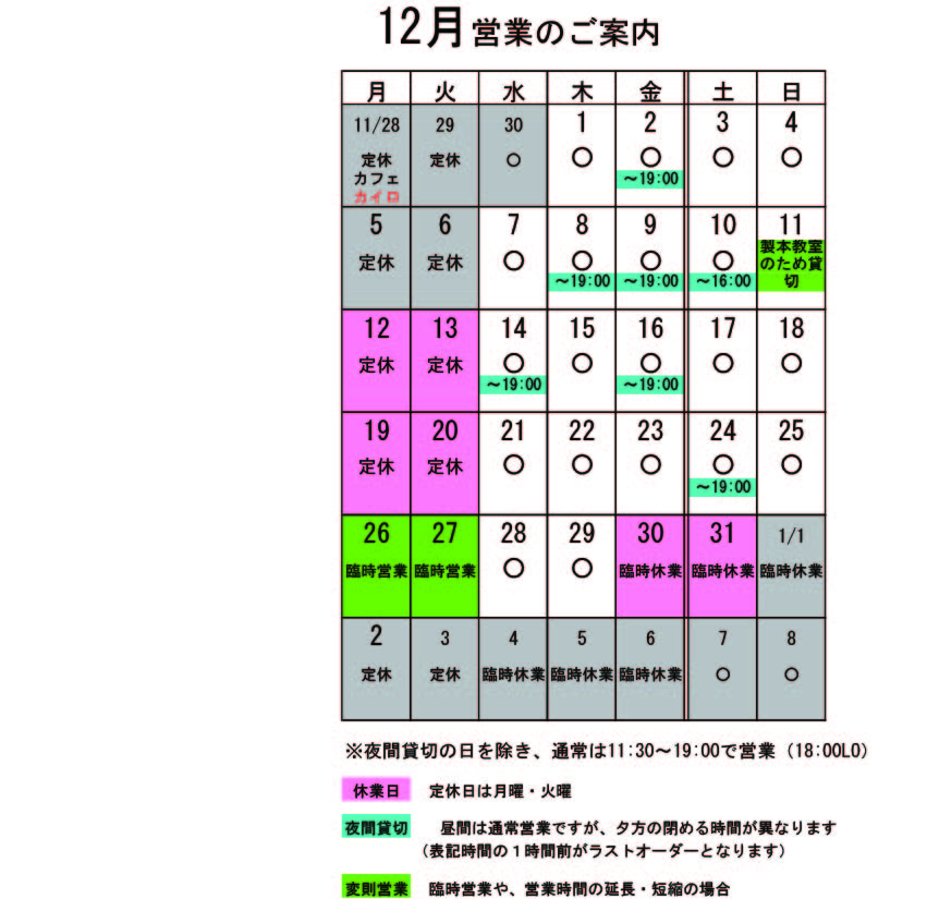 月・火が定休日ですが、祝日や年末年始の関係で不規則営業になっています。 ↑↑↑ クリックすると大きくなります。 12月〜1月変則営業 12月 26(月)・27日(火)臨時営業 ※年末年始休みは、12/30〜1/6です。年末年始を健やかに過ごしたい方は、カイロの予約をお早めに。 貸切の予定は、 12月 2日(金)夜貸切 8日(木)夜貸切 16:00~出張営業 9日(金)夜貸切 10日(土)夜ライブ「歌とギターとぬくもりと。」(■■■) (準備のため15:00L.O. 16:00〜18:30close、18:30〜ライブのため再開) 11日(日)製本教室のため終日貸切(■■■) 14日(水)夜貸切 16日(金)夜貸切 24日(土)夜貸切 となっております。 夜貸切の日は、通常営業は19:00までです。(いずれも通常営業の1時間前がL.Oになります) さすがに一年で一番忙しい12月です。おかげさまで貸切や予約が入り始めています。貸切ではなくても予約が入っている場合がありますので、有報堂で忘年会がやりたい!という方は、早めにお問い合わせ下さい。お昼に予約したい!という方も大歓迎です。(お昼から飲めるならそれもいいですよね) 貸切以外は通常営業をしています。 ぜひお立ち寄りください。 夜の予約営業も貸切日以外は受け付けていますので、 お気軽にお問い合わせください。 ※カイロは予約制にて営業しております。予約が埋まってしまいご希望のお時間を承れないことが増えてきましたので、お早めにお問い合わせ・ご予約をいただきますようお願いいたします。 |