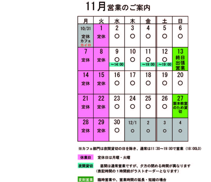 11月の営業のお知らせです。 月・火が定休日です。 ↑↑↑ クリックすると大きくなります。 11月変則営業 9日(水)14:00閉店 ※駒ヶ根夜の街オリエンテーリングのため(■■■) 13日(日)終日出張営業 貸切の予定は、 11月 8日(土)夜貸切 11日(金)夜貸切 12日(土)夜貸切 となっております。夜貸切の日は、通常営業は19:00までです。(いずれも通常営業の1時間前がL.Oになります) 貸切以外は通常営業をしています。 ぜひお立ち寄りください。 夜の予約営業も貸切日以外は受け付けていますので、 お気軽にお問い合わせください。 ※カイロは予約制にて営業しております。予約が埋まってしまいご希望のお時間を承れないことが増えてきましたので、お早めにお問い合わせ・ご予約をいただきますようお願いいたします。 ドリンクも秋冬バージョンに変わっています。 毎年激しいデッドヒートを繰り広げるドリンク秋冬の陣。昨年まさかの伏兵に敗れたものの人気は相変わらず高いのが、 4種類の香辛料が利いていて、とってもスパイシー!かなり有報堂っぽい健康的な飲み物です。チャイにしては珍しく、最初から砂糖を入れていないので甘さが調節できます。スパイシーで暖まる飲み物です。これで体の芯から温まってください。ペチカの前で飲むのがお勧めなのですが、今年はまだまだ日中は暑くてペチカをつけていないのです。しばらくお待ちください。 ※10月の営業のお知らせは、9/23の記事(■■■)にあります。ブログ右側の営業カレンダーもご覧下さい。 ※カイロは予約制にて営業しております。予約が埋まってしまいご希望のお時間を承れないことが増えてきましたので、お早めにお問い合わせ・ご予約をいただきますようお願いいたします。