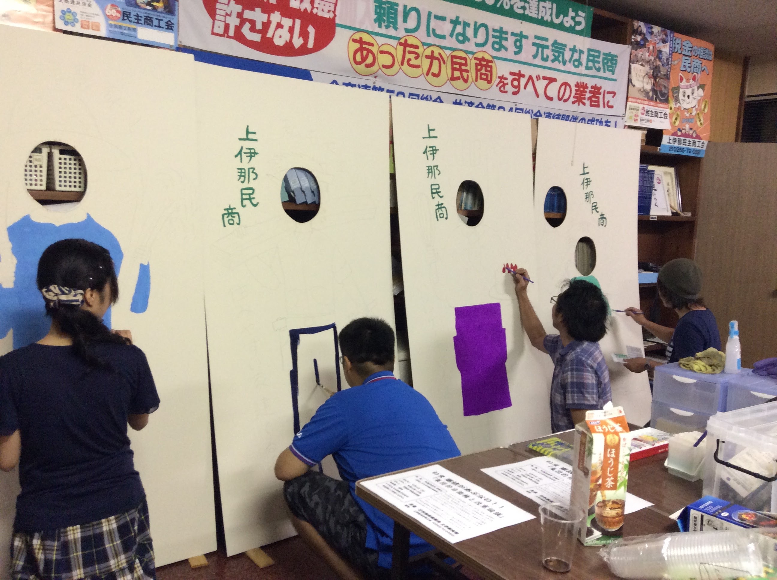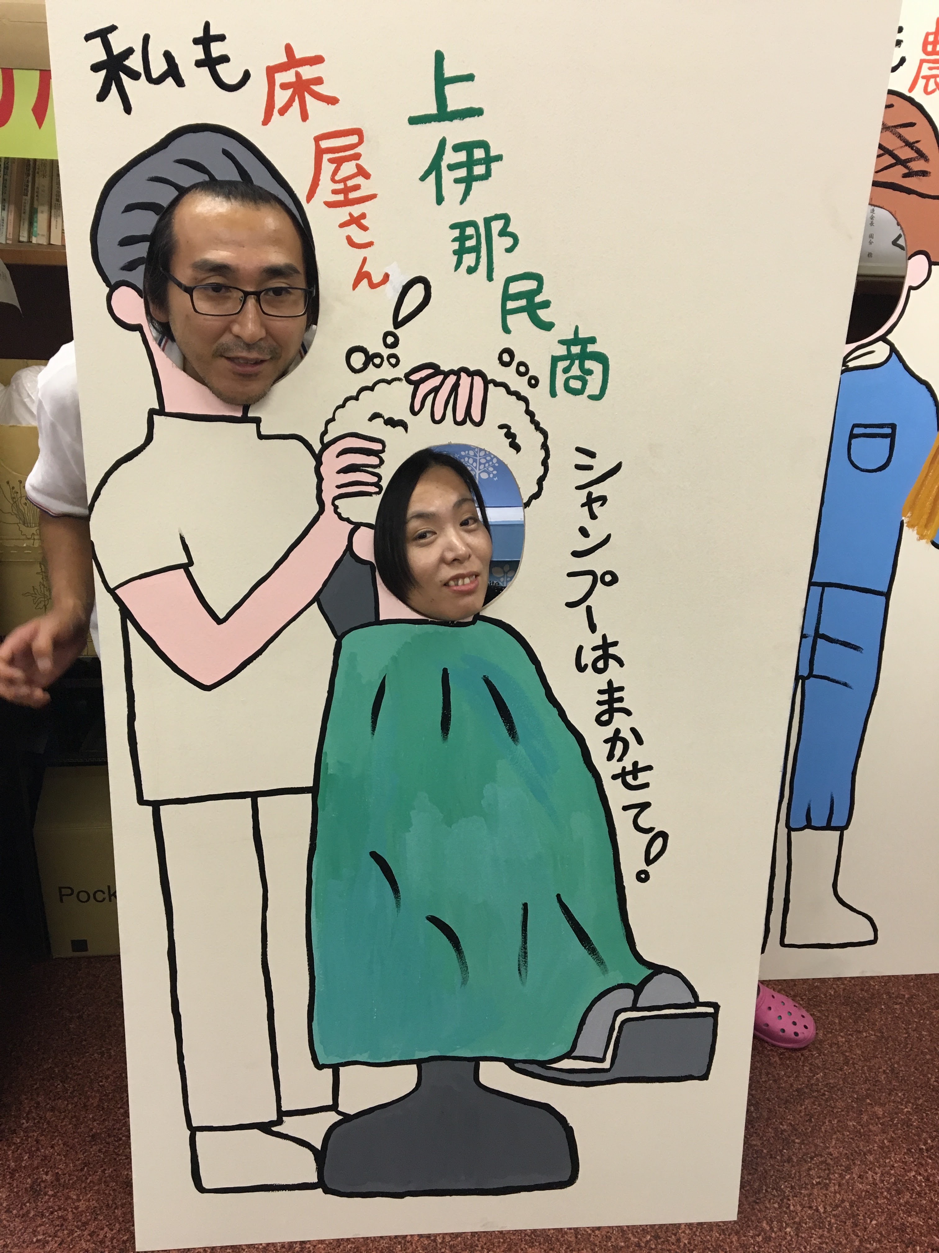 今流行りの顔はめ看板!上伊那民商バージョンを作ってみました。4枚も。 もちろん全部愉快な仲間たちと作りましたよ。 ベニヤの塗装は、塗装屋さん。 顔はめる穴を 作ったのは、大工さん。 看板全体の色塗りは、 有報堂Aは、アイディアを出して指図するだけでした…(−_−;) 完成したので、みんなで パティシエ、大工、床屋、農家の顔はめ看板です。 床屋は、 商工フェア会場でも、割と皆さん顔をはめていました。良かった。良かった。毎年1枚増やしたい希望。 顔はめ看板はSNSの普及で、再び流行り始めているというニュースを見て、上伊那民商の宣伝に作ってみました。皆さん折角撮った写真は、ぜひSNSにアップしてくださいね。 ※8月の営業のお知らせは、7/27の記事(@営業のお知らせ)にあります。ブログ右側の営業カレンダーもご覧下さい。 ※カイロは予約制にて営業しております。予約が埋まってしまいご希望のお時間を承れないことが増えてきましたので、お早めにお問い合わせ・ご予約をいただきますようお願いいたします。