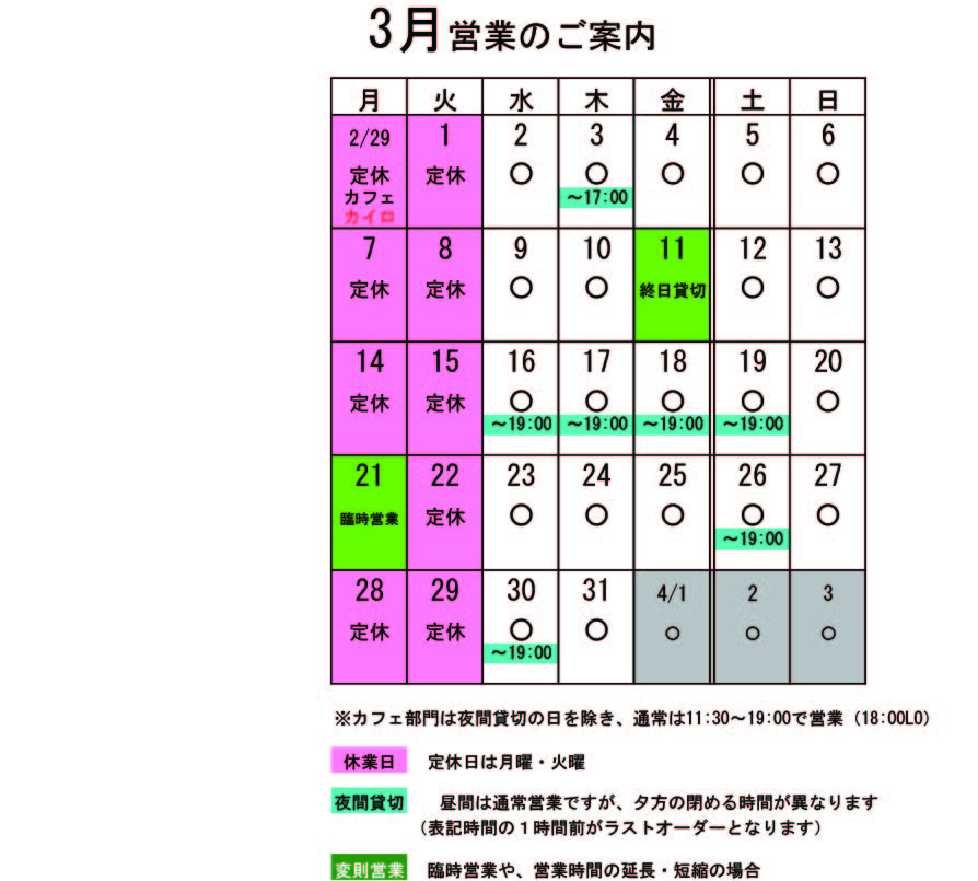 唐突に新メニュー。 有報堂自家製パンに、ピザで人気のチーズをトッピング。それに胡椒をパラリ。それだけ。それだけだけど、美味い。 小腹がすいたときにお一ついかが。 ※3月の営業のお知らせは、2/25(■■■)の記事にあります。ブログ右側の営業カレンダーもご覧下さい。 ※カイロは予約制にて営業しております。予約が埋まってしまいご希望のお時間を承れないことが増えてきましたので、お早めにお問い合わせ・ご予約をいただきますようお願いいたします。 3月の営業のお知らせです。 月・火が定休日ですが、祝日の関係で不規則営業になっています。 ↑↑↑ クリックすると大きくなります。 3月変則営業 2日(水)17:00閉店(L.O.16:00) ※伊那夜の街オリエンテーリングのため(■■■) 11日(金)予約のため終日貸切 21日(月)祝日のため臨時営業 ※ブログのカレンダーの一番下の赤字が、カイロの予定です。その上の黒字はカフェの予定です。 貸切の予定は、 3月 16日(水)夜貸切 17日(木)夜貸切 18日(金)夜貸切 19日(土)夜貸切 26日(土)夜貸切 30日(水)夜貸切 となっております。夜貸切の日は、通常営業は19:00までです。(いずれも通常営業の1時間前がL.Oになります) 貸切以外は通常営業をしています。 ぜひお立ち寄りください。 夜の予約営業も貸切日以外は受け付けていますので、 お気軽にお問い合わせください。 ※カイロは予約制にて営業しております。予約が埋まってしまいご希望のお時間を承れないことが増えてきましたので、お早めにお問い合わせ・ご予約をいただきますようお願いいたします。