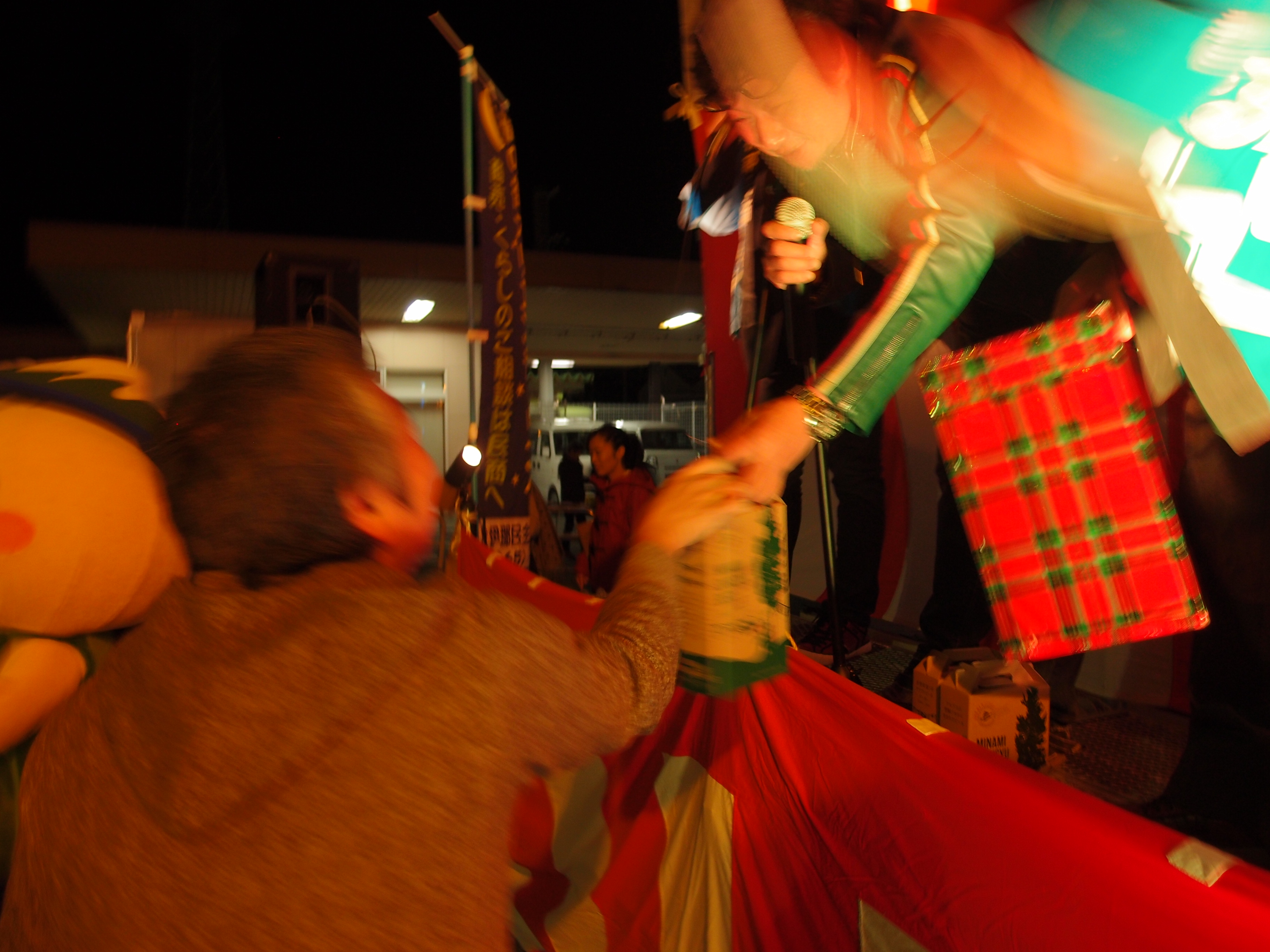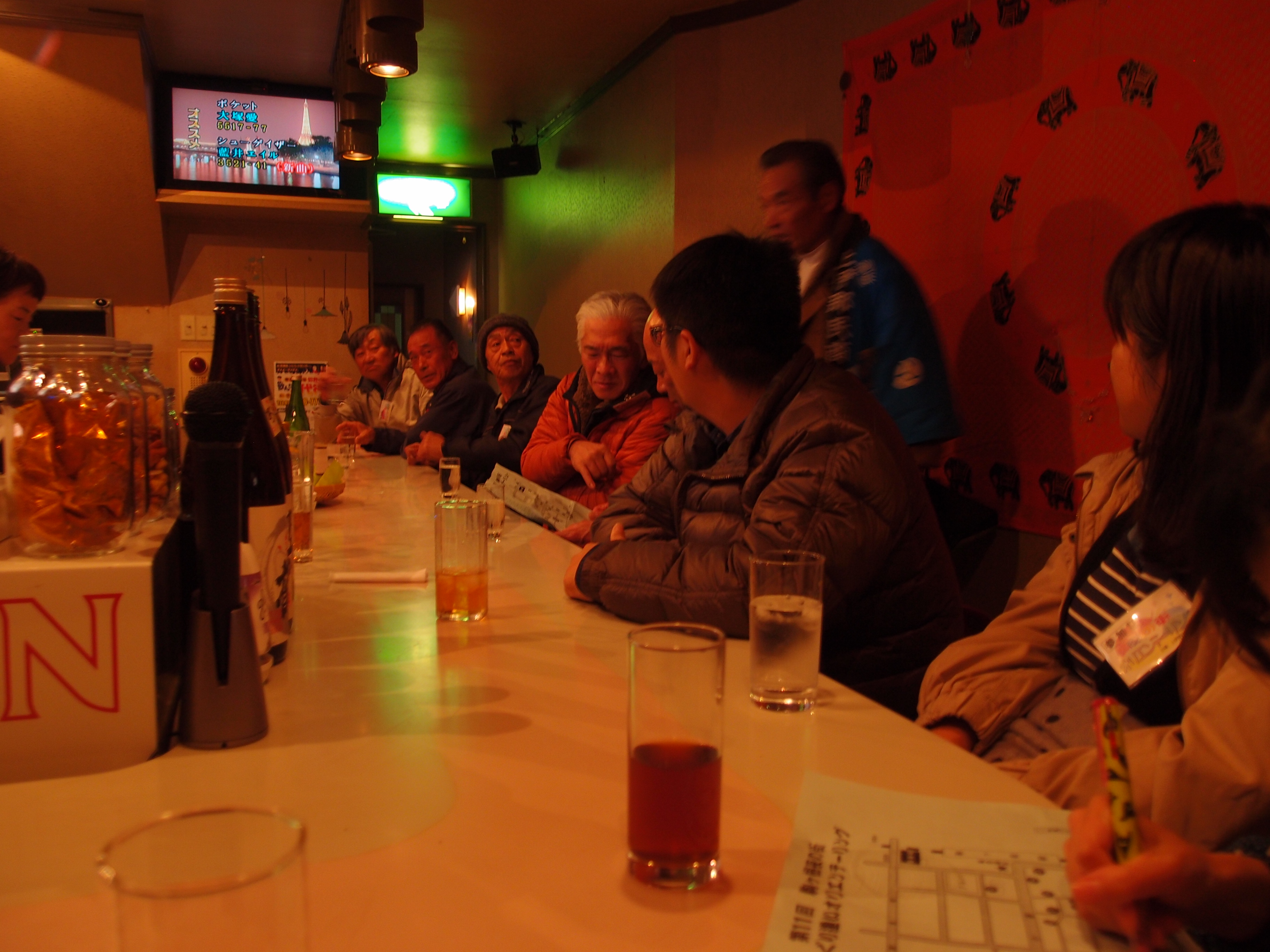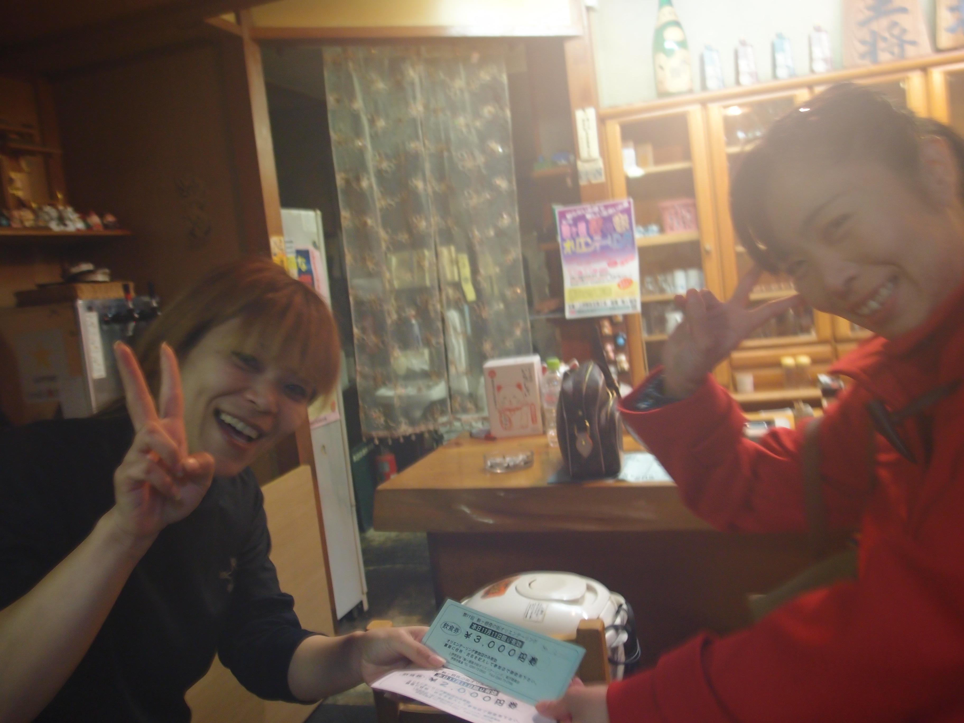 飲み歩き♪駒ヶ根夜の街オリエンテーリングだよ。寒いけど気にしない。 今年も有報堂スタッフは、愉快な仲間たちと一緒に準備から頑張っています。 今年のスタート前カウントダウンは、市長代理 がやりました。まだ5歳なので、お酒は飲めません。今年は子供だましだなんて言わないよ。 有報堂Aは、愉快な仲間のYさん、Mさん、そして読者のKさん、Hさんと今回は回りました。 1件目は、 居酒屋です。1品は 美味しいよ。「2次会ここでもいいなあ」とみんなで話しています。有報堂Aは、いつものように最初から日本酒を飲んでいます。 このお店の女将は、この11月から代替わりしていたのですが、何とMさんの同級生!早速みんなで民商の勧誘をしました。愉快な仲間になってくれるといいな。 2件目は、 地図が間違っていてみんなで右往左往してしまった…実行委員会の反省会できちんと言わなければ。ここでの1品はスパゲティ、有報堂Aはお酒はウイスキーロックを頼んでいます。 3件目は、 ここもスナック。1品はポテトチップスだったけど、夜オリの枠内で3杯飲ませてくれた。嬉しい。有報堂Aは、ブランデーとウイスキー2杯で3杯飲みきりました。貧乏性です。 ここでは、みんな それにしてもお店の中が暗い。 4件目は、味香月。居酒屋です。1品は つくねとねぎ間とハツ、3種類も出してくれました。お酒はビール1択だったので、他は追加注文。有報堂Aは、ビールも飲みましたが、珈琲酒を追加で注文しました。ちょっと甘くて失敗… 最後のお店は、駒ヶ根駅のすぐ側だったので、ぎりぎりまでゆっくりできました。 駒ヶ根駅前に戻ると いよいよ 今年も抽選会では、夜オリ参加店で当日限り使用できる「飲食券」が当たります。総額10万円。3等は3000円で20本、2等は5000円で6本、1等は10,000円です。 飲食券の前に、キリンビール賞と南信州ビール賞の抽選です。 ビールが当たって 「本命は飲食券だから当たらなくても良い」と強がっている人まで大騒ぎ。 いよいよ本命の飲食券の抽選が始まるよ〜。3等は、お客さんが引きます。みんな自分の番号を当てたくて念を送っていますが、うまくいきません。 呼ばれた番号の人がいなければ、もう1回抽選です。急いで舞台にいかなければ、すぐ次の番号が呼ばれてしまいます。みんな走り回っています。 2等は、6本。4番目に「474番」が呼ばれます。 「キャー\(^O^)/」きました!!有報堂一くじ運の強い、有報堂Aが2年ぶりに5000円券ゲット!! スタッフで動き回っていた有報堂Aに替わって、Kさんが取りに行ってくれました。「これで2次会だ!!」 片付けを終わらせて、他の人より随分遅くにMさんのお友達のお店王将に向かいます。もう電気が消えている。中に入ってみると帰るところでしたが、またお店を開けてくれました。ありがとうございます。 渡して貰いました。 飲んだり、食べたり、情報交換したり、大盛り上がり、大忙しの二次会でした。 ご参加いただいた皆さまありがとうございました。忘年会、新年会の候補のお店は見つかりましたか。 次は伊那です。(予定は3月)皆さんのご参加をお待ちしております。 ※11月の営業のお知らせは、10/29の記事(■■■)にあります。ブログ右側の営業カレンダーもご覧下さい。 ※カイロは予約制にて営業しております。予約が埋まってしまいご希望のお時間を承れないことが増えてきましたので、お早めにお問い合わせ・ご予約をいただきますようお願いいたします。 |