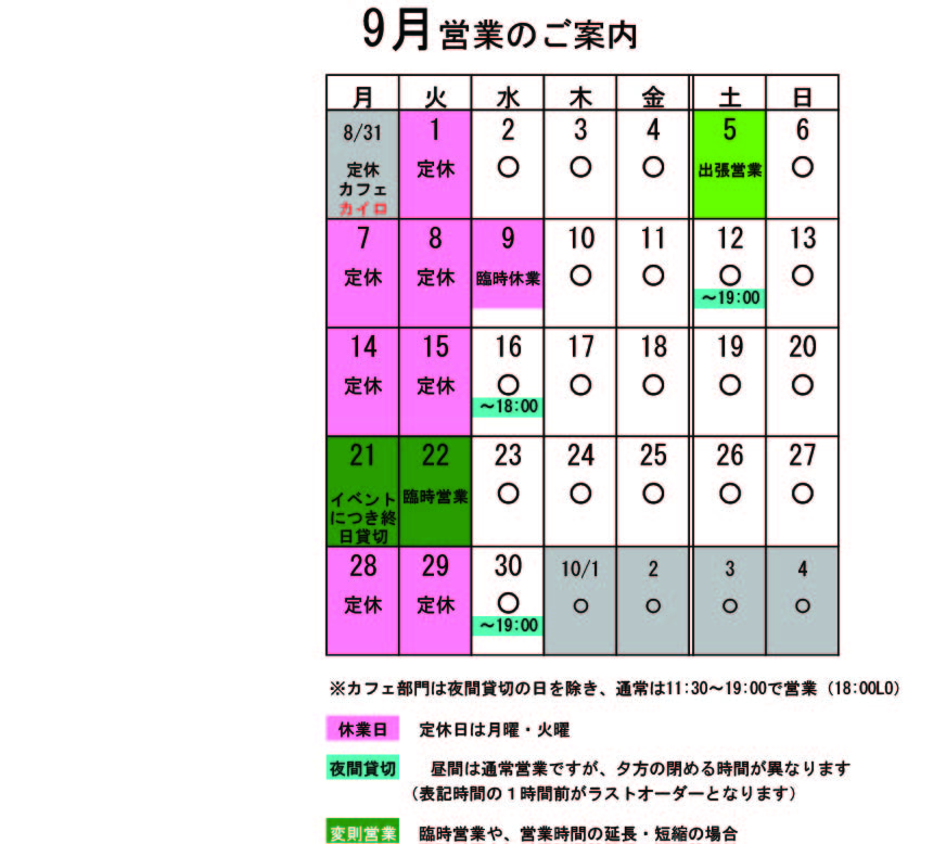 9月の営業のお知らせです。 月・火が定休日ですが、連休の関係で不規則営業になっています。 ↑↑↑ クリックすると大きくなります。 9月変則営業 5日(土)終日出張営業 9日(水)カフェ臨時休業 21日(月)祝日のため臨時営業 イベントのため終日貸切 22日(火)祝日のため臨時営業 ※ブログのカレンダーの一番下の赤字が、カイロの予定です。その上の黒字はカフェの予定です。 貸切の予定は、 9月 12日(土)夜貸切 16日(水)18:00~貸切(L.O.17:00) 11日(土)夜貸切 30日(水)夜貸切 となっております。夜貸切の日は、通常営業は19:00までです。(いずれも通常営業の1時間前がL.Oになります) 貸切以外は通常営業をしています。 ぜひお立ち寄りください。 夜の予約営業も貸切日以外は受け付けていますので、 お気軽にお問い合わせください。 ※10月は土日のほとんどが、出張営業か貸切の予定が入っています。土日しか有報堂に来れないようという あなた!9月中にぜひお越しくださいね。 ※カイロは予約制にて営業しております。予約が埋まってしまいご希望のお時間を承れないことが増えてきましたので、お早めにお問い合わせ・ご予約をいただきますようお願いいたします。