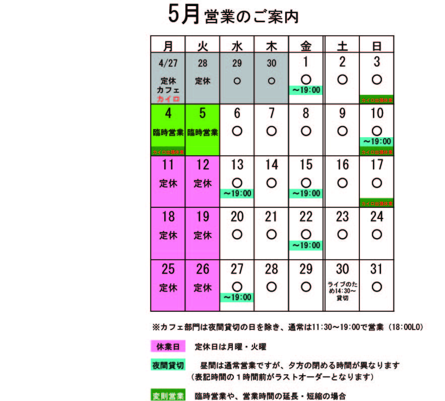 皆さんのお越しを心よりお待ちしております。予約や貸切もありますので、予めお電話で確認いただけると幸いです。 さて、その黄金週間には、先日紹介したように(■■■)特別メニューもやっています。 スイーツも特別メニューがあります。 安心安全のファットスプレッドとあんこ。甘しょっぱいのバランスが美味い! さああなたもゴールデンウィーク特別メニューを召し上がれ。 限定定食もやっているのですが、毎日写真を撮り忘れています。今度こそ! ※5月の営業のお知らせは、4/24の記事(@営業のお知らせ)にあります。ブログ右側の営業カレンダーもご覧下さい。 ※カイロは予約制にて営業しております。予約が埋まってしまいご希望のお時間を承れないことが増えてきましたので、お早めにお問い合わせ・ご予約をいただきますようお願いいたします。 早い人は今日からゴールデンウィークに突入だそうですね。今日から、有報堂はゴールデンウィーク特別メニューをやりますよ。 第1弾は予約で大人気の 野菜ときのこだけのヘルシー炒飯。美味。ちょっととろみがついて、まだ肌寒いこの時期にぴったりです。 +250円で、ミニサラダ・スープセットがつけられます。 有報堂でゴールデンウィーク特別メニューを召し上がれ。 ※5月の営業のお知らせは、4/24の記事(@営業のお知らせ)にあります。ブログ右側の営業カレンダーもご覧下さい。 ※カイロは予約制にて営業しております。予約が埋まってしまいご希望のお時間を承れないことが増えてきましたので、お早めにお問い合わせ・ご予約をいただきますようお願いいたします。 5月の営業のお知らせです。 月・火は定休日ですが、G.W.の関係で営業している日もあったり色々です。 ↑↑↑ クリックすると大きくなります。 5月変則営業 3日(日)出張のためカイロ臨時休業 4日(月)祝日のため営業 (カイロは休業) 5日(火)祝日のため営業 7日(水)臨時休業(カイロは営業) 10日(日)出張のためカイロ臨時休業 17日(日)出張のためカイロ臨時休業 ※カフェ部門はゴールデンウィークは休まず営業します。ぜひご利用下さい。 貸切の予定は、 5月 1日(金)夜貸切 10日(日)夜貸切 13日(水)夜貸切 15日(金)夜貸切 22日(金)夜貸切 27日(水)夜貸切 30日(土)ライブのため貸切 (準備のため13:30L.O. 14:30〜18:00close、18:00〜ライブのため再開) となっております。夜貸切の日は、通常営業は19:00までです。 貸切以外は通常営業をしています。 ぜひお立ち寄りください。 夜の予約営業も貸切日以外は受け付けていますので、 お気軽にお問い合わせください。 ※カイロは予約制にて営業しております。予約が埋まってしまいご希望のお時間を承れないことが増えてきましたので、お早めにお問い合わせ・ご予約をいただきますようお願いいたします。 |