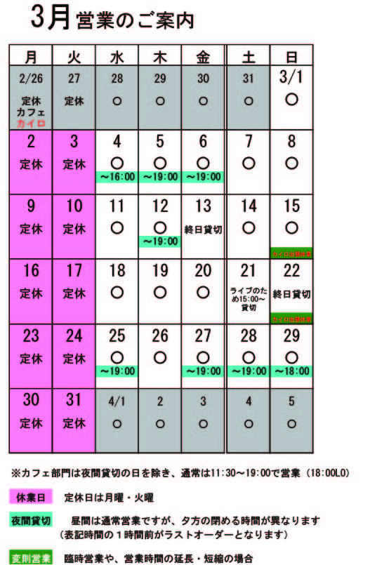 3月の営業のお知らせです。 月・火が定休日です。 ↑↑↑ クリックすると大きくなります。 3月変則営業 13日(金)予約のため終日貸切 15日(日)カイロ臨時休業(出張のため) 22日(日)カイロ臨時休業(出張のため)カフェ終日出張営業 ※ブログのカレンダーの一番下の赤字が、カイロの予定です。その上の黒字はカフェの予定です。 貸切の予定は、 3月 4日(水)16:00閉店(伊那夜の街オリエンテーリング(■■■)のため) 5日(木)夜貸切 6日(金)夜貸切 12日(水)夜貸切 13日(木)終日貸切 21日(土)ライブのため貸切 (準備のため14:30L.O. 15:30〜18:00close、18:00〜ライブのため再開) 25日(水)夜貸切 27日(金)夜貸切 28日(土)夜貸切 29日(日)18:00〜貸切(L.O.17:00) となっております。夜貸切の日は、通常営業は19:00までです。(いずれも通常営業の1時間前がL.Oになります) 貸切以外は通常営業をしています。 ぜひお立ち寄りください。 夜の予約営業も貸切日以外は受け付けていますので、 お気軽にお問い合わせください。 ※〜3/8まではチョコレートまつり♪(■■■)さあ君もスタンプラリーに挑戦だ〜!! ※ギフト用生チョコ(■■■)は〜3/22(日)までご予約承ります♪ 2月1日の信州炎上Ⅱ(■■■)で、新たなテイクアウトメニューがお目見えしていたのです。 ずっと有報堂Aが作りたいと思っていながら、作っていなかったピタパンがついに・・・ 簡単レシピです。自家製なので、有機煎りごまもたくさんいれて、抜群の美味しさです。中身の具もこれからどんどん試作予定。今年のイベントや出張営業は、これで稼ぎます。「こんなピタパンサンド作って」 というご要望もお受けしますよ。 ※2月の営業のお知らせは、1/30の記事(■■■)にあります。ブログ右側の営業カレンダーもご覧下さい。 ※カイロは予約制にて営業しております。予約が埋まってしまいご希望のお時間を承れないことが増えてきましたので、お早めにお問い合わせ・ご予約をいただきますようお願いいたします。 チョコレートまつり(■■■)に合わせた季節限定メニュー、今年の新作は、 通常メニューで大人気のベーグルのフレンチトースト(■■■)を変形。普段のメープルシロップをココアソースにしました。チョコレートまつりですが、メインはチョコではなくベーグル!もちもちうまうま。ココアソースとも良く合う。今食べなければ、もう来年まで食べられない。有報堂へ急げ! ※2月の営業のお知らせは、1/30の記事(■■■)にあります。ブログ右側の営業カレンダーもご覧下さい。 ※カイロは予約制にて営業しております。予約が埋まってしまいご希望のお時間を承れないことが増えてきましたので、お早めにお問い合わせ・ご予約をいただきますようお願いいたします。 チョコレートまつり(■■■)に合わせた季節限定メニュー、 に焼くのが非常に難しいのです。いつもどきどきしながら焼いています。お客さんに出す前に割って調べるわけにもいかず、いったいどうなっているのか・・・・・・お客さんが満足そうに帰って行くとほっとします。 小さめなので、2、3口で食べてしまう方もいれば、ちょっとずつちょっとずつ削るように食べる方もます。ぜひ温かいうちに召し上がってくださいね。ご希望の方には!プラス100円でバニラアイスも添えることができます。最強です。美味しいよ。 ※2月の営業のお知らせは、1/30の記事(■■■)にあります。ブログ右側の営業カレンダーもご覧下さい。 ※カイロは予約制にて営業しております。予約が埋まってしまいご希望のお時間を承れないことが増えてきましたので、お早めにお問い合わせ・ご予約をいただきますようお願いいたします。 チョコレートまつり(■■■)に合わせた季節限定メニュー、 ボリュームたっぷりのモッフル。食事の後のちょっとしたスイーツ♪ にはなりません・・・ほぼ食事です。何せお餅2個分ですから。「私は、お餅2個なら食事にはならないけどね」と有報堂Aがつぶやいています。チョコレートまつりに参戦する皆さんは、戦略を持って挑まないと返り討ちに・・・お腹がすいているときにお召し上がりください。 モッフルチョコレートは、何と言っても上にのっているチョコレートアイスが美味!!このチョコレートアイスは、この時期だけ、チョコレートまつりのときにしか食べられません。コース料理でもチョコレートアイスがでることはない。本当にこの時期だけのスペシャルアイス。濃厚なアイスをモッフルにからめてどうぞ。それでもご要望があれば、チョコレートアイスもお作りしますけどね。 ※2月の営業のお知らせは、1/30の記事(■■■)にあります。ブログ右側の営業カレンダーもご覧下さい。 ※カイロは予約制にて営業しております。予約が埋まってしまいご希望のお時間を承れないことが増えてきましたので、お早めにお問い合わせ・ご予約をいただきますようお願いいたします。 |