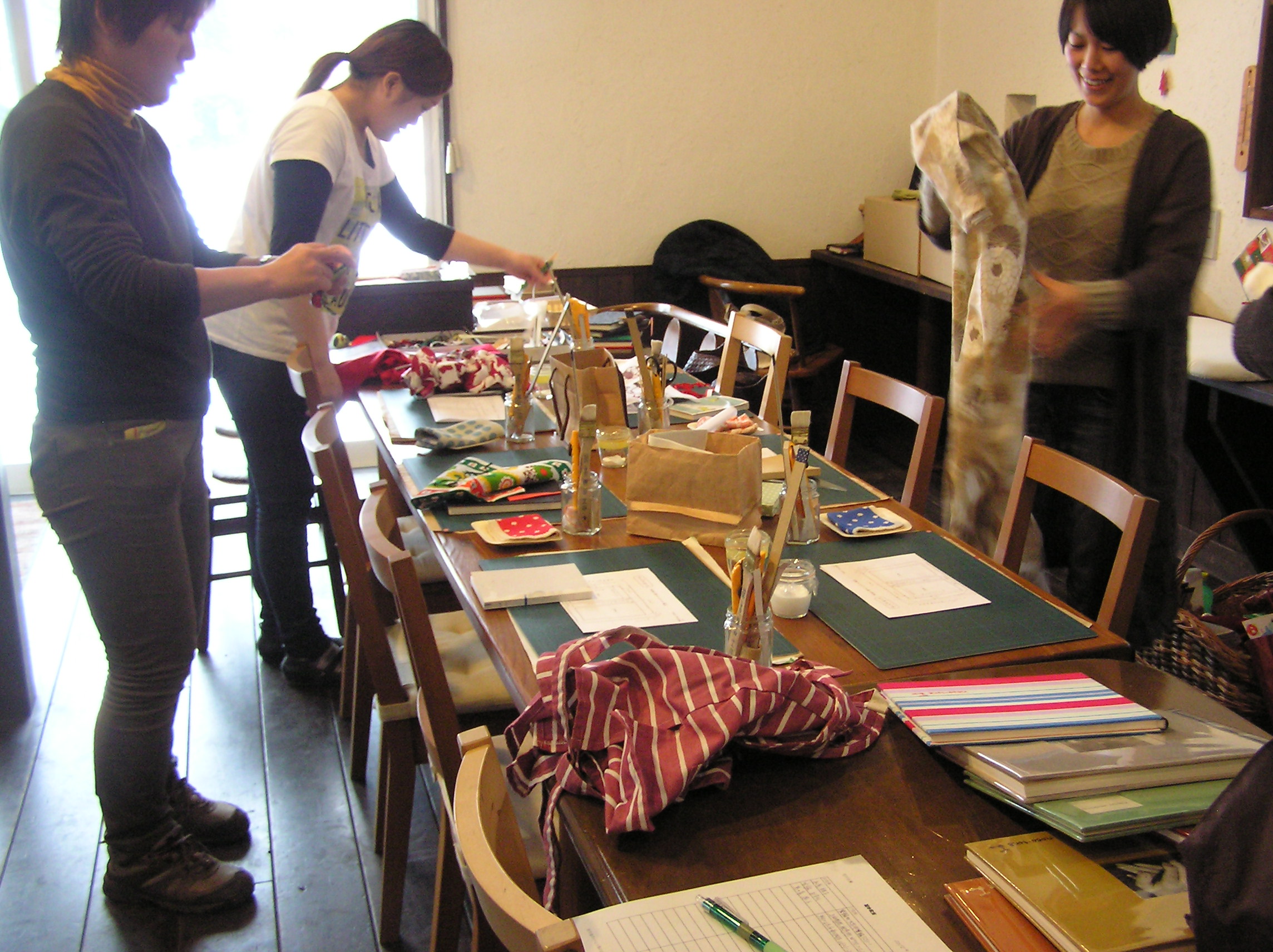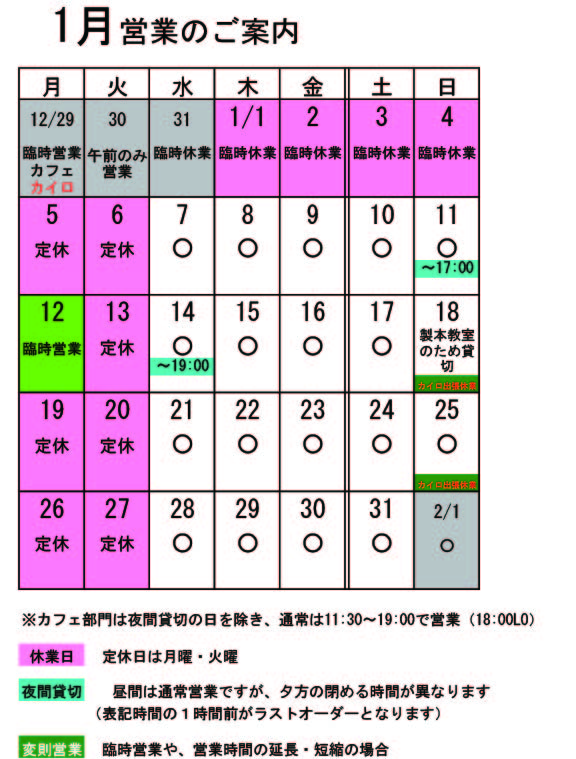 1月の営業のお知らせです。 月・火が定休日ですが、年末年始やハッピーマンデーの関係で不規則営業になっています。 ↑↑↑ クリックすると大きくなります。 1月変則営業 ※年始休業は1/1〜1/4。定休日もいれて、12/30pm〜1/6までお休みです。(カイロは7日までお休みです) 12日(月・祝)祝日のため臨時営業 18日(日)カイロ臨時休業(出張のため) 25日(日)カイロ臨時休業(出張のため) 貸切の予定は、 1月 11日(日)17:00〜貸切 14日(水)夜貸切 18日(日)製本教室のため終日貸切 となっております。夜貸切の日は、通常営業は19:00までです。(いずれも通常営業の1時間前がL.Oになります) 貸切以外は通常営業をしています。 夜の予約営業も貸切日以外は受け付けております。 お気軽にお問い合わせください。 ※12/26日(金)・27日(土)夜貸切となります。あらかじめご了承ください。年内は30日(火)午前まで休まず営業しておりますので、ぜひお越しください。 その他の12月の営業のお知らせは、11/27の記事(@営業のお知らせ)にあります。ブログ右側の営業カレンダーもご覧下さい。 ※カイロは予約制にて営業しております。予約が埋まってしまいご希望のお時間を承れないことが増えてきましたので、お早めにお問い合わせ・ご予約をいただきますようお願いいたします。 20日の製本教室、まずはいつものように 選びます。 シーズンだけに、手帳を製本する人が多かったですよ。 Mさんは、 Nさんは、チェックのエプロン、Mさんは手ぬぐいを使います。(写真を撮り忘れました) 有報堂Bは、得意の 有報堂Aは、またまた2冊製本します。 選びました。 今回は、初参加の方が多かったのですが、皆さんとても Mさんの 豆絞りが格好良い。 もう一人のMさんの 初めての製本でしたが、柄が思ったところに上手くきています。 Nさんの エプロンとは思えない、赤白のチェックが素敵です。 有報堂Aの 昨年の反省を活かし(■■■)、今年は手帳の開きを間違えなかったので、思い通りのところに模様がきました。こんな柄誰も着ないよと思うような洋服が、製本するととても良い味出しています。大胆な柄も格好良くきまります。皆さんも、タンスの肥やしになっている洋服で製本してみませんか? 初参加の方たちは、想像以上に上手にできたので、テンションが上がって「またやりたい!」と大興奮しているので、来月も製本教室を開くことに決まりました。1月18日(日)です。また詳細はブログにてお知らせします。 ハードカーバー製本の工程は、2013年2月17日〜2/28の記事を読んでね。 あなたも世界で一つだけの本を作りませんか。 ※今日も営業しています。30日午前中まで休まず営業中!ぜひお茶にお越しください。 ※12月の営業のお知らせは、11/27の記事(■■■)にあります。ブログ右側の営業カレンダーもご覧下さい。 ※カイロは予約制にて営業しております。予約が埋まってしまいご希望のお時間を承れないことが増えてきましたので、お早めにお問い合わせ・ご予約をいただきますようお願いいたします。 先週の土曜日は、お久しぶりの製本教室。 久しぶりに、無事お茶の写真も撮れましたよ。 今回のスイーツは、 製本教室では、製本にかけてクレープを良くお出ししています。 クレープの中には紅玉のコンポート、クレープの上には紅玉とバニラアイスとヨーグルトアイスをトッピング。盛り盛りクレープ。美味しいよ〜。 製本教室は、いつもとは違ったスイーツやご飯が食べられます。あなたもぜひご参加ください。次回は1月18日(日)に決まりましたよ。 ※今日も明日も営業しています。30日午前中まで休まず営業中!ぜひお茶にお越しください。 ※今日の夜は貸切です。その他の12月の営業のお知らせは、11/27の記事(■■■)にあります。ブログ右側の営業カレンダーもご覧下さい。 ※カイロは予約制にて営業しております。予約が埋まってしまいご希望のお時間を承れないことが増えてきましたので、お早めにお問い合わせ・ご予約をいただきますようお願いいたします。 今日も雪ですねえ。そんな時には、有報堂のペチカの前で一服ですよ。 今日のレジ横は、そんなお茶のお供にもぴったり、 来るべきチョコレートまつりに向けて、レジ横もチョコレートの気配が濃厚になってきています。 チョコレートとバナナ!!これで美味しくないわけがない。運が良ければ、チョコの塊がごろごろと・・・。ただのマフィンと侮ってはいけない。チョコレートは純チョコレート、バナナは無農薬バナナを使用。こんなに豪華なマフィンは有報堂でなければ、食べられない。 そのままでもふんわり柔らか。ちょっと温めても美味しいですよ。特に牛乳とよくあいます。おやつに、朝食に、ホットミルクやカフェオレと一緒にどうぞ。 ※18日(木)・19日(金)は夜貸切となります。(L.O.18:00)20日(土)・21日(月)は終日貸切となります。ご了承ください。その他の12月の営業のお知らせは、11/27の記事(■■■)にあります。ブログ右側の営業カレンダーもご覧下さい。 ※20日(土)は