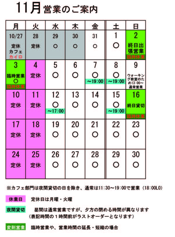 有報堂や愉快な仲間たちも所属している、上伊那民商が主催の「夜の街オリエンテーリング」の季節が今年もやってきましたよ。11月は駒ヶ根です。 「第10回駒ヶ根夜の街オリエンテーリング」 主催 上伊那民主商工会 後援 駒ヶ根市 協賛 キリンビール 日 時 11月12日(水) 18:00〜18:45受付 スタート19:00 集 合 駒ヶ根駅前広場 参加券 3,000円(当日販売は致しません) 〈ルール〉 ※当日受付でチケットと交換でコース表をもらう。 ※一斉にスタートし指定の順序でお店を回り、スタンプをもらう。 (用意されたメニュー以外は別途料金がかかります) ※午後9時までにゴールされた方の中から抽選で、参加店で当日限り使用できる総額10万円分の「飲食券」を進呈。(1万円×1本、5千円×6本、3千円×20本) 今年も駒ヶ根市の後援を頂いています。ありがとうございます。市あげての大イベントです。ぜひ皆さんもご参加ください。今年は、10回目の記念プレゼントが何かあるかも・・・ 「知らないお店で、新しい出逢いの夜」が売りの夜オリ!!この田舎町で何百人もの人が一斉に飲み歩き、食べ歩く一大イベントそれが夜オリ!!! 今まで入ったことのないお店にも、気軽に入れてお店の雰囲気を確かめられるこれが夜オリ!!新たなお店の開拓に挑戦!!です。 チケットは有報堂でも販売しています。ご希望の方は、スタッフまで声をかけてください。(コース作りの関係で、当日のチケット販売はしておりません。お早めにお買い求めください) 有報堂スタッフも早仕舞いで、参加予定です。夜の駒ヶ根で有報堂スタッフに会えるかも・・・めったにないチャンスです。駒ヶ根でお会いしましょう。 ※11月の営業のお知らせは、10/25の記事(■■■)にあります。ブログ右側の営業カレンダーもご覧下さい。 ※カイロは予約制にて営業しております。予約が埋まってしまいご希望のお時間を承れないことが増えてきましたので、お早めにお問い合わせ・ご予約をいただきますようお願いいたします。 有報堂deお抹茶始まったよ。 ではないようです。 外も それっぽく。 皆さん一服しに有報堂へお越しください。 ※11月の営業のお知らせは、10/25の記事(■■■)にあります。ブログ右側の営業カレンダーもご覧下さい。 ※カイロは予約制にて営業しております。予約が埋まってしまいご希望のお時間を承れないことが増えてきましたので、お早めにお問い合わせ・ご予約をいただきますようお願いいたします。 11月の営業のお知らせです。 月・火が定休日ですが、祝日の関係で不規則営業になっています。 ↑↑↑ クリックすると大きくなります。 11月変則営業 2日(日)出張営業のため終日貸切 2・3日(日)カイロ臨時休業(出張のため) 3日(月)祝日のため臨時営業 12日(水)17:00閉店(L.O.15:30) ※駒ヶ根夜の街オリエンテーリングのため ※ブログのカレンダーの一番下の赤字が、カイロの予定です。その上の黒字はカフェの予定です。 11月 7日(金)夜貸切 8日(土)夜貸切 15日(土)夜貸切 16日(日)終日貸切 となっております。夜貸切の日は、通常営業は19:00までです。(いずれも通常営業の1時間前がL.Oになります) 貸切以外は通常営業をしています。 ぜひお立ち寄りください。 夜の予約営業も貸切日以外は受け付けていますので、 お気軽にお問い合わせください。 ※カイロは予約制にて営業しております。予約が埋まってしまいご希望のお時間を承れないことが増えてきましたので、お早めにお問い合わせ・ご予約をいただきますようお願いいたします。