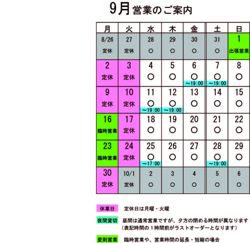 残暑が厳しすぎるけど、雨が降ったら涼しいね。 有報堂カフェのお食事予約。当たり前ですが通常とはちょっと違ったメニューが出ます。 9月になってもナスをたくさん頂きます。夏の名残か秋の走りか。 とても大きな米ナスを頂いたので、 にしました。 ご予約でお出しした米ナスのドリアです。大きな米ナスを頂いたので、ドリアにしました。ナスの中をくり抜いて、ナスとご飯とその他諸々の野菜を一緒に炒めて味付けしてナスに入れて、チーズをかけてオーブンで焼いています。ボリュームたっぷり、野菜もたっぷり。ナスのとろとろとチーズのとろとろが合うのです。少し熱いけど。まだ残暑厳しいけど、汗を流しながら召し上がれ。 ※9月の営業のお知らせは8/28の記事(■■■)にあります。ブログ右側の営業カレンダーもご覧下さい。 ※カイロは完全予約制にて営業しております。早めに電話または窓口でお問い合わせ・ご予約をいただきますようお願いいたします。 先週作った安心安全、完全手作りの きのこごはん、筑前煮、魚介春巻き、エビチリ、きゅうりピリ辛漬け、かぼちゃサラダでした。これにブルーベリーパイがついて1,700円です。 有報堂のお弁当は、野菜が多くて味付けも薄めにしているので、ヘルシーです。ご希望があれば飲み物やデザートもお付けします。 単価は1000円〜、個数は昼10個〜・夜20個〜で承ります。個数によって単価はご相談に応じます(お安くできることもあります)。有報堂のお弁当はいかがですか?お弁当は予約制です。スタッフにお気軽にお問い合わせください。 ※9月の営業のお知らせは8/28の記事(■■■)にあります。ブログ右側の営業カレンダーもご覧下さい。 ※カイロは完全予約制にて営業しております。早めに電話または窓口でお問い合わせ・ご予約をいただきますようお願いいたします。 あちらこちらで台風の被害が出ているようですね。皆さんのところは大丈夫ですか。 この辺は、山に囲まれているせいかそんなに大変なことにはなっていません。蒸し暑くなっているくらいです。そのせいかどうか分かりませんが、フロートがよく出ています。 フロートは、この間お知らせした定番(■■■)以外に、個人個人のお気に入りのカスタマイズがあります。 たとえば、 アイスティー(■■■)にバニラアイスをトッピングしました。Mさんはこれにシロップ・牛乳をつけるフルコースがお好みだそうです。激美味!だそうです。普通フロートには、シロップや牛乳は付けませんが、ご要望があればお出しします。 あなたもカスタマイズフロートはいかがですか。 カスタマイズは、お好きなドリンクとアイスの組み合わせを選べます。ドリンクの値段に200円プラスでカスタマイズフロートができます。アイスクリームは、バニラ・コーヒー・ヨーグルトが選べます。 皆さまの選んだ通りにカスタマイズしますが、あまり突飛な組み合わせを選ぶと悲しい味になります。自己責任のもとご注文ください。 ※9月の営業のお知らせは8/28の記事(■■■)にあります。ブログ右側の営業カレンダーもご覧下さい。 ※カイロは完全予約制にて営業しております。早めに電話または窓口でお問い合わせ・ご予約をいただきますようお願いいたします。 ひっそりと季節のピザが夏バージョンになっています。 和風のなすのピザ。人気者です。やはり味噌ソースが美味しいのか。ふきのとうや新玉ねぎのピザと同じソースです。上に散らしたしそもなかなか良い仕事をしています。 もう秋になりそうだけど。夏のピザを食べに有報堂へGO! ※9月の営業のお知らせは8/28の記事(■■■)にあります。ブログ右側の営業カレンダーもご覧下さい。 ※カイロは完全予約制にて営業しております。早めに電話または窓口でお問い合わせ・ご予約をいただきますようお願いいたします。 9月の営業のお知らせです。 月・火が定休日ですが、祝日の関係で不規則営業になっています。 ↑↑↑ クリックすると大きくなります。 9月変則営業 1日(日)終日出張営業 16日(月)臨時営業 23日(月)臨時営業 貸切の予定は、 9月 6日(金)夜貸切 7日(土)夜貸切 11日(水)夜貸切 12日(木)夜貸切 25日(水)17:00~貸切(16:00L.O) 28日(土)夜貸切 となっております。夜貸切の日は、通常営業は19:00までです。(いずれも通常営業の1時間前がL.Oになります) ※カイロは完全予約制にて営業しております。早めに電話または窓口でお問い合わせ・ご予約をいただきますようお願いいたします。 |