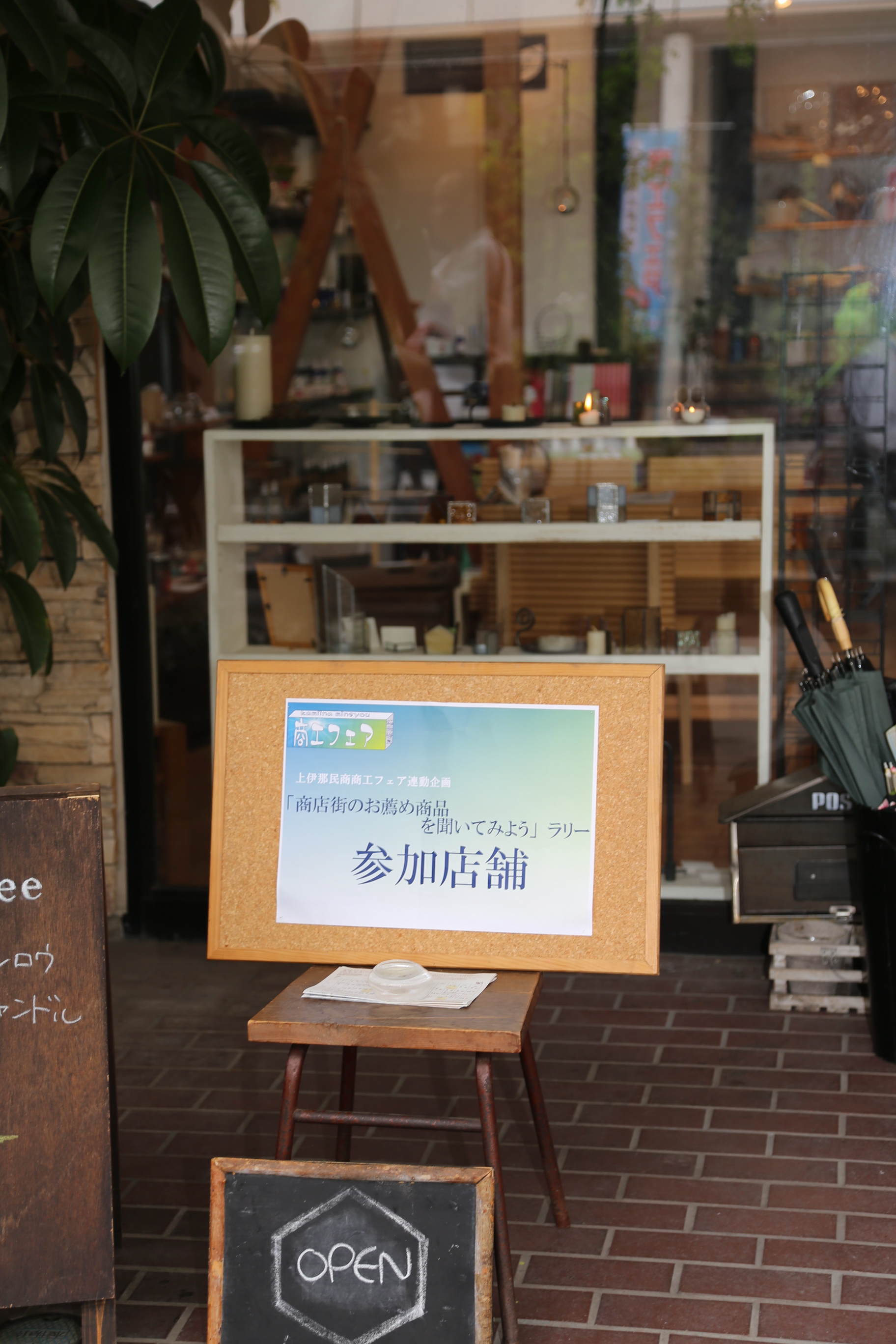 「ほっ」としています。雨でお客さんが中に入っていたことも大きかったかも。 を書いて展示しました。お薦め商品は、商店街のラリー(@商店街コラボ)と連動していました。 それぞれの仕事をしていて一番楽しい瞬間は、 有報堂カイロ「患者さんの身体が改善したとき」 有報堂カフェ「お客さんに「美味しいね」と言われたとき」 有報堂ブックス「お客さんの読みたい本がみつかったとき」 ヒーリングスペースダーチャ「好きなことを仕事にできて、好きな仕事で人の役にたてること」 山岸農場「自分の満足できる米が作れたとき」 伊那谷里山くらし研究所「イメージ通りに仕事を終えた瞬間」 大和屋農園「朝仕事のとき。綺麗な朝焼けの色や日の出を見られた時、得した気持ち」 「「おいしい〜」「とっても喜ばれたよ〜」の言葉をいただいたとき」 豆腐工房まめや「かまどの火を完璧に操れたとき」 湯澤左官「壁を塗っていて動作や鏝の動きが改善出来たとき」 矢澤建築所「自分の墨付けした木を組んだときに間違いなく綺麗に収まったとき」 T&Hサポート「教え子が運動が出来るようになったとき」 島小カフェ「お客さまからの「ありがとう」をいただいた瞬間」 b.ぱれっと「自分の中の可能性を見つけて笑顔になった時」 Waiz「施術後にお客様がうれしそうにネイルを眺めているとき」 田村建築「いちばんイメージに近い完成形ができた瞬間」 地球環境デザインMOC「スケッチやパースも描いている時も楽しいが、やはり一番は住まい手さんから満足の言葉を頂いたとき」 ・・・などでした。皆さんの仕事をしていて一番楽しい瞬間は何ですか? 明日は、皆さんのお薦め商品をご紹介します。 ※カフェは9/23(月)は祝日のため臨時営業いたします。ぜひご利用ください。その他の9月の営業のお知らせは、8/28の記事(@営業のお知らせ)にあります。ブログ右側の営業カレンダーもご覧下さい。 ※カイロは、予約制にて営業しております。予約が埋まってしまいご希望のお時間を承れないことが増えてきましたので、お早めにお問い合わせ・ご予約をいただきますようお願いいたします。 「第1回商工フェア〜これが私の生きる道〜」では、ライブもやりましたよ。 オープニングは の太鼓演奏。 続いて、 のダンス。 歌声サークル 一番雨のひどい時間帯に傘をさしながらの発表でした。ありがとうございました。来年は屋根が課題です。 有報堂でおなじみのオサカミツオ(写真を撮り忘れました。ごめんなさい)と ステージを見た方からは、どのパフォーマンスもご好評を頂きましたが、運営側の私たちは見ている時間はありませんでした。残念。 ご出演いただいた皆さんありがとうございました。また、来年もよろしくお願いします。 ※カフェは9/16(月)9/23(月)は祝日のため臨時営業いたします。ぜひご利用ください。その他の9月の営業のお知らせは、8/28の記事(@営業のお知らせ)にあります。ブログ右側の営業カレンダーもご覧下さい。 ※カイロは9/15(日)16(月)は、出張のため臨時休業とさせていただきます。何卒ご了承ください。なお、カイロは、予約制にて営業しております。予約が埋まってしまいご希望のお時間を承れないことが増えてきましたので、お早めにお問い合わせ・ご予約をいただきますようお願いいたします。 営業のお知らせ(■■■)にもありますように、22日日曜日は、出張営業です。 「Music Shower 2013」に出店します。 時間 11:00〜20:00 会場 フォレスパ木曽野外音楽堂(木曽郡大桑村) 料金 無料! 入場無料の音楽フェスです。 「森の中の心躍る音楽祭」だそうだ。 有報堂は初参加です。有報堂でライブ出演してくださっている方々が結構出演しています。そのご縁で出店させて頂くことが出来ました。ありがとうございます。 有報堂は、豚汁にホットドッグ、炊き込みごはん、ホットコーヒー、さらには焼きそばも今回はやるよ。一日がかりのイベントなので、会場で作れる料理を鋭意準備中です。新たな有報堂に会えるかも。 通常営業へのご来店を考えていた皆さま、申し訳ありません。ぜひMusicShowerの会場へおこしください。(ちょっと遠いけど) ※カフェは9/16(月)祝日のため臨時営業いたします。ぜひご利用ください。その他の9月の営業のお知らせは、8/28の記事(@営業のお知らせ)にあります。ブログ右側の営業カレンダーもご覧下さい。 ※カイロは9/14(日)15(月)は、出張のため臨時休業とさせていただきます。何卒ご了承ください。なお、カイロは、予約制にて営業しております。予約が埋まってしまいご希望のお時間を承れないことが増えてきましたので、お早めにお問い合わせ・ご予約をいただきますようお願いいたします。 「第1回商工フェア〜これが私の生きる道〜」では、商店街コラボ企画もやりましたよ。 商工フェアの目的に地域活性化を謳っている以上、やはり何かやろうということで、いなっせ周辺の商店街の皆さんとコラボです。 企画は二つ。 一つめは、「空き店舗・商店街見学ツアー