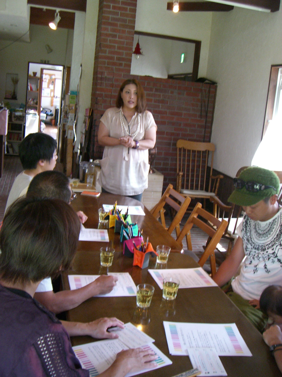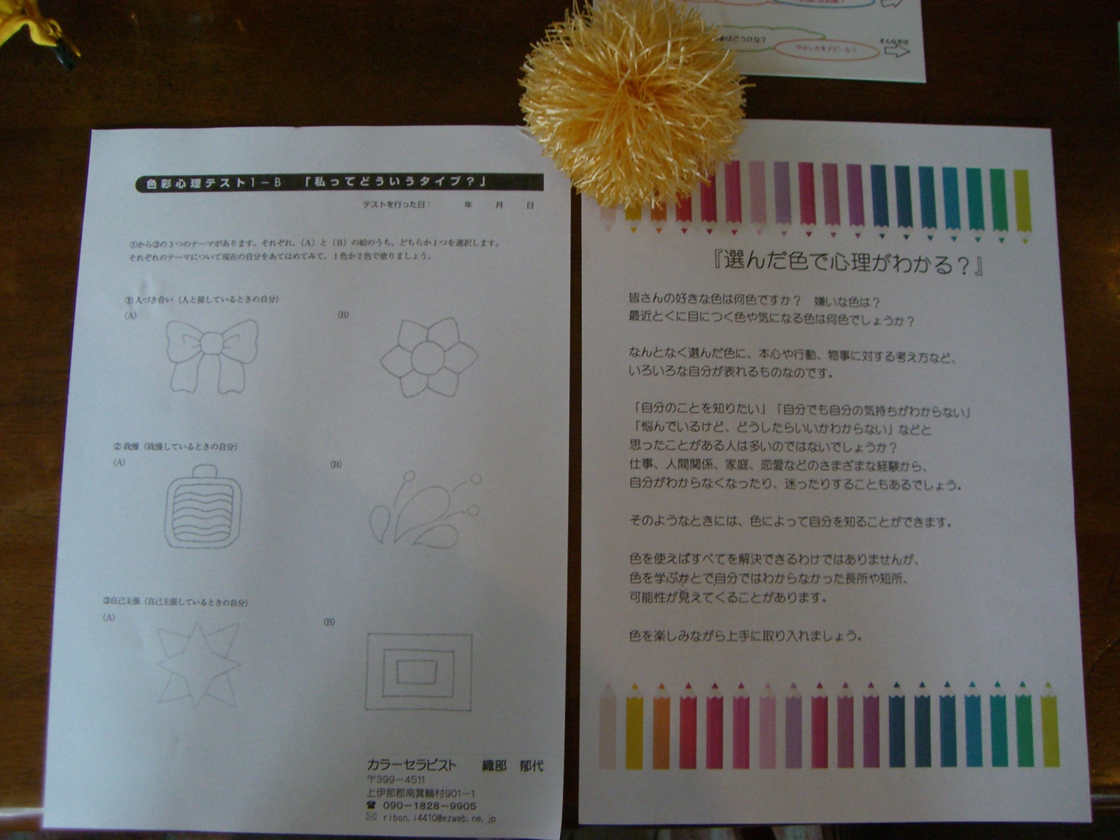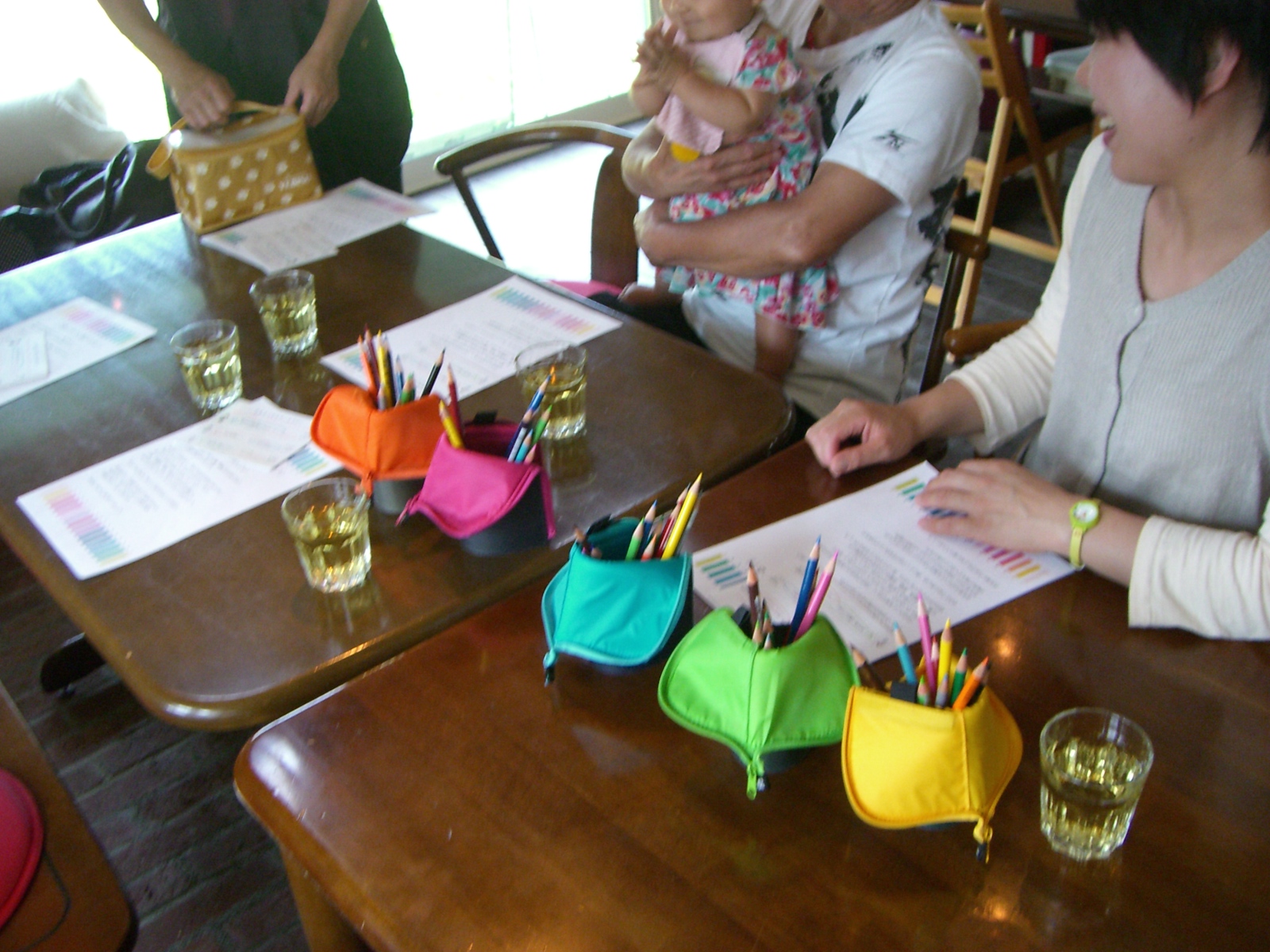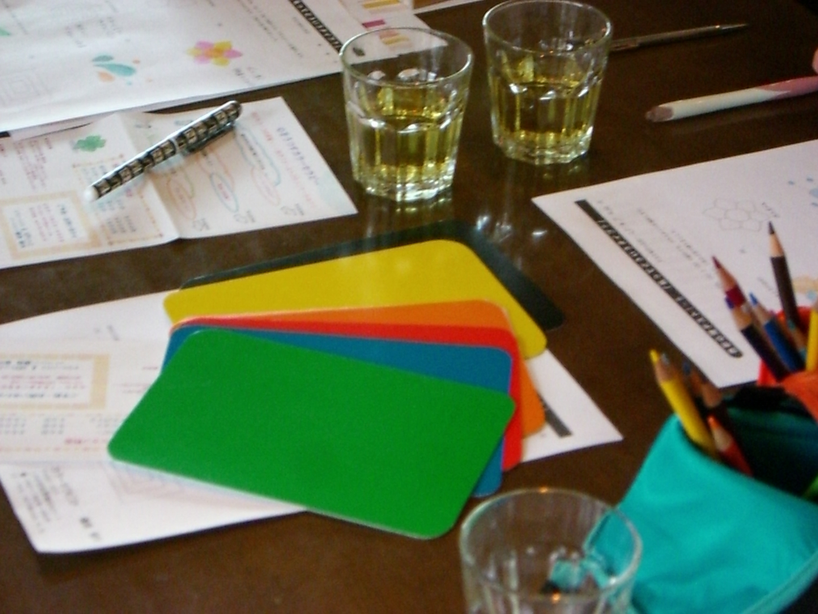 昨日のランチ&カラーセラピーでは、 をお出ししました。 左から人参葉のごま和え、緑やオレンジが綺麗なはずが、油揚げが邪魔して茶色い・・・ 赤のビーツのスープ、緑のズッキーニのピクルス。 主菜は、 カレー味で黄色です。トマトの赤がまぶしい。 その他に、キャベツのサラダとご飯がつきました。デザートもね。暑いのでバニラアイスを。(紫のブルーベリーのトッピングあり)。 コラボ企画なので、色とりどりのメニューをと考えてみましたが、鮮やかさには欠ける・・・。しかし、栄養はたっぷりですよ(開き直り)。ビーツやにんじん葉は、普段なかなか口にしない方も多いのでは。鶏肉以外は、ほとんど野菜です。にんじんと相性のよいごま、玉ねぎ、酢をふんだんに使い、ヘルシー&デトックス効果の高いメニューになりました。鶏肉は、衣をつけて焼いたあとに玉ねぎのピクルスで煮てあるので、油も使っていますがさっぱりです。いっしょに野菜をたくさん食べてもらいたい有報堂では、レシピよりも多めにピクルスをいれています。 参加者の皆さん、お食事をしながらも分析結果で盛り上がって、ゆっくりしていかれましたよ。わいわい楽しくお食事をするのも、セラピーに一役かっているのではないでしょうか。 セラピーハウスb.ぱれっとさん、参加者の皆さん、ありがとうございました。 ☆7/17〜8/24まで、フロートまつり開催中! 貴方の参戦を待つ!!☆ ※本日7/21(日)は夜貸切となります。何卒ご了承ください。その他の7月の営業のお知らせは、6/29(@営業のお知らせ)の記事にあります。ブログ右側の営業カレンダーもご覧下さい。 ※カイロは予約制にて営業しております。予約が埋まってしまいご希望のお時間を承れないことが増えてきましたので、お早めにお問い合わせ・ご予約をいただきますようお願いいたします。 今日は、ランチ& をやりましたよ。初の試みです。 講師をしてくださったのは、 カラーセラピストです。 有報堂代表が代表で、皆さんと一緒に塗り絵セラピーを受けてみます。 今日やったのは、色彩心理テストでした。項目が三つあって、一項目ごと二つのイラストからどちらか一つを選んで、二色の色鉛筆を使って塗っていきます。 この時 その人の今の心理状態や性格が分かるそうです。更に色だけでなく塗り方でもわかることがあるそうです。 さっそくみんなで塗り絵に挑戦、代表は 確かに、同じイラストを塗るにしても、人それぞれやり方があります。絵の線をなぞってから、内側を塗りつぶす人、縁を描きながら塗る人、片方向に塗る人 皆さん完成したら、一人ずつカウンセリングです。 待ち時間に用意してくれた遊び(ゲーム?)が、 色の違うカードに触れながら、相手の手の重みの違いを体感します。 「ウォッ!さっきの色のときより重い!」「怖っ・・・何で?」と、みんなで時間をもてあまさずに楽しく過ごしました。 気になるカウンセリングの内容は・・・・・・・・・ 皆さん次回の講座を受けて、ぜひご自分の分析をしてもらってみてください。今度はあなたもぜひお試しを! カラーセラピーの特製ランチの詳細は、また明日。 ※7/21(日)は夜貸切となります。何卒ご了承ください。その他の7月の営業のお知らせは、6/29(@営業のお知らせ)の記事にあります。ブログ右側の営業カレンダーもご覧下さい。 ※カイロは予約制にて営業しております。予約が埋まってしまいご希望のお時間を承れないことが増えてきましたので、お早めにお問い合わせ・ご予約をいただきますようお願いいたします。