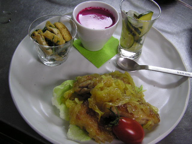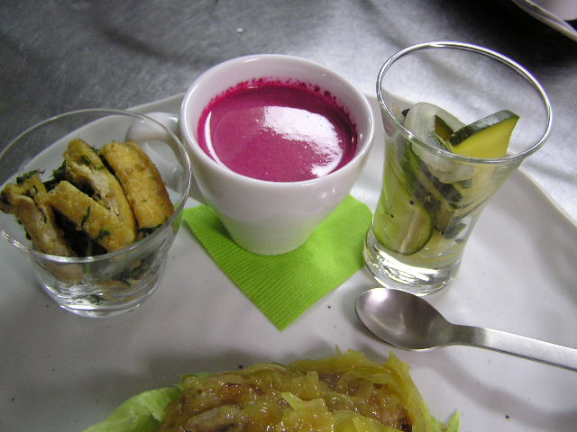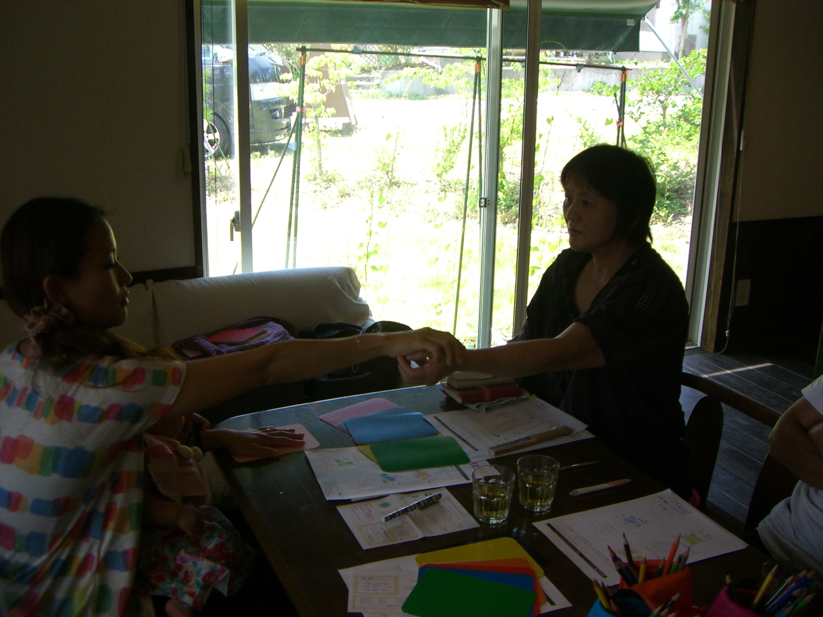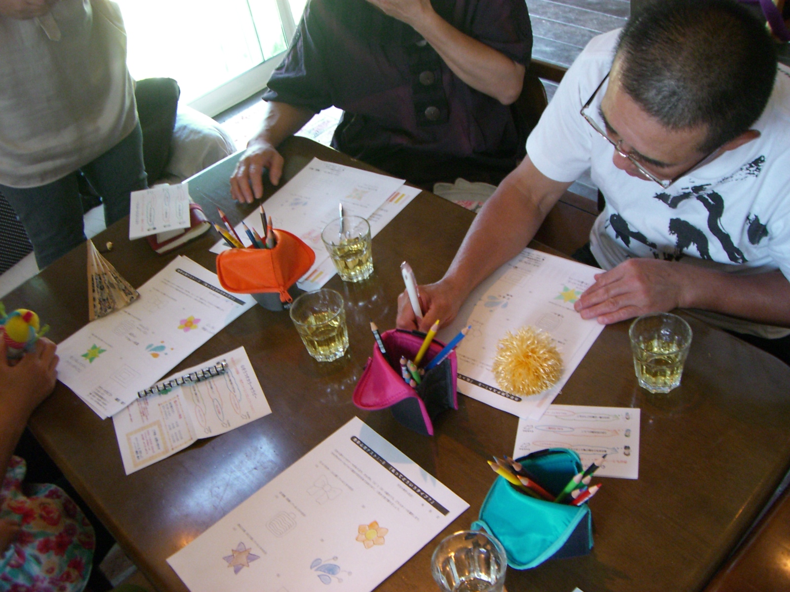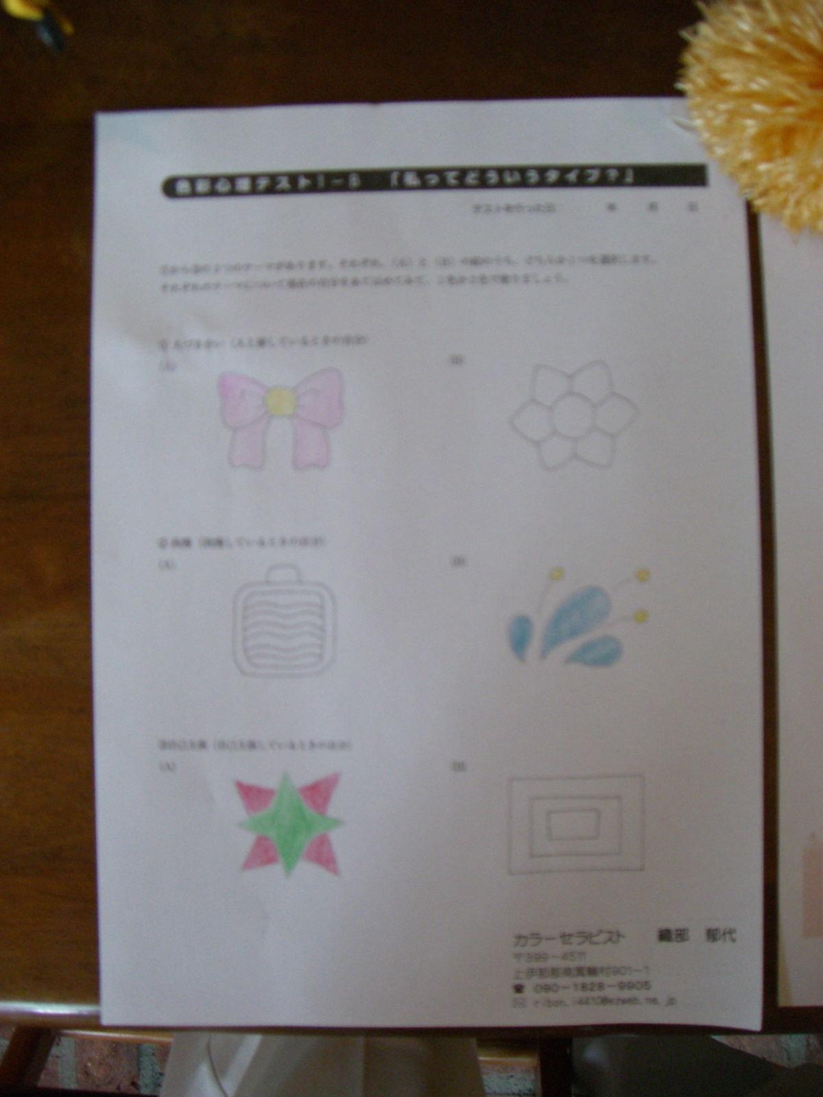 昨日のランチ&カラーセラピーでは、 をお出ししました。 左から人参葉のごま和え、緑やオレンジが綺麗なはずが、油揚げが邪魔して茶色い・・・ 赤のビーツのスープ、緑のズッキーニのピクルス。 主菜は、 カレー味で黄色です。トマトの赤がまぶしい。 その他に、キャベツのサラダとご飯がつきました。デザートもね。暑いのでバニラアイスを。(紫のブルーベリーのトッピングあり)。 コラボ企画なので、色とりどりのメニューをと考えてみましたが、鮮やかさには欠ける・・・。しかし、栄養はたっぷりですよ(開き直り)。ビーツやにんじん葉は、普段なかなか口にしない方も多いのでは。鶏肉以外は、ほとんど野菜です。にんじんと相性のよいごま、玉ねぎ、酢をふんだんに使い、ヘルシー&デトックス効果の高いメニューになりました。鶏肉は、衣をつけて焼いたあとに玉ねぎのピクルスで煮てあるので、油も使っていますがさっぱりです。いっしょに野菜をたくさん食べてもらいたい有報堂では、レシピよりも多めにピクルスをいれています。 参加者の皆さん、お食事をしながらも分析結果で盛り上がって、ゆっくりしていかれましたよ。わいわい楽しくお食事をするのも、セラピーに一役かっているのではないでしょうか。 セラピーハウスb.ぱれっとさん、参加者の皆さん、ありがとうございました。 ☆7/17〜8/24まで、フロートまつり開催中! 貴方の参戦を待つ!!☆ ※本日7/21(日)は夜貸切となります。何卒ご了承ください。その他の7月の営業のお知らせは、6/29(@営業のお知らせ)の記事にあります。ブログ右側の営業カレンダーもご覧下さい。 ※カイロは予約制にて営業しております。予約が埋まってしまいご希望のお時間を承れないことが増えてきましたので、お早めにお問い合わせ・ご予約をいただきますようお願いいたします。 今日は、ランチ& をやりましたよ。初の試みです。 講師をしてくださったのは、 カラーセラピストです。 有報堂代表が代表で、皆さんと一緒に塗り絵セラピーを受けてみます。 今日やったのは、色彩心理テストでした。項目が三つあって、一項目ごと二つのイラストからどちらか一つを選んで、二色の色鉛筆を使って塗っていきます。 この時 その人の今の心理状態や性格が分かるそうです。更に色だけでなく塗り方でもわかることがあるそうです。 さっそくみんなで塗り絵に挑戦、代表は 確かに、同じイラストを塗るにしても、人それぞれやり方があります。絵の線をなぞってから、内側を塗りつぶす人、縁を描きながら塗る人、片方向に塗る人 皆さん完成したら、一人ずつカウンセリングです。 待ち時間に用意してくれた遊び(ゲーム?)が、 色の違うカードに触れながら、相手の手の重みの違いを体感します。 「ウォッ!さっきの色のときより重い!」「怖っ・・・何で?」と、みんなで時間をもてあまさずに楽しく過ごしました。 気になるカウンセリングの内容は・・・・・・・・・ 皆さん次回の講座を受けて、ぜひご自分の分析をしてもらってみてください。今度はあなたもぜひお試しを! カラーセラピーの特製ランチの詳細は、また明日。 ※7/21(日)は夜貸切となります。何卒ご了承ください。その他の7月の営業のお知らせは、6/29(@営業のお知らせ)の記事にあります。ブログ右側の営業カレンダーもご覧下さい。 ※カイロは予約制にて営業しております。予約が埋まってしまいご希望のお時間を承れないことが増えてきましたので、お早めにお問い合わせ・ご予約をいただきますようお願いいたします。