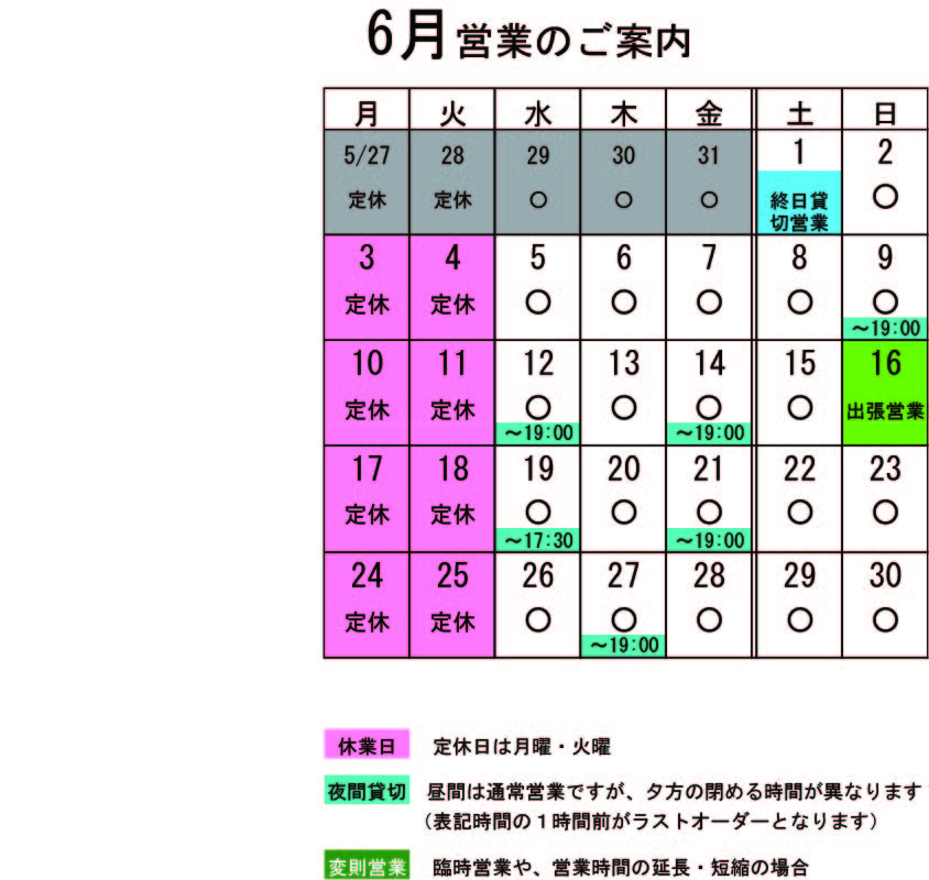 6月の営業のお知らせです。 月・火が定休日です。 ↑↑↑ クリックすると大きくなります。 6月変則営業 1日(土)終日貸切営業 16日(日)終日出張営業 貸切の予定は、 6月 9日(日)19:00~貸切 12日(水)夜貸切 14日(金)夜貸切 21日(金)夜貸切 27日(木)夜貸切 となっております。夜貸切の日は、通常営業は19:00までです。(いずれも通常営業の1時間前がL.Oになります) 貸切以外は通常営業をしています。 ぜひお立ち寄りください。 夜の予約営業も貸切日以外は受け付けていますので、 お気軽にお問い合わせください。 ※カイロは完全予約制にて営業しております。早めに電話または窓口でお問い合わせ・ご予約をいただきますようお願いいたします。