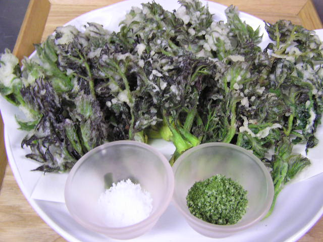 有報堂カフェのお食事予約。コース料理をご注文いただくと、当たり前ですが通常とはちょっと違ったメニューが出ます。 ゴールデンウィークのご予約、特に飲み会のご予約では、 をお出ししました。 塩と抹茶塩を用意するはずが、 抹茶入れすぎです。サービス満点。 山菜の天ぷらは、有報堂では小麦粉と水だけの衣を使います。卵がなくても大丈夫。そのほうがカリッと揚がって美味しいしヘルシーです。 今年は、寒くて山菜の採れ具合が悪いようです。皆さん「今年は全然だ」とおっしゃっています。そんな貴重な春の味覚を食べに、コース料理のご予約はいかがですか。 ※カフェは5/10(金)は夜貸切、5/12(日)は18:00〜貸切(17:00LO)となります。申し訳ありませんがご了承ください。突然の貸切・予約のご要望も増えておりますので、ご来店前にお電話でご確認頂けるとより安全です。その他の5月の営業のお知らせは、4/25(■■■)の記事にあります。ブログ右側の営業カレンダーもご覧下さい。 ※カイロは5/8〜12は研修のため(■■■)休業させていただきます。あらかじめご了承ください。なお、カイロは予約制にて営業しております。予約が埋まってしまいご希望のお時間を承れないことが増えてきましたので、お早めにお問い合わせ・ご予約をいただきますようお願いいたします。