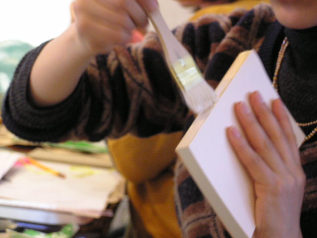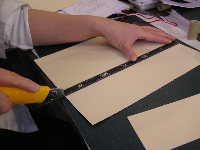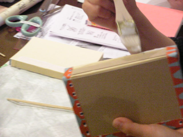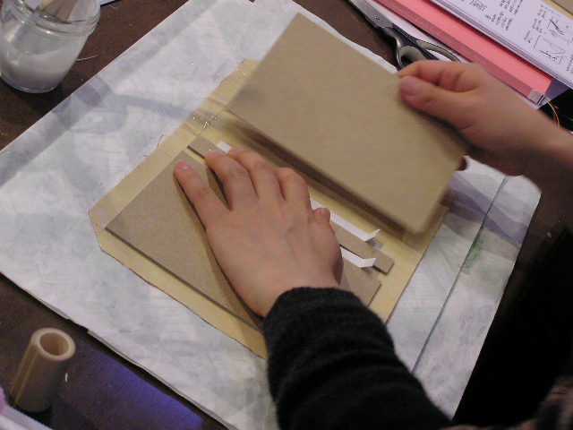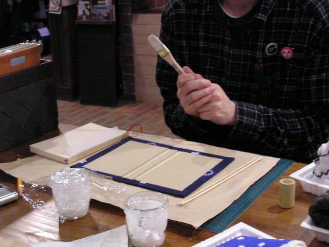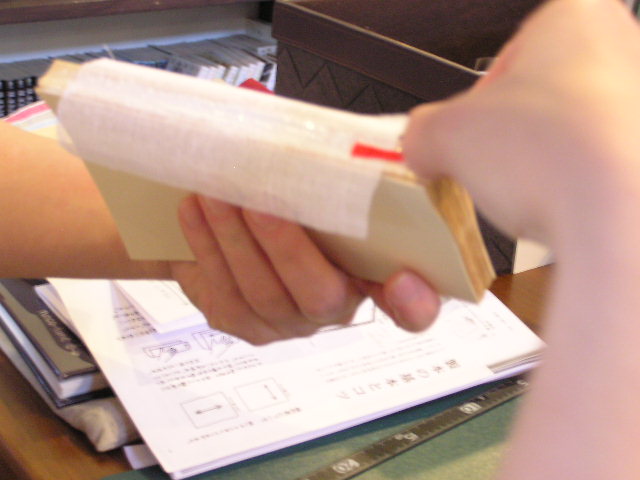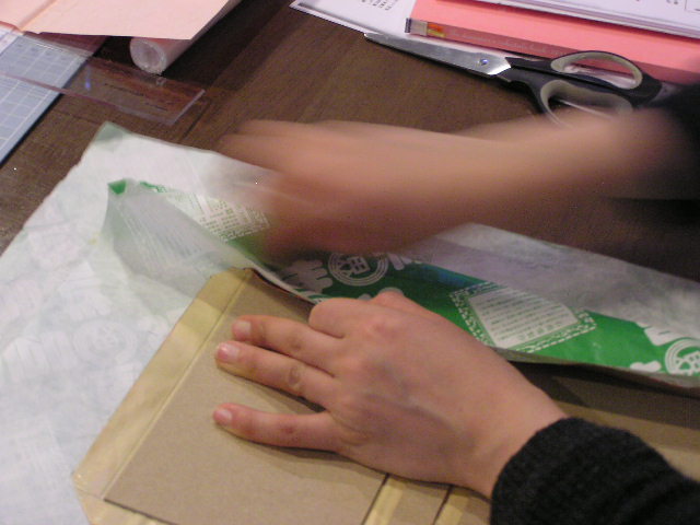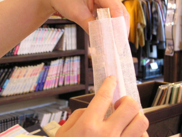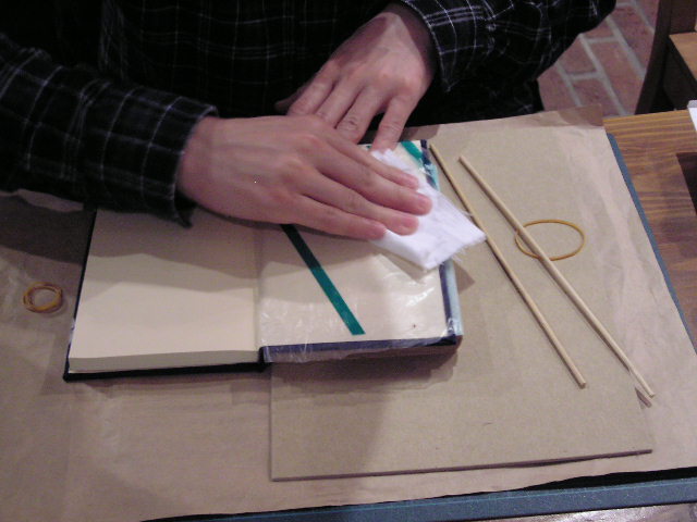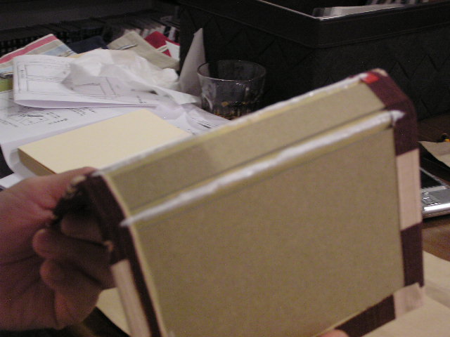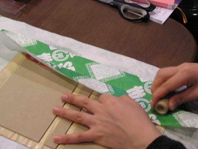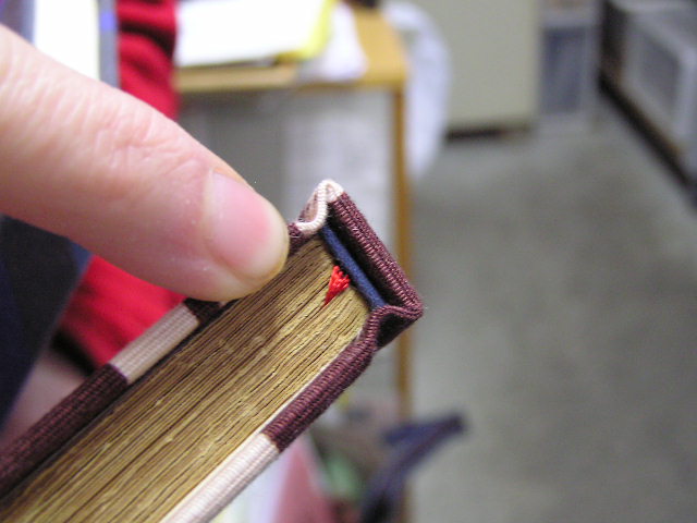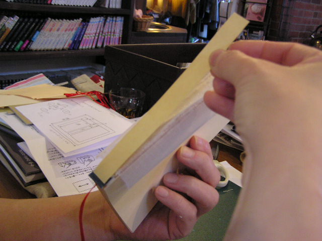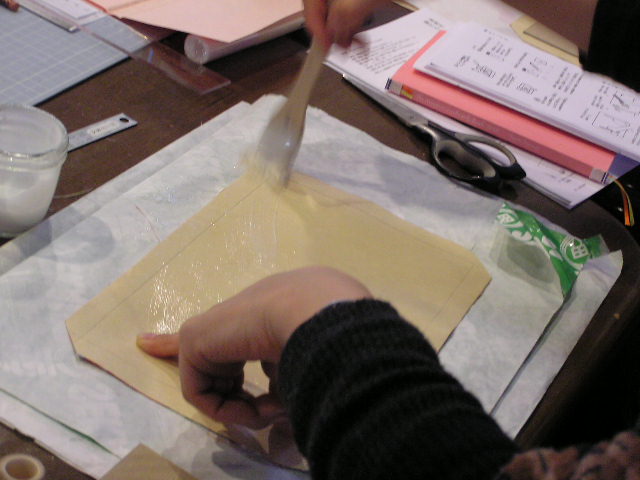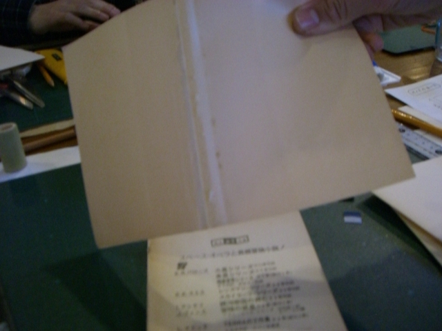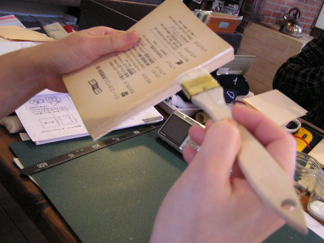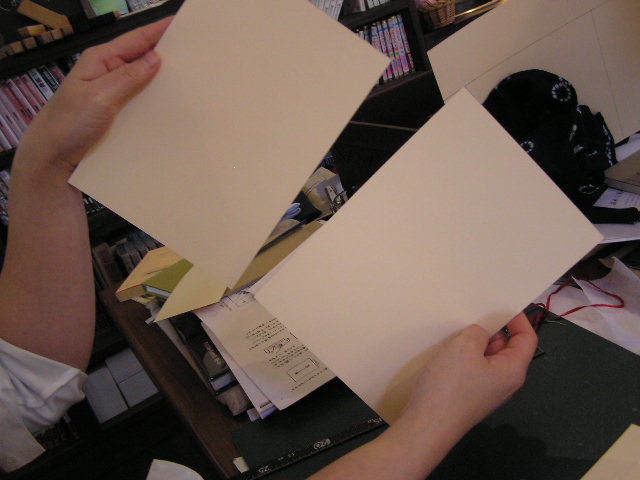 先ほど切った厚紙と裏打ちした布を(■■■)使います。 裏打ちした布に、のりしろや板紙のサイズに合わせて、 四方の角を20mmの三角に 塗ります。 先ほど引いた線に沿って、 白い紙は、溝あき用のガイドです。位置が決まったら外します。糊を塗ると布が伸びるので、板紙は左の線に揃えて貼って、ひたすら左に詰めて貼っていきます。左と右両方に揃えると、隙間が空きすぎます。 最初に引いた線と 布でくるみます。ついに用途不明の のりしろに糊ボンドを塗って こすって貼り付けます。糊がはみだしたりすると布に染みがついてしまうので、あまり塗ってはいけません。 活躍します。指にはめるのではなく、持ってころがして押さえていきます。糊をたくさん塗るのではなく、圧でくっつけていくそうです。 長辺の両サイドを同じように 短辺の作業に移ります。まずは四隅の処理を。 微妙すぎて写真ではよく分かりませんが、これをやらずに折ると角がでこぼこになります。 その後長辺と同じように じゃーん みんな「っぽい。っぽい」「本っぽいねえ」と騒いでいます。 この布とさっき処理した本(■■■)をくっつけるわけですが、それはまた明日以降。まだまだ続くよ。 ※本日2/24(日)は17:00〜貸切(L.O.16:00)となります。ご了承ください。その他の2月の営業のお知らせは、1/30の記事にあります。ブログ右側の営業カレンダーもご覧下さい。 ※カイロは予約制にて営業しております。予約が埋まってしまいご希望のお時間を承れないことが増えてきましたので、お早めにお問い合わせ・ご予約をいただきますようお願いいたします。 いよいよ本をいじります。 見返しを付ける作業をします。見返しは、表表紙・裏表紙の内側に貼り付けて、本の中身と表紙をつなぎ合わせている紙です。本によっては、表紙をそのまま貼るので、この作業が必要ない人たちもいましたが、有報堂スタッフは、見返しが必要だったので作業します。 まずは、本文の 本文のサイズに合わせて、 裏表の表紙用に2枚切ります。 本文に、ボンドを 次は、ボンドを 貼り付けます。補強です。 栞の長さは、 ちょうど良いそうです。 花布を その上に更に 本の処理が終わりました。 次の作業に移ります。まだ、道のりは遠い。続きはまた明日。 ※カフェは2/23日(土)は18:30〜貸切(L.O.17:30)、2/24(日)は17:00〜貸切(L.O.16:00)となります。ご了承ください。その他の2月の営業のお知らせは、1/30の記事にあります。ブログ右側の営業カレンダーもご覧下さい。 ※カイロは予約制にて営業しております。予約が埋まってしまいご希望のお時間を承れないことが増えてきましたので、お早めにお問い合わせ・ご予約をいただきますようお願いいたします。 |