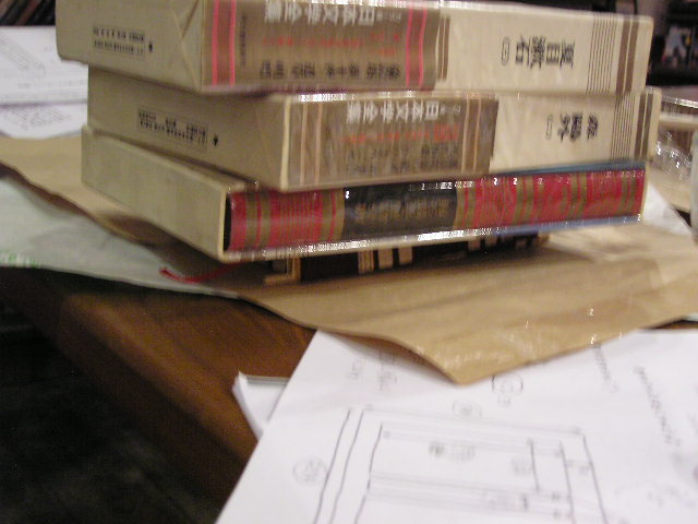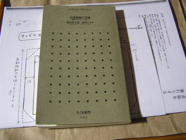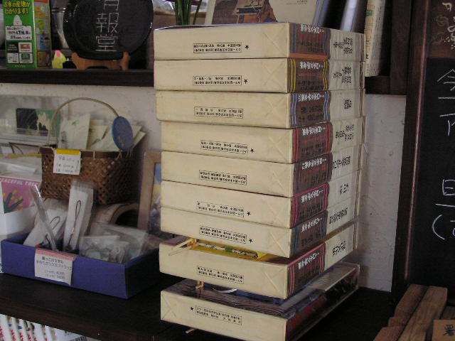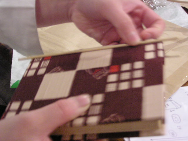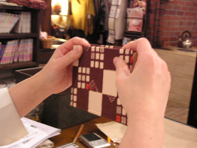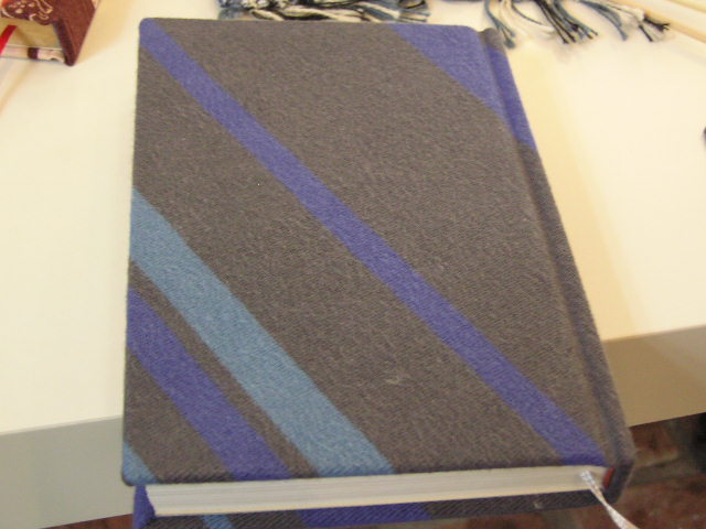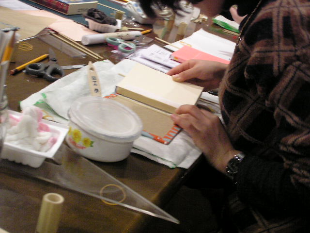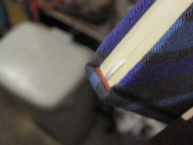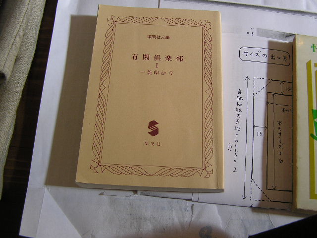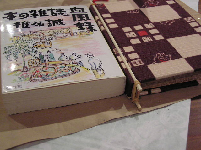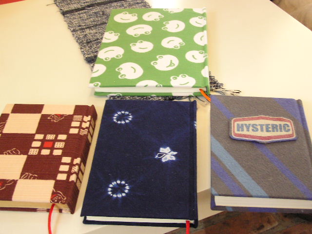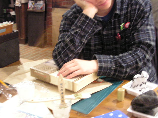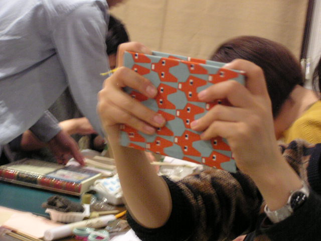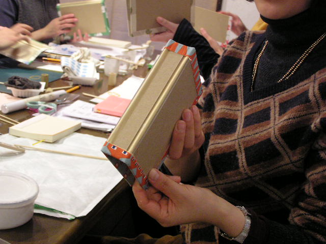 正体不明の花布(■■■)は、 のことでした。 Hさんの 有報堂ブックスの 製本教室のために新しい布を準備しなかったので、中身の本と外側の布のイメージが合っていませんが気に入っています。有報堂ブックスは、何度か製本教室を体験して上達したら、ある本をある布で製本しようと大いなる野望を持っています。いつか「ある」が何か分かるときがくるはず・・・ 有報堂Bの Tシャツの胸にあったブランドロゴも切って、表紙に貼り付けます。ぬかりないです。 有報堂Bが悩んでいた(■■■)Tシャツのストライプ。最終的には、 しました。良い感じです。 みんな初めての製本教室でしたが、なかなか上手く出来ました。先生の教え方が良かったに違いありません。ありがとうございました。 参加された皆さんが、「とても楽しかった」「またやりたい」とおっしゃっていました。ぜひまたやりましょう。今回参加出来なかった皆さんもぜひご参加ください。なるべく早い時期に次の企画を準備したいと思っています。 「今度は、本当に自分で使う手帳を製本したい」というご希望もありました。本当は、昨年その企画をやる予定でしたが、有報堂が忙しくて日程がうまくとれなかったのです。と言うことで、今年は、手帳もたくさん選べる11月に必ず製本教室をやりたいと思います。乞!ご期待。 参加された皆さん、田上さんありがとうございました。またよろしくお願いします。 と製本教室のブログが終わったように思えますが、まだです。製本教室のお茶を明日はご紹介しますね。 ※2月の営業のお知らせは、1/30の記事にあります。ブログ右側の営業カレンダーもご覧下さい。 ※3/3(日)のカイロは、出張のため臨時休業となります。あらかじめご了承ください。なお、カイロは予約制にて営業しております。予約が埋まってしまいご希望のお時間を承れないことが増えてきましたので、お早めにお問い合わせ・ご予約をいただきますようお願いいたします。 ついに本文と表紙をくっつける時がきた。 やる気満々です。 まずは溝を作ります。先ほどガイドを挟んで作った そして、 このとき表紙のチリが均等に出るように置きます。 くっつけます。このカメラを構えるようにして両手で押さえるのがポイントです。 溝に 乗せてしばし待つ。重しは、河出書房新社のカラー版日本文学全集です。有報堂始まって依頼本棚から出されたことがないのではないかというくらい、ひっそりとおかれていましたが、今日は大活躍です。有報堂スタッフはお茶の準備があるので、このように何冊も本を乗せましたが、お客さんは、 みんなで肘をついているのは、不思議な光景です。15分ほどしたら、いよいよ最後の工程に 本を準備して作業します。このへんの最後の過程は、有報堂スタッフの手が空かずあまり写真は撮れていません。 完成!ではなく・・・ 一晩おきます。「あぁ待ち遠しい」と有報堂Bはつぶやいています。 一晩たてば出来上がりです。完成写真はまた明日。 ※2月の営業のお知らせは、1/30の記事にあります。ブログ右側の営業カレンダーもご覧下さい。 ※カイロは予約制にて営業しております。予約が埋まってしまいご希望のお時間を承れないことが増えてきましたので、お早めにお問い合わせ・ご予約をいただきますようお願いいたします。
