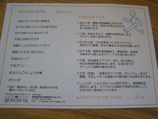 あの原田茶飯事(■■■)が再び有報堂にやってきます。 アコースティック・ライブ・イベント「青谷明日香と原田茶飯事」 日時:12月1日(土) OPEN 18:00 /START 18:30 料金:前売予約2,000円、当日2,500円(1ドリンク&軽食つき) 問合せ:live.ina.musica@gmail.comまたは有報堂(0265−76−4353) チケットはありませんので、お電話にてお名前・人数などをご予約ください。 出演者 青谷明日香、原田茶飯事、O.A.タカヨ 青谷明日香・・・有報堂初お目見えです。「明るく楽しく優しく、かつ、懐のふかい人柄がにじみ出るステージングとユーモアと愛嬌とどこか懐かしくさせる楽曲の数々。そして・・・ワンフレーズだけで心に染み渡っちゃう、なんとも言えないじんわり響く声。これからの日本の音楽シーンに一石を投じるであろうアーティスト」(チラシより)らしい。 「あっちにも行けるしこっちにも行ける、全方位型シンガーソングライター。優しいメロディ、ボッサな雰囲気を放って耳にスーっと入ってくる。そのサウンドとは裏腹に、口から半分魂の出た様なステージングは必見。柔らかさと激しさのオイシイとこ取り、その表現に釘付けになる!」(同)らしい。 と言うわけで、今年最後の月・12月をライブで始めませんか。皆さまのお越しをお待ちしております。 ※カフェは11/11(日)出張営業のため、終日貸切となります。通常営業はいたしませんので、ご了承ください。その他の11月の営業のお知らせは、10/31の記事にあります。ブログ右側の営業カレンダーもご覧下さい。 ※カイロは11/11(日)は出張のため、臨時休業となります。あらかじめご了承ください。なお、カイロは予約制にて営業しております。予約が埋まってしまいご希望のお時間を承れないことが増えてきましたので、お早めにお問い合わせ・ご予約をいただきますようお願いいたします。 またやるよ。 有報堂特製ランチ&健康ウォーキング教室 日 時 11月24日(土) 9:30 受付開始 10:00〜ウォーキング教室 ※雨天時は、室内で運動教室を行います。 11:45〜お食事 参加費 1,800円(ランチ代込み) 持ち物 タオル、帽子など お申し込みは、有報堂(76-4353)かT&Hサポート(090-2151-4232)まで。 1回目は、 コラボ企画第一弾としては上々の滑り出しになりました。ありがとうございました。(■■■)(■■■) 前回都合が合わずに、「またやるようならぜひ声をかけて」と言われていたお客さんも多かったので、調子に乗ってすぐ計画してみました。1回目参加した方も、まだ参加していない方も奮ってご参加ください。 ※カフェは11/11(日)出張営業のため、終日貸切となります。通常営業はいたしませんので、ご了承ください。その他の11月の営業のお知らせは、10/31の記事にあります。ブログ右側の営業カレンダーもご覧下さい。 ※カイロは11/11(日)は出張営業のため、臨時休業となります。あらかじめご了承ください。なお、カイロは予約制にて営業しております。予約が埋まってしまいご希望のお時間を承れないことが増えてきましたので、お早めにお問い合わせ・ご予約をいただきますようお願いいたします。 シーズンですので、続々と秋冬限定メニューに切り替わっています。 まずは、ドリンクから切り替えです。秋冬限定・あったかドリンクの最初を飾るのは、何故か 先週末から秋冬限定ドリンクをご提供しています。スタートダッシュよろしくオーダーが殺到(?)したのは、れんこんくず湯。予想外の展開です。 有報堂スタッフが、冬の友にしているれんこんくず湯。風邪をひいたときに、薬ではなくこれを飲めば治るれんこんくず湯。一緒に食すときに、合う食事やスイーツがなかなかない、れんこんくず湯。それだけで独立した、食事のようなスイーツのような、ドリンクのようなれんこんくず湯。お勧めです。 合わせるのが難しくても大丈夫。他の物を食べ終わってから、オーダーすれば大丈夫。 まあ、しかし、有報堂スタッフの想像を超える組み合わせでオーダーしてくるお客さんが多いので、きっと今年もびっくりするようなオーダーがあるに違いありません。皆さまの積極的な、攻撃的なオーダーをお待ちしておりますよ。 ※カフェは11/11(日)出張営業のため、終日貸切となります。通常営業はいたしませんので、ご了承ください。その他の11月の営業のお知らせは、10/31の記事にあります。ブログ右側の営業カレンダーもご覧下さい。 ※カイロは11/11(日)は出張営業のため、臨時休業となります。あらかじめご了承ください。なお、カイロは予約制にて営業しております。予約が埋まってしまいご希望のお時間を承れないことが増えてきましたので、お早めにお問い合わせ・ご予約をいただきますようお願いいたします。 昨日は朝から爽やかに運動(■■■)してしまったため、午後は疲れてかなりどんよりの有報堂カフェ部門・・・でも思ったより今日は疲れが残っていなくてよかったです。やはり先生の教え方が良かったのか。 有報堂特製ランチ&健康ウォーキング教室は、もちろんウォーキ