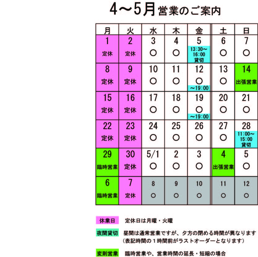 3月に作った安心安全、完全手作りの 雑穀入り五分づきごはん、イワシフライ、蒸し鶏、大根の酢漬け、小松菜ナムルでした。これで1,000円。 有報堂のお弁当は、野菜が多くて味付けも薄めにしているので、ヘルシーです。ご希望があれば飲み物やデザートもお付けします。 単価は1000円〜、個数は昼10個〜・夜20個〜で承ります。個数によって単価はご相談に応じます(お安くできることもあります)。有報堂のお弁当はいかがですか?お弁当は予約制です。スタッフにお気軽にお問い合わせください。 ※4月の営業のお知らせは3/24の記事(■■■)にあります。ブログ右側の営業カレンダーもご覧下さい。 ※カイロは完全予約制にて営業しております。早めに電話または窓口でお問い合わせ・ご予約をいただきますようお願いいたします。 待たせたね。 ついに始まりました。 3月の頭くらいから「始まりましたか」という問い合わせを頂いていましたが、遂に「始まりました」とお返事できます。2月中旬から毎週のように雪が降っていて、ふきのとうがでていてもとりに行けない事態に陥っていましたが、ついに… ついにきた!このシーズンが。 季節のピザで一番人気!ふきのとうピザ。ほろにが春の味。これを食せば春が始まる、ふきのとうピザ。ビールが合うふきのとうピザ。運転手が確保出来る方は、急いでビールも注文だ!残念ながら、ビールが飲めないよという方は、濃い水出しコーヒーがお薦め! 季節限定ピザでは、一番期間が短いふきのとうピザ。食べ逃しのないように有報堂へ急げ! ※4月の営業のお知らせは3/24の記事(■■■)にあります。ブログ右側の営業カレンダーもご覧下さい。 ※カイロは完全予約制にて営業しております。早めに電話または窓口でお問い合わせ・ご予約をいただきますようお願いいたします。 4~5月の営業のお知らせです。 月・火は定休日ですが、G.W.の関係で営業している日もあったり色々です。 ↑↑↑ クリックすると大きくなります。 4~5月変則営業 4月14日(日)出張営業 29日(月)臨時営業 5月4日(土)出張営業 6日(月)臨時営業 貸切の予定は、 4月 5日(金)13:30~16:00貸切(この前後は通常営業しています) 12日(金)夜貸切 19日(金)夜貸切 28日(日)11:00~15:00貸切(以後通常営業しています) 夜貸切の日は、通常営業は19:00までです。 もうゴールデンウイークのお知らせです。早いですねえ。 4~5月は、貸切ではなくても予約が入っている日が多くなっています。 ご来店前にお席のお問い合わせを頂けると確実です。 貸切以外は通常営業をしています。 ぜひお立ち寄りください。 夜の予約営業も貸切日以外は受け付けていますので、 お気軽にお問い合わせください。 ※カイロは完全予約制にて営業しております。早めに電話または窓口でお問い合わせ・ご予約をいただきますようお願いいたします。