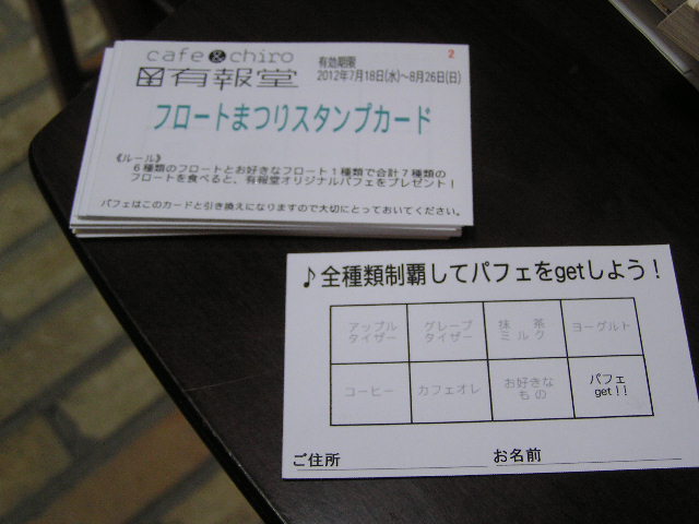 今日から始まるのは、フロートまつり(■■■)だけではない。 も始まるのだ。毎年恒例の「平和のブックフェア〜平和を戦争を読む」ですよ。 夏ですから。シーズンですから。 をちょっと考えてみませんか。 フロートまつりなんぞが出来るのは、平和であってこそですよ。 ※7/21(土)は18:00〜貸切(L.O.17:00)、7/22(日)は14:00まで貸切、14:30〜通常営業を行います。ご了承ください。7月の営業のお知らせは、6/28の記事にあります。ブログ右側の営業カレンダーもご覧下さい。 ※カイロは予約制にて営業しております。予約が埋まってしまいご希望のお時間を承れないことが増えてきましたので、お早めにお問い合わせ・ご予約をいただきますようお願いいたします。 今年もやるのは、フロートまつり(■■■)だけではない。 「有報堂夏まつり2012 〜有報堂と愉快な夏休み〜」 日時;8月25日(土曜日)10:00〜16:00(雨天決行) 今年は、土曜日の開催です。第4日曜日に他のイベントが多いので、ずらしてみました。せっかくずらしたので、皆さんぜひ来てくださいね。 フリーマーケット(駐車場)と節電・電磁波レスライブ(店内)を予定しています。そしてお楽しみ企画も盛りだくさん!! フリーマーケット出店者募集中!! 2m×2.5mのブースで、出店料は1ブース500円です。 先着15ブースまでとなります。 既に申込も来ています。今年は、ヨーヨーつり・輪投げ・生ビールなどなどが出店の予定です。「今年こそ有報堂まつりに出店しようかな」と思っている方は、お早めにご連絡くださいね。 申込・お問合せは、有報堂(0265)-(76)-4353まで。 一昨年はものすごい暑さ。去年はどしゃぶり。果たして今年は・・・・・・。今年の有報堂の日頃の行いはいいのか、悪いのか? 全ては有報堂夏まつりの天気で決着がつく。今年は雨でも酷暑でもしのげる、万全の態勢を整える予定・・・。 今から8/25の予定を空けて、ぜひお越し下さい。 今年の有報堂夏まつりのテーマは、「明日へのリレー〜みんなで元気になろう」です。何故このテーマなのかはまた今度。 夏まつりのお知らせは、随時このブログで行いますので、ブログを要チェックです。 ☆今年の夏まつり参加者特典 まつり当日、会場で (カフェ)食事予約をされた方 ⇨ 300円×ご予約人数分を割引! (カイロ)通常の施術予約をされた方 ⇨ 基本料金から1000円引き! 有報堂夏まつりに参加して予約をとろう! ※7月の営業のお知らせは、6/28の記事にあります。ブログ右側の営業カレンダーもご覧下さい。 ※カイロは予約制にて営業しております。予約が埋まってしまいご希望のお時間を承れないことが増えてきましたので、お早めにお問い合わせ・ご予約をいただきますようお願いいたします。 今年もこんな時期になってきましたよ。 のシーズンです。 今年は全般的に気温が上がらず、夏野菜の出来が悪いということですが、果たしてズッキーニは今後どんな情勢になるのか・・・先日の豪雨・強風で、とうもろこしは実がなるまえに倒れてしまっているところも。ナスやトマトもこれからが本番ですが、心配ですね。 おかげさまで、今回のピザに使うズッキーニは、昨年と変わらずりっぱな、美味しいズッキーニです。薄くスライスしてたっぷりのせました。ベースのソースは粒マスタードが入っています。春のピザとは変わって、今度はちょっと洋風です。アクセントに生のトマトをちらしています。マスタードがピリッとして、ところどころトマトの酸味もあって、元気がでる味です。 いよいよ夏が来た! 氷コーヒーやオーガニックジンジャーエールと一緒に召し上がれ。テイクアウトもできますよ(箱代+50円)。ご注文お待ちしております。 ※カフェ部門は7/15(日)は終日貸切となります。通常営業はいたしませんので、ご了承ください。その他の7月の営業のお知らせは、6/28の記事にあります。ブログ右側の営業カレンダーもご覧下さい。 ※カイロは予約制にて営業しております。予約が埋まってしまいご希望のお時間を承れないことが増えてきましたので、お早めにお問い合わせ・ご予約をいただきますようお願いいたします。 もうすぐ、来週18日(水)から始まりますよ。フロートまつり(■■■)が。 着々と準備が進められています。 もちろん 用意されていますよ。「そろそろスタンプカードを配り始めるか」と有報堂カフェ部門がつぶやいています。事前にカードを貰いたい方は、スタッフに声をかけてくださいね。 皆さんの体調は、万全ですか。調子の悪い方は、今週中に整えて、準備万端でフロートまつりに参戦してくださいね。 ※カフェ部門は7/15(日)は終日貸切となります。通常営業はいたしませんので、ご了承ください。その他の7月の営業のお知らせは、6/28の記事にあります。ブログ右側の営業カレンダーもご覧下さい。 ※カイロは予約制にて営業しております。予約が埋まってしまいご希望のお時間を承れないことが増えてきましたので、お早めにお問い合わせ・ご予約をいただきますようお願い