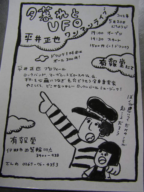 が、定番になりつつあります。 もちもちしたベーグルをバターでこんがり焼き、メープルシロップとシナモンをかければ・・・ これはもう、とてつもなく美味しい! そのまま食べてももっちり美味しいベーグルが、卵と牛乳のおかげでよりもっちりふわふわに焼き上がります。大きさも1.5倍くらいになって(作り手しかわかりませんが)、ボリュームたっぷりです。2人くらいで分け合うのもおすすめ!! ♪セットでドリンクをご注文いただくと合計金額から100円割引になります。 このベーグルは、あこがれのさくらcafe(■■■)のベーグルです。有報堂カフェ部門では、ベーグルまで手が回らないので、さくらcafeから仕入れることにしました。 さくらcafeは何でも美味しいので、近くにお立ち寄りの際はぜひ行ってみてください。(有報堂Aの一押しはケーキです) いま一押しのあまあまおやつ「ベーグルフレンチ」を食べに、ぜひ有報堂へお越しください。 ※カフェ部門は5/10(木)は、18:00〜貸切となります(LO17:00)。何卒ご了承ください。その他の5月の営業のお知らせは、4/27の記事にあります。ブログ右側の営業カレンダーもご覧下さい。 ※カイロ部門は5/13(日)は出張のため臨時休業となります。あらかじめご了承ください。カイロは予約制にて営業しております。予約が埋まってしまいご希望のお時間を承れないことが増えてきましたので、お早めにお問い合わせ・ご予約をいただきますようお願いいたします。 営業のお知らせ(■■■)でも書いたように、5/20(日)はライブがあります。 誰のライブかと言うと 平井正也です。ワンマンです。 有報堂2回目の登場です。前回は(■■■)急遽決まったライブでしたが、今回は準備万端です。 「夕暮れとUFO」 日時:5月20日(日)OPEN 19:00 /START 19:30 料金:1,500円(1ドリンクつき) 問合せ:有報堂(0265−76−4353) チケットはありませんので、お電話にてお名前・人数などをご予約ください。 ご本人は、お昼は松本でバンドのライブをした後、飛んで来ます。(タフです・・・) 当日は「ぼくが思いつくだけのことが起こるだろう」(by平井正也) 「夕暮れとUFO」は平井さんの歌の題名です。 ・・・「有報堂だけにUFO」・・・ ライブを有報堂でやるので、このタイトルにしたそうです。 「UFOですよ!!」と、有報堂Bは興奮しています。「トランス」の時のように(■■■)、UFOコラボメニューを考えるそうです。乞ご期待! 5/20はぜひ有報堂へお越しください。 ※カフェ部門は明日5/10(木)は、都合により18:00までの営業とさせていただきます(LO17:00)。何卒ご了承ください。その他の5月の営業のお知らせは、4/27の記事にあります。ブログ右側の営業カレンダーもご覧下さい。 ※カイロ部門は5/13(日)は出張のため臨時休業となります。あらかじめご了承ください。カイロは予約制にて営業しております。予約が埋まってしまいご希望のお時間を承れないことが増えてきましたので、お早めにお問い合わせ・ご予約をいただきますようお願いいたします。 昨日ご紹介したおにぎり(■■■)は通常メニューのおにぎりですが、予約ではもっと豪華なおにぎりがでます。 これは甘辛く煮付けた大根を小さく切って、混ぜごはんに。 通常入れている雑穀を黒米に変えて。色目がきれいでパーティー向きです。 昨日のゆずこしょう同様、スパイシーなおにぎりです。チーズと粗挽きこしょうで、ちょっと洋風に。 ツナマヨにひじきを混ぜて、ごはんに混ぜるのではなく上に盛ってみました。これは黒米ですが、白いご飯でも美味しいです。 パーティーや宴会では、ごはんものはこのようにおにぎりでお出しすることが多いです。取り分けやすく、食べやすいと好評です。 グレードの高い変わり種おにぎりを希望の方は、ぜひコース料理の予約を。 ☆おまけ☆ これが何か、いつ使われるかは、そのうち分かるはず・・・毎日ブログを欠かさずチェック!! ※カフェ部門は5/6(日)は終日貸切となります。通常営業はいたしませんので何卒ご了承ください。5月の営業のお知らせは、4/27の記事にあります。ブログ右側の営業カレンダーもご覧下さい。 ※カイロ部門は5/6(日)は出張のため臨時休業となります。あらかじめご了承ください。カイロは予約制にて営業しております。予約が埋まってしまいご希望のお時間を承れないことが増えてきましたので、お早めにお問い合わせ・ご予約をいただきますようお願いいたします。 |