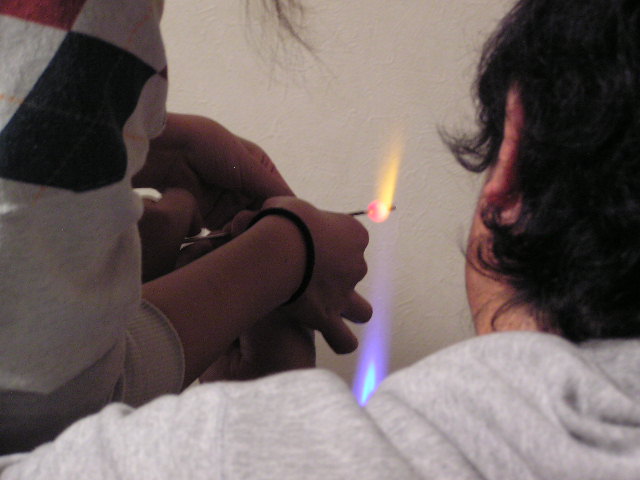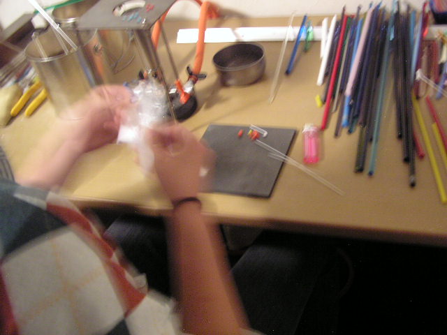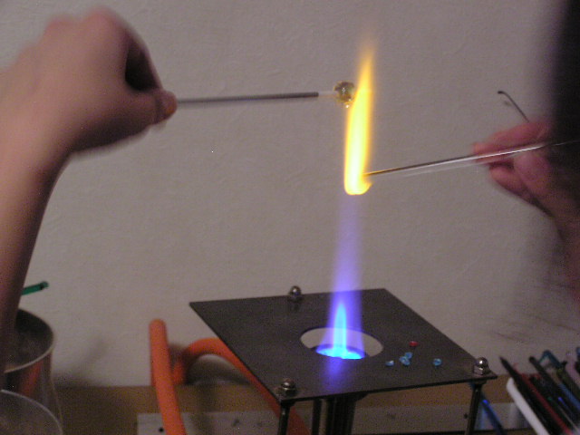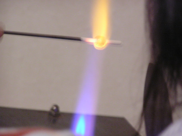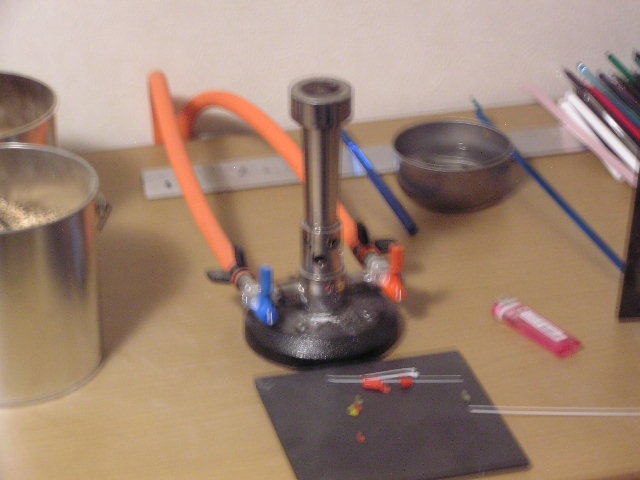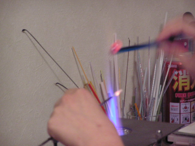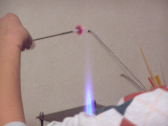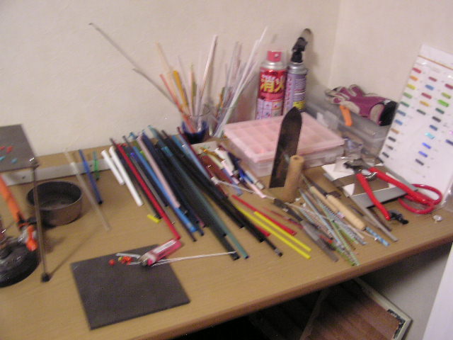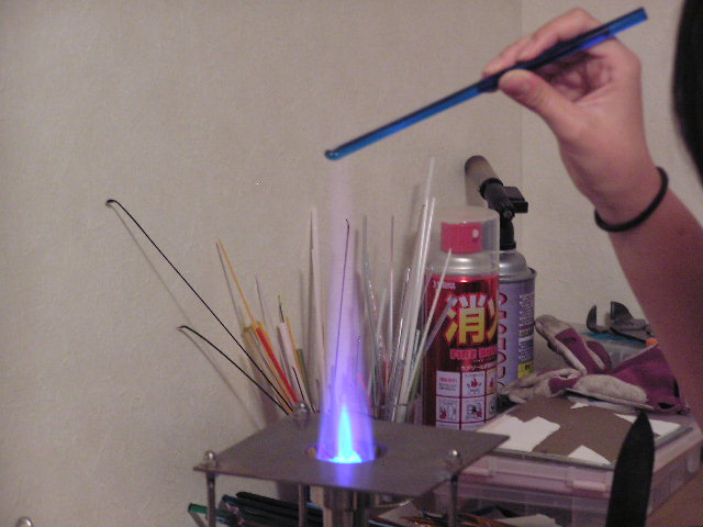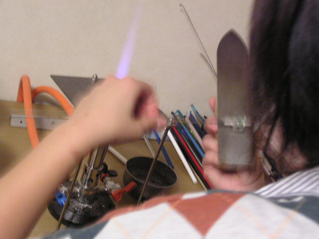 忙しい一因は、やはり出張営業があったからでしょうか。 先週の土曜日は、田楽座の稽古場公演(■■■)に 出張営業が何故に忙しいのかと言えば、仕込みが大変だからです。お店にいるときは、オーダーがきてから調理を始めればいいものもありますが、出張営業は事前に全部仕込まなければならないのです(当たり前ですが)。 だから大変なのです。荷物も一切合切運んで行かなければならず、とにかく準備に時間がかかります。今回は、火の使える出店だったので、全く使えないときと比べれば楽でしたが、それでも大変です。仕込みの手を抜くと稼げません。会場でまだまだ時間があるのに、売る物がなくなる悲しさは・・・何とも言えません。 最近出張営業で一番人気の 美味しい上に仕込みが楽なのでとても優秀なメニューです。 写真では分かりづらいですが、パンにファットスプレッドと粒マスタードを塗って、ケチャップで味付けをした玉ねぎやエリンギなどの具をはさんで、無添加フランクフルトをのせます。パンよりもフランクフルトが大きい!パンにはさむというよりのっています。とっても豪華なホットドック。ケチャップやマスタードをパンや具に先に塗ったり絡めたりしておくことで、作業効率をあげています。しかも、ケチャップやマスタードが零れることなく綺麗に食べられます。外で食べるには最適です。 フランクフルトは神奈川農畜産物供給センターのもので、「徹底したこだわりの飼料、肥育管理のもとで育てられた安心の豚肉を原料にした、添加物を一切使用しない究極の無添加ソーセージ」(パンフレットより)です。ほんとうに美味しい、「お肉の味」がします。 無添加だということは、調理時にフランクフルトをゆでると格段にわかります。ゆで汁が濁ったり臭くならない!市販のソーセージは何種類もの添加物がはいっているので、ゆでると本当に心配になるくらい化学的な臭いがします。子どもさんが好きなソーセージやフランクフルトこそ、添加物を入れずにつくってほしいなぁと、いつも思います。 有報堂のホットドックは、通常より格段に高いですが、「安心・安全・美味しい」にこだわっています。出張営業でみかけたときには、ぜひ食べてみてくださいね。 ※10/29(土)は都合により16時閉店とさせて頂きます(L.O.15:00)。何卒ご了承ください。その他の10月の営業のお知らせは9/28の記事にあります。ブログ右側の営業カレンダーもご覧下さい。 恒例の愉快な仲間達(上伊那民商青年部)の「お仕事訪問」。 今月は先週14日の金曜日に、愉快な仲間になって欲しいGlass Garden ChiffoN*さんにお邪魔しました。が、有報堂ブログ部は、別件で参加出来ず・・・。今回は有報堂カフェ部門が代わってご報告します。 入口に白い看板が。 有報堂夏まつりでも出店していただいたChiffoN*さん。さっそくとんぼ玉づくりのわざを見せていただきます。 いきなり火のなかに入れると割れてしまうので、先端をかざしながら少しずつ温めていきます。ゴォーというバーナーの音が、お店のなかに響きます。これを見ただけで熱そうです。 この棒で溶けたガラスを巻き取り、とんぼ玉をつくります。あとで外せるように「離型剤」という粉をつけます。 溶け落ちそうになるガラスを、何回か手をかえしながらまとめます。くるくると巻かれて先端が「わらび」のようになっています。 このとき、あまり速くまわすと遠心力で歪んでしまうそうです。 そして、模様をつけます。 白い針状のガラスはすぐに溶けて、しばらくするととんぼ玉本体と一体化しました。 この一連の作業を見ながら、みんな「ほぉー」「うわー」と叫んでいます。右手と左手それぞれに違う作業を素早くこなしています。 完成したとんぼ玉は 冷えて触れるようになるまで30分くらいかかります。園芸用の土を使っているところに農民と樵が反応しています。「これいいよね」「安いよね」などと興奮しています。 冷めるのを待つ間に、愉快な仲間もとんぼ玉づくりを体験させてもらえることに。立候補を募りますが、「うまくできるかな」「火がこわいなぁ」と、尻込みする人多数。推薦により、大工と有報堂Bがやってみます。 右手でガラスを溶かし、溶けてくるのを落とさないように見ながら左手も動かします。 ドキドキして「はー」とか「うー」しか出ません。夢中で言われるように手を動かし、何とか完成。 つくるのは数分で終わりましたが、冷めるのに時間がかかります。その間に店内を見学。 ガラスは色によって溶ける温度が少しずつ違うそうです。100g200円〜くらいとか。割れやすい色、扱いやすい色というのもあり、さきほどの体験では初心者でも扱いやすい青や緑を使いました。 金魚やフルーツなどがものすごく小さく作られています。これをひたすら1時間2時間とつくっているときもあるとか。 どうやってつくるのかというと 組み合わせて、外側をまたガラスでくるんで引き延ばし、切断するそうです。「金太郎飴