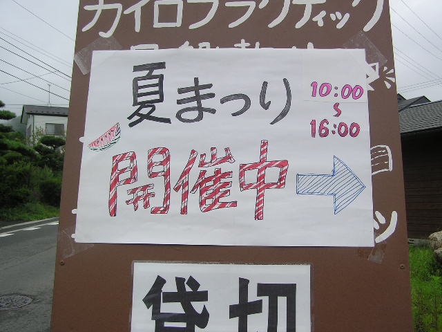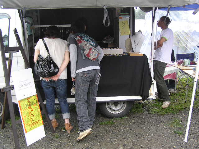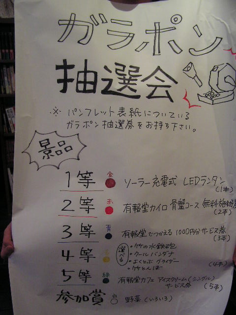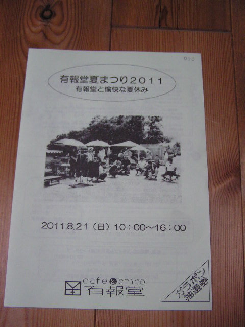 「有報堂夏まつり2011〜有報堂と愉快な夏休み」のフリーマーケットは、雨の中11ブース+2ブースの出店がありました。皆さん雨の中ありがとうございました。 +2ブースは昨年同様、有報堂からのサービス 輪投げです。 輪投げは、あまりにも雨が強いので急遽スロープでやることに。 チャレンジしています。 本や雑貨を売っています。 雨だったので、急遽 出店スペースも作りましたが、室内組は場所の関係もあり苦戦したようです。不手際で申し訳ありませんでした。今度はもう少し雨の日対策を考えますね。 雨の中でも万全の体制で挑んだのは、このブログにコメントもくださった テントは屋根だけでなく壁も完全に覆って、軽トラも駆使して雨でも問題ない完璧な体制です。「いいなぁあのテント」「いいなぁあの軽トラ」「うちも買おうか」と有報堂スタッフがぶつぶつ言っています。 Glass Garden ChiffoN*さんは、とんぼ玉アクセサリーと雑貨、そして果物・野菜を売っていました。果物は完売したようですよ。有報堂でも桃とゴーヤを買いました。とっても美味しく、早速一昨日の食事予約のデザートに使われました。(桃のミルクレープです♪) 人だかりが・・・。少しは売れたのでしょうか。有報堂スタッフも何か買おうと思っていましたが、忙しすぎて無理でした。またの機会にお店にお邪魔したいと思います。 出店者の皆さん、ご来場の皆さんありがとうございました。 愉快な仲間たちの出店は、また明日ご紹介します。 ※来週9/3(土)は、出張営業のため終日貸切となります。通常営業はいたしませんので、何卒ご了承ください。その他の8月の営業のお知らせは7/27の記事にあります。ブログ右側の営業カレンダーもご覧下さい。 雨、雨、雨の「有報堂夏まつり2011〜有報堂と愉快な夏休み」は、やはりこれが大量に忘れられていました。 忘れ物の定番 既に気がついてとりにみえた方もいらっしゃいますが、後4本残っています。 「8月21日の有報堂夏まつりにご参加の皆さんにお知らせいたします。傘のお忘れ物がございます。有報堂でお預かりしていますので、お心当たりの方は有報堂まで取りにいらしてください」 傘を受け取りに来がてら、お茶をするといいでしょう。 ※8月の営業のお知らせは7/27の記事にあります。ブログ右側の営業カレンダーもご覧下さい。 「有報堂夏まつり2011〜有報堂と愉快な夏休み」の「三輪車A級ライセンス大島杯」は、風雨のなか開催されました。 レースの始まる頃は、すごい降りになっていましたが、果敢にレース決行。14名のエントリーでした。 が、子供たちは風雨に負けてレースは、 近頃のちびっ子は、根性がないのか・・・。残念でした。ちびっ子のほうが、断然有利ですよ、このレースは。 ライブ出演者も、大島圭太、オサカミツオ、福澤歩、つるPOMときっちりレースにエントリーします。 調子に乗って 優勝したのは、 愉快な仲間のセリジェ(■■■)Mさん。 代表はあえなく 3位の賞品は、有報堂タンブラーだったので代表的には嬉しくなかったかも。 雨の中賞品も無事授与されました。 2位は、 1位は、 でした。節電のこの夏に人気急上昇のウォータージャグ。景品を買いに行ったときも売り切れの店が多々ありました。おめでとうございます。これで冷たいお茶が飲めますね。 今年も「次は勝つ!」「エントリーに間に合わなかった! 来年こそは」という声が・・・。しかも、お祭りに参加しなかったのに「心の中では、三輪車を漕いでたよ」と言う人まで・・・。今度は心の中でなく実際にご参加くださいね。 大雨の中参加された選手の皆さん、お疲れ様でした。 次はあるのかどうか・・・。皆さまの声次第です。 ※8月の営業のお知らせは7/27の記事にあります。ブログ右側の営業カレンダーもご覧下さい。 8月21日の 「有報堂夏まつり2011〜有報堂と愉快な夏休み」は、おかげさまで無事終了しました。 ご来店の皆さまありがとうございました。 まさかの雨! 1週間前までは全く予想もせず、2・3日前も曇りだけど雨はないだろうと思っていた有報堂。雨対策は全く考えず、当日は朝からてんやわんやです。 有報堂スタッフのなかで、「誰の日頃の行いが悪いのか」・・・犯人捜しで険悪な雰囲気になっています。 まつりの様子は何度かに分けてご報告しますが、まずはご来場の皆さま、フリマ出店の皆さま、ライブ出演の皆さま、そして助っ人の皆さまに心からの感謝を。ありがとうございました。 今年も、またまたたくさんの助っ人の方に支えられて夏まつりを無事終えることが出来ました。 今年一番遠くから助っ人に来てくれたのは、千葉(!)からSさん、Aさん、Aさん、Aさんです。厨房のお手伝いをしてくれました。何と前日の準備から有報堂にこき使われています。 今年も小布施や篠ノ井から来て受付や駐車場係をしてくださったIさん、Sさん、Kさん。 ヨーヨー、輪投げ係をやってくださったのはHさん、Tさん、Bさん。 をやってくださった、Kさん、Uさん、Hさん