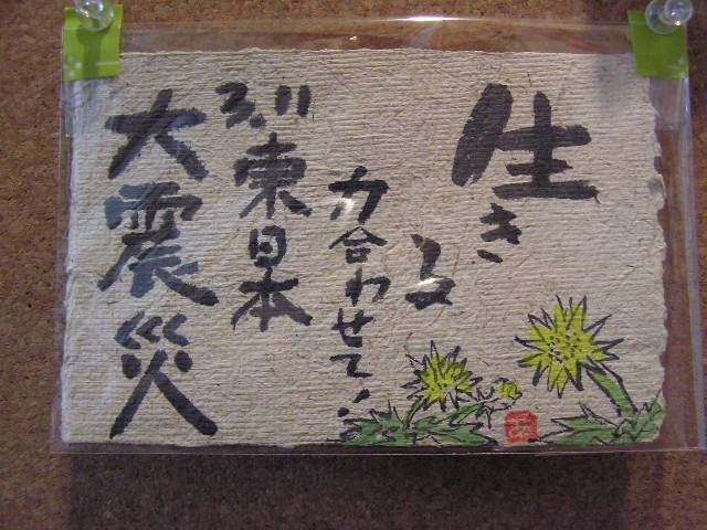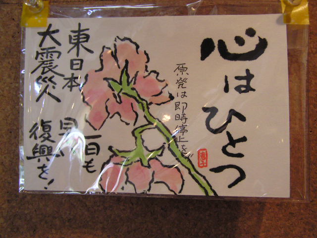 春なので、今年も抹茶スイーツが続々(?)登場です。 「みどりの・・・」が今年もやってきました。甘酸っぱいいちご色スイーツに代わって、さわやかな新緑色スイーツの出番です。 自家製抹茶アイスは、風味のよさとなめらかさが自慢です。抹茶はなんといっても溶かしたりするときだまになりやすい・・・ので、ていねいにふるって辛抱強く溶かしました。カフェ担当渾身の(!?)味をぜひおためしください。 そしてアイス単体で味わうだけではもったいない!昨年ご好評をいただきました抹茶ミルクフロート。だんだん溶けていく抹茶アイスと、だんだん抹茶オレ状態になる牛乳のコラボをぜひお楽しみください。 5月はぜひ有報堂でみどりメニューをいかがですか。 ※5/18〜20に岩手県に向かうボランティアの車が出ます。物資も運ぶ予定でいます。被災地では、青物など生鮮食品が不足しています。もしご提供いただける方がいらっしゃいましたら、ぜひご協力ください。17日までに有報堂に届けていただければ、確実に車に載るように手配いたします。 ☆被災地応援頑張りメニュー(募金付)☆ 水餃子定食(¥900)、フローズンヨーグルト(¥500)好評発売中。 ※5月の営業のお知らせは、4/28の記事にあります。ブログ右側の営業カレンダーもご覧下さい。 5/4に売り切れのお知らせ(■■■)をした が復活です。 ようやく入荷しました。これでしばらくは大丈夫だと思いますが、地震の影響はいつまで続くか分かりませんので、早めに飲んでおいたほうがいいですよ。 も復活です。 フロートの美味しい季節になってきたので、こちらもお勧めです。 フロートは、種類を増やしてフェアをやる予定です。乞ご期待!! ※5/18〜20に岩手県に向かうボランティアの車が出ます。物資も運ぶ予定でいます。被災地では、青物など生鮮食品が不足しています。もしご提供いただける方がいらっしゃいましたら、ぜひご協力ください。17日までに有報堂に届けていただければ、確実に車に載るように手配いたします。 ☆被災地応援頑張りメニュー(募金付)☆ 水餃子定食(¥900)、フローズンヨーグルト(¥500)好評発売中。 ※5月の営業のお知らせは、4/28の記事にあります。ブログ右側の営業カレンダーもご覧下さい。 GWから有報堂の掲示板に絵手紙が2枚張られています。 絵手紙の先生もされているAさんの作品です。有報堂をオープン前から支えてくれている方の一人です。 Aさんご夫妻は仙台出身で、今回の大震災で親戚やお知り合いの方が被害に遭われたそうです。姪御さんのお一人は福島県南相馬市出身で、Aさんのお宅に避難してきています。今回の原発事故によって、いつご自宅に戻れるのかまだ目処はたっていません。 絵手紙にあるように、危険な原発の即時停止が求められています。菅首相の指示により一番危険な原発、静岡県にある浜岡原発は一時停止になりました。これは、私たち一人一人の声の成果です。Aさんの絵手紙のようにささやかな声かもしれませんが、確実な声です。 有報堂でゆっくりお茶を飲める幸運を噛みしめながら、更に原発の永久停止にもっていけるよう、引き続き声をあげていきたいものです。 ※5/18〜20に岩手県に向かうボランティアの車が出ます。物資も運ぶ予定でいます。被災地では、青物など生鮮食品が不足しています。もしご提供いただける方がいらっしゃいましたら、ぜひご協力ください。17日までに有報堂に届けていただければ、確実に車に載るように手配いたします。 ☆被災地応援頑張りメニュー(募金付)☆ 水餃子定食(¥900)、フローズンヨーグルト(¥500)好評発売中。 ※5月の営業のお知らせは、4/28の記事にあります。ブログ右側の営業カレンダーもご覧下さい。 有報堂カフェのお食事予約。コース料理をご注文いただくと、当たり前ですが通常とはちょっと違ったメニューが出ます。 有報堂の真価が発揮されるのは、やはりコース料理のなかでも野菜を使ったメニューです。 最近ご予約で割と人気なのが 秋冬から大活躍の大根。前菜にお出しする「焼き大根の海苔巻き」や大根サラダなどに加えて、今シーズンは何と!大根をナポリタンにしてみました。脇役から主役に躍り出た感じがありますが、コースのなかではメイン料理のまえにお出しする小鉢として登場。 スパゲティを模して大根を千切りにして、じっくりと炒めてからケチャップで味付け。見た目はふつうのナポリタンにそっくりです。しんなりした大根が甘みがあって、生で食べたり煮たりするのとは違った味わいです。大根はあまり細すぎると炒めるときに油を吸いすぎるので、若干太めに切る方が美味しいです。 これをごはんにのせて食べれば「ナポリタンごはん」!! 主食+主食のようですが、大根だとりっぱなおかずになります。有報堂では仕出しのお弁当にも使いました。珍しいのと冷めても美味しいので、おすすめです。 コースで洋風のお料理をご注文いただくと、お出しできるかもしれません。お気軽にご相談くださいね。その