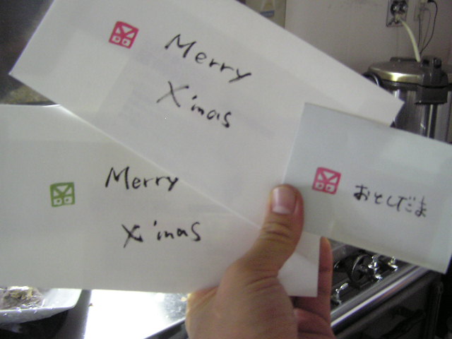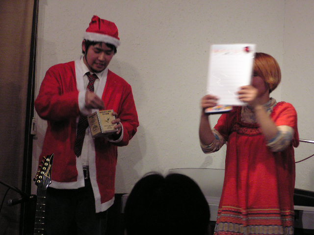 この日は有報堂と愉快な仲間達(上伊那民商青年部)の忘年会。みんなでなごやかに 「今日はサンタクロースをやるからお酒は飲めない」「いつまでサンタクロースを信じていたか」などなどサンタクロース話で盛り上がっていると、 サンタクロースが、有報堂からの愉快な仲間達への贈り物を運んでくれたのです。何が起こっているか分からない愉快な仲間達は唖然としています。 がサプライズのプレゼントです。 ステッキパンは、ときどきテイクアウトでご提供しているちぎりパンで作っています。(大きく作りすぎました) クッキーはクリスマス仕様で 「民商青年部」です。読めますか? 「上伊那」も作りましたが、アップルパイの上には シュー生地で字を書くことをマスターした有報堂カフェ部門、「何でも来い!」と豪語しています。シュー生地で「あれを書いて欲しい!」「これを書いて欲しい!」という方はスタッフまでご相談ください。 今回のサンタクロースさんたちは、昨年有報堂でときめき企画をした笑龍さんです。笑龍さんは、ボランティアで毎年23〜25日にサンタクロースの格好をして、依頼を受けた方のプレゼントを相手先に配達するというサービスをしているそうです。(この宅配サンタは、上伊那全域をまわるそうです。皆さんも来年利用してみてはどうでしょうか) その笑龍さんの宅配サンタの取材を有報堂でやりたいというお話しがあって、急遽サプライズプレゼントを用意してみたわけです。 この取材の様子は25日のケーブルテレビのニュースで流れたようですが、仕事中でスタッフは誰も見ていません。映像を持っている方はぜひ貸していただけませんか。 大盛り上がりのクリスマスイブでした。 笑龍さんありがとうございました。 ※年内は31日まで休まず営業いたします。12/31のみ閉店が18時(LO17時)となりますのでご了承ください。ご来店お待ちしております。その他の12月の営業のお知らせは、12/12の記事にあります。ブログ右側の営業カレンダーもご覧下さい。 毎週末にご好評いただいております「豆腐ときのこのどんぶり」と「豆乳プリン」ですが、豆腐工房まめやさんの年末年始のお休みの関係で、今週と来週はお休みとなります。ご了承ください。 1月の第2週からは、通常通りとなります。よろしくお願いいたします。 ※12月営業のお知らせは、12/12の記事にあります。ブログ右側の営業カレンダーもご覧下さい。 週末はてんやわんやでブログもなかなか更新出来ず・・・・・・ 今日は月曜日だけど営業しています。(明日も営業しています。一服しに来てね)今日・明日は臨時営業でただいま10連勤真っ最中で青息吐息のスタッフたち・・・ そんな青息吐息を吹き飛ばす勢いだったクリスマスライブ! 一日じゅう雪だった25日、お客さん達が来られるかどうか心配でしたが、 お陰様で満席です。 今回はディナーショーだったので、いつものライブのようにたくさん写真は撮れませんでした。料理を作るのが精一杯でブログ部もあっぷあっぷしていました。 ライブは2部構成で、前半は、 が歌いました。皆さんクリスマス用の歌をきちんと準備してきています。さすがです。 前半終了後の休憩で、料理が出ます。 ディナーショーのメニューは、 ☆カナッペ(自家製スモークチーズ、おからサラダ) ☆生ハムと大根の押しずし ☆黒米入りおにぎり(ひじき鮭マヨのせ) ☆イタリアンくずし豆腐 ☆焼きポテト(青のり風味) ☆おからサラダサンド、にんじんマリネサンド ☆ティラミス そして 人気だったのは、 最近有報堂の前菜で人気ものは、焼きれんこんです。この辺りでは蓮根は煮物にして食べるのが主だそうで、焼き蓮根は珍しいようです。焼きれんこんと生ハムにマスタードソースをかけて食べるサラダは、見た目も綺麗で美味しいです。 食事がスタッフの分も残るように聖夜とペチカのおまじないをかけてみましたが、力が足りなかったようです。皆さんもの凄い勢いで食べていて、あっという間になくなりました。お給仕が間に合いません・・・。 飾りの 食べられていました。美味しく食べていただいたようで何よりでした。(何も食べられずがっくりするスタッフ・・・やはり力不足です) お食事を食べながら、お楽しみ抽選会も行われました。 くじを引いています。 オサカさん手製のカレンダー、ギター、さよさん手製の絵、お洋服などなど出演者からのプレゼントが渡されていきます。有報堂からのプレゼントは、 MerryX'mas!の袋には、カイロプラクティックの骨盤調整(1500円)券が、おとしだまの袋には有報堂の500円券2枚が入っています。大盤振る舞い!の有報堂\(^O^)/頑張りました。 プレゼントが貰えた人も貰えなかった人も大盛り上がりの抽選会でした。 後半は、 会場の雰囲気は一変しました。 楽しく雰囲気のあるクリスマスライブでした。出演者の皆さん、ご来場の皆さん本当にありがとうございました。 ※12月営業のお知らせは、12/12の記事にあります。ブログ右側の営業カレン