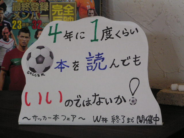 ワールドカップ開催に伴い、サッカー本フェアを行います。 題して 「4年に1度くらいサッカー本を読んでもいいのではないか!」 マンガや 本や 雑誌を 「NumberPLUS」20世紀スポーツ最強伝説②サッカー百年の記憶(倉) ご用意しています。 今年のワールドカップの特集雑誌も もご用意しました。 ワールドカップの放映と合わせて、サッカー本フェアもお楽しみ下さい。 期間は、ワールドカップと同じく7/11のFINALまでです。ご来店お待ちしております。 (忙しくてまだ倉庫を捜索しきっていないので、徐々にサッカー本が増える予定です。) ※6月の営業のお知らせは、5/30の記事にあります。ブログ右側の営業カレンダーもご覧下さい。 |