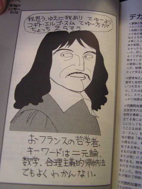 寒いですが、今日から4月です(早い!)。ご好評いただきました冬期限定ドリンクは、昨日で終了となりました。 スタッフの予想を裏切って一番人気は 飲み忘れた方は、ぜひ今年の冬をお待ち下さい。ご愛顧ありがとうございました。春メニューも続々登場の予定・・・。お楽しみに。 営業のお知らせにもあるように、4/3(土)は15:00〜の営業です。何故かと言えば、フリーマーケットに参加するからです。 上伊那民商婦人部まつりのフリーマーケットにお誘いを受けて参加します。 日時 4月3日(土)11:00〜14:00 場所 伊那市西町公民館 カイロプラクティックはワンコインカイロを実施、カフェはテイクアウトメニューを中心に販売します。 チーズクッペやシフォンケーキをはじめ、人気の日替わりサンドイッチはおからサラダともう1品。1周年記念で大変好評だったココアプリンも出します。飲み物は水出しコーヒー、リンゴジュース、予約でしか飲めない伝説のコーヒー牛乳を出す予定です。お時間ある方はぜひお越し下さい。 フリマの時間に間に合わない方は、15:00〜営業の有報堂へ。もしかしたら余ったテイクアウトメニューが販売されているかもしれません。 おまつりはユカイナ(四角いオカリナ)作り体験教室や着付け教室等々、フリマ以外の催し物もたくさんあります。西町公民館のお近くの方は、ぜひのぞいてみて下さい。 ※4月の営業のお知らせは3/27の記事にあります。ブログ右側の営業カレンダーもご覧下さい。 今日は近世哲学の父、ルネ・デカルトの誕生日です。1596年のお生まれです。「今日の本」は、デカルトです。有報堂にもデカルトが!今日はその中から3冊をご紹介します。 「我思う、ゆえに我あり(cogito ergo sum)」という命題で有名なデカルトです。誰もが一度は聞いたことがあるはず。 聞いたことはあるけど、意味はちょっと・・・という人も多いはずです。そんな人には、 がお勧めです。その名の通り入門書です。しかもジュニア向け。第3部2章「理性主義の系譜」のトップバッターがデカルトです。これを読むと少し分かった気になります。読んだその瞬間はすごく理解した気になったんですけどねえ・・・。ヨーロッパ思想の基礎を、ギリシアの思想とヘブライの信仰において、その二つを最初の2章で詳しく説明しています。この流れで読むとデカルトも分かった気に。一気に読んだほうが分かるような気がします。 岩波書店がジュニアをどれぐらいの年齢層にしているかは分かりませんが、自分がジュニアだと思われる時期に読んでいたら全く理解出来なかっただろうなと思います。今読むと分かることも多いし、そうではないんじゃないかと疑問を持つこともあります。成長してますね。大人に勧める入門書です。 にもデカルトが出てきます。 第2章究極の12哲人列伝に これは漫画家・川原泉のエッセイ集です。マンガと同じテンションでエッセイ及び哲学解説。川原マンガを読んだことのある人のほうが楽しめます。第1章のお気楽哲学講座も脱力系でお勧めです。 最後はマンガから 寺沢武一『COBRA』(メディアファクトリー)5巻のシーンです。 SFは苦手なブックス担当ですが、視覚化されるとついていけます。海賊ギルドの銀河統一への野望を描く、「シドの女神」編のクライマックスでこの言葉が。シドの女神へのプログラミングで使われます。デカルト本人は出てきませんが、結構うまいかもと思いました。この話ではもう一人有名人が最後に出てきますが、それはまたその人の誕生日にでも。気になる方は、有報堂で『COBRA』をぜひお読み下さい。 有報堂には、この他にもデカルトが出てくる本が結構あります。デカルトを捜しに有報堂へ来ませんか。 ※4月の営業のお知らせは3/27の記事にあります。ブログ右側の営業カレンダーもご覧下さい。 |