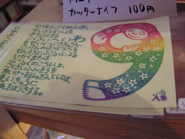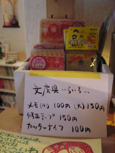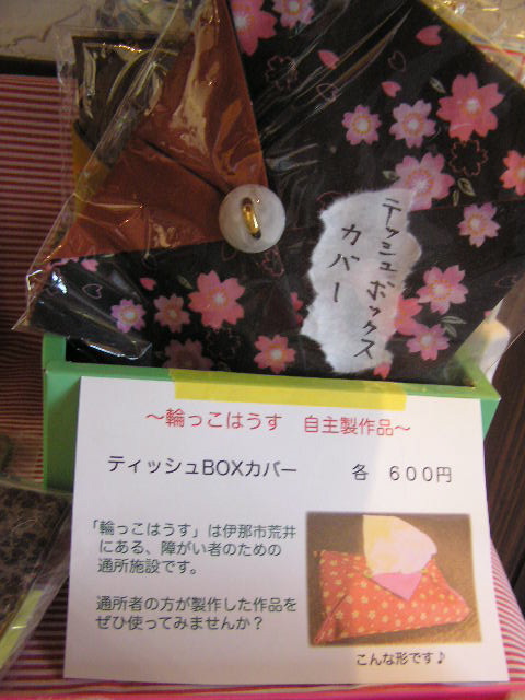 昨日はフリマということで出張営業でした。今日は通常に営業をしております…。昨日に続いてお天気が良く、まさにお花見日和ですね。観光バスがよく通ります。 さて、フリマのため雑貨を入れ替えたついでに、物販棚を整理して販促POPを増やしてみました。早速「物販棚探検隊」が突撃取材です。今回は写真が多いですよ!要チェック! まずは下の段から。 ディズニーキャラクターのタオルですねぇ。フェイスタオルと、ハンドタオルがあります。 3段目です。手作りブックカバーがあります(800円〜)。1枚1枚生地が違います。組み合わせてある裏地もいろいろです。表が落ち着いた色合いなのに、裏地はファンキーな場合も。 1つ1つデザインが違います。チェーンはついていませんので、用意してくださいね。 伊那市内にある、障害者のための通所施設での製作品です。いろいろな模様があります。 さらに上の段へ。 同じく輪っこはうすのMy箸ぶくろ(600円・箸つき)と、キャンドル(1個180円)です。キャンドルは香りがついていないものと、ラベンダーの香り付きのものがあります。クリスマスに店内で灯していたのはこのキャンドルです。 お知り合いの作家・ともみさんによるもの。アンティークのパーツを使っているので、ひと味違います。 残り2つですのでお急ぎください。 やっと1段目に来ました。 カッターや修正テープなどなど。定価の半額以下です。お買い得です。 版画作家・小林煌さんの作品です。 こっちは成瀬政博さんの9条ポストカード。8枚セットで1000円です。バラ売りもしています。たまには葉書で知り合いにお便りを出すのもいいですよね。 有報堂カフェでも使っています。包装がきちんとされているので贈り物にもおすすめです。 最上段はカフェおすすめの白毛餅・黒ごまきな粉・かけぽんです。特にかけぽんはこれからの時期、とても重宝します(実際使うと年中重宝です)。生野菜やそうめん、うどんなど、これをかけるだけでさっぱりと美味しく食べられます。 …長い突撃取材でした。というわけで、有報堂では入り口付近でいろいろと販売しております。ご来店の際には、ぜひ入念にチェックしてみてください。思わぬ掘り出し物があるかもしれません。 ※4月の営業のお知らせは3/27の記事にあります。ブログ右側の営業カレンダーもご覧下さい。 先日お知らせした通り、今日は上伊那民商婦人部まつりでした。朝から仕込んでフリーマーケットに行ってきました。 おまつりらしく 伊那市の歌舞劇団田楽座の皆さんです。(田楽座の女優さんの一人は、有報堂が自家工事中にレンガを張りに来てくれました。) 田楽座は、6/4(金)に19:00開演で、駒ヶ根市文化会館大ホール公演をやるそうです。入場料は前売りで一般3000円、小中高生1500円です。有報堂でもチケットを扱っています。興味のある方、お時間ある方は、ぜひ田楽座公演へお出かけ下さい。 フリーマーケットのほうは、早々とサンドイッチが売り切れ ワンコインカイロも大盛況で、代表はお昼ご飯を食べる時間もありませんでした。 おまつりにご参加いただいた皆さんありがとうございました。 残ったシフォンケーキは、お店で販売していますので、今日購入できなかった方は、明日早速有報堂へ。 ※4月の営業のお知らせは3/27の記事にあります。ブログ右側の営業カレンダーもご覧下さい。 何度もご紹介している有報堂タンブラー。 通常の とは別に、特注でオリジナルタンブラーを販売しています。 ブックス担当自慢のオリジナルタンブラーは 自分のタイガースグッズを写真に撮ってコラージュしました。法被、メガホン、のれん、タオル等々。 画像データをお持ちいただければ、このように編集してお作りします。 条件はただ一つ 大きさはご相談に応じます。 お値段は、作業量によって異なりますが、 完成したデータをお持ちいただいて、印刷と裁断だけであれば500円、 タイガースタンブラーのように、コラージュなどの作業もするのであれば、2000円〜になります。 タンブラー本体は1000円です。 有報堂で世界に一つだけのオリジナルタンブラーを作ってみませんか。 ※明日4/3の営業時間は、15:00〜20:00の変則営業になります。ご了承ください。 ※4月の営業のお知らせは3/27の記事にあります。ブログ右側の営業カレンダーもご覧下さい。