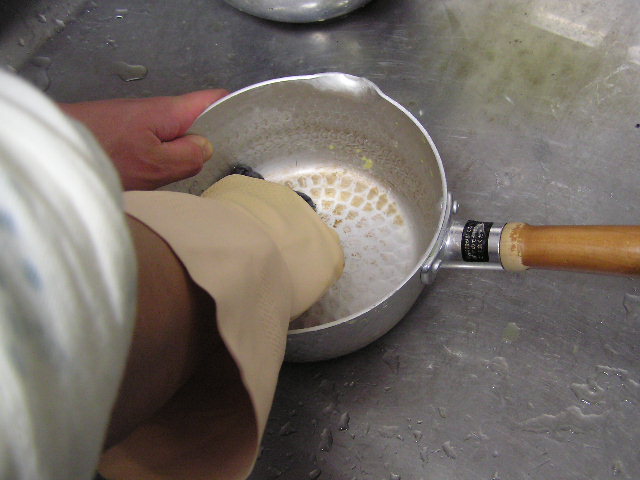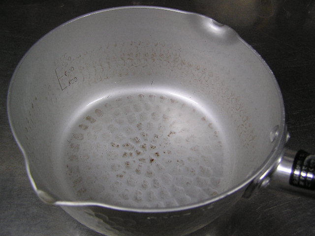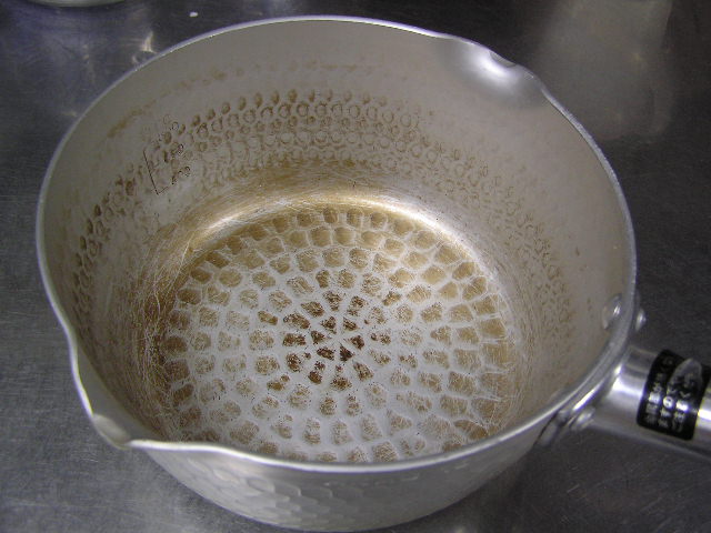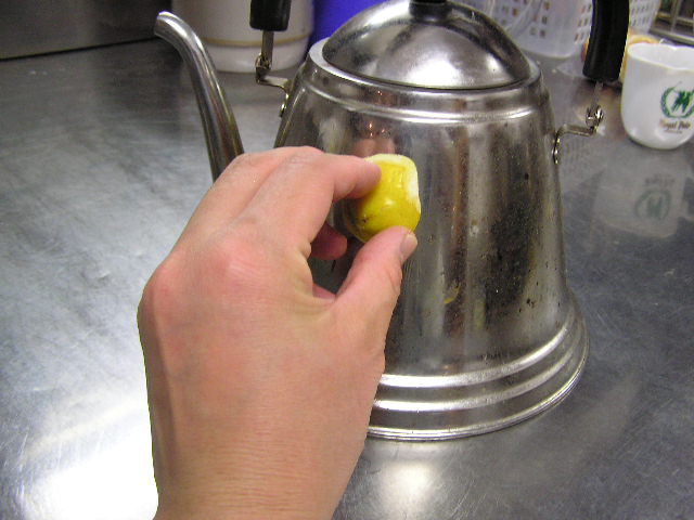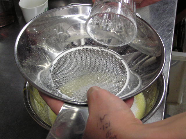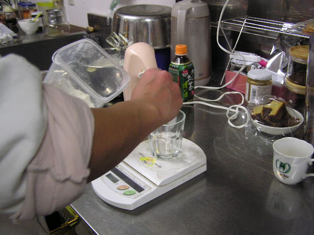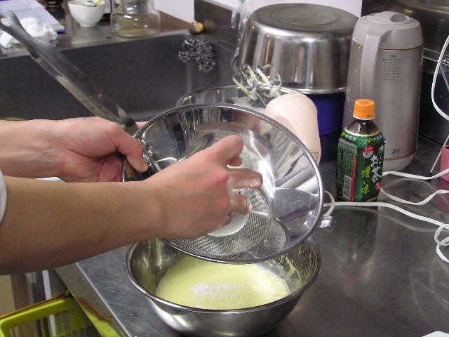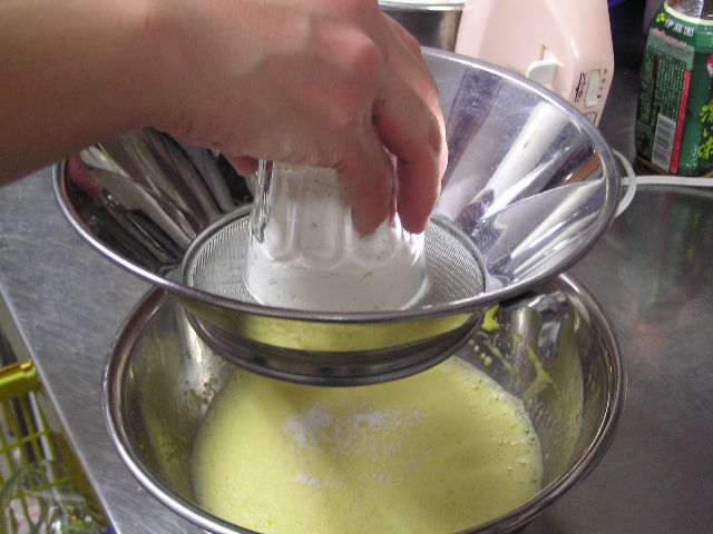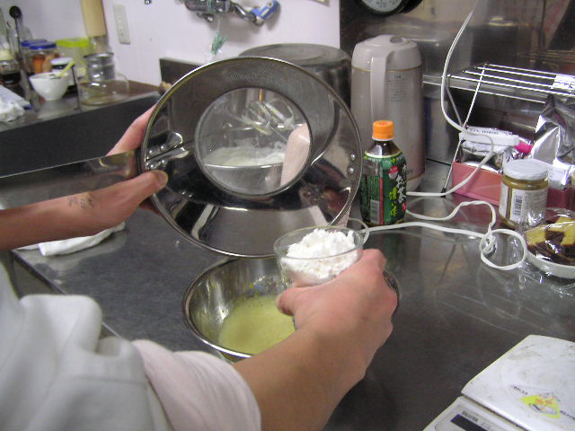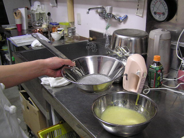 お菓子づくりで体力のいる工程…そのひとつに「粉ふるい」があります。製菓の道具としてはハンドルのついた計量カップ状のものがありますが、通常ご家庭でケーキなどを作る際には、丸いこし網とか粉ふるいのざるに粉をあけて手でゆすってふるう、のが一般的ではないでしょうか。しかし大量にふるう場合はもちろんのこと、あのゆする作業で腕を酷使しますね。 今回は有報堂で実践している、とても楽に粉ふるいができるワザをご紹介します。 まず、何でもよいのでグラスを用意します。 いつも使っている粉ふるいと、粉をふるい入れたい容器を用意します。有報堂の粉ふるい容器はフライパンのように持ち手のついたものです。写真はシフォンケーキを作っているので、この黄色い液体(卵黄・砂糖・なたね油・牛乳を混ぜたもの)に直接粉をふるい入れることにします。 このようにふるいの底をグラスの上辺にぴっちり当てて、隙間からこぼれないようにします。 そのまま密着させた状態でひっくり返し、グラスを網の上で動かして粉を下へ落とします。 最後はグラス内に残った粉をグラスのふちを使って落としきります。 この方法だとふるいを揺する腕の運動よりも少ない力で、とても早く粉がふるえます。しかも、ゆすっているうちに粉が容器の外へはみだしてこぼれることもありません。ぜひおためしください! これは粉を入れて混ぜたあとのシフォンケーキを、これから型に入れて焼くところです。テイクアウト用なので、紙コップに入れます。 「えっ、紙コップ?」と聞かれますが、その通りです。「コップがこげてない!」と驚かれますが、コップが燃えてしまうことはありません。ちょっと小さめでおみやげには最適です。ご来店の際はぜひチェックを!! バンクーバーオリンピック開催期間中のため、明日(もう既に今日ですが・・・)・明後日の土・日は9:00〜スポーツカフェをオープンします。その他、お客様のご要望やスタッフの独断と偏見で、オープン・クローズ時間が変動します。(決まり次第随時お知らせをします) ドリンク・スイーツメニューは、9:00〜オーダー可能です。11:30より前にご飯ものなどのメニューをご希望の方は、仕込みの都合でできるものが限られますのでスタッフまでお尋ね下さい。 ※2/27(土)18:30〜貸切となるため、17:30までの営業となります(L.O.は16:30です)。ご了承下さい。その他の営業のお知らせは、1/28の記事にあります。ブログ右側の営業カレンダーもご覧下さい。 国産レモンフェア中につき、レモンのへた・皮などが残るので、有効活用しようと。 まず、やかん わかりづらいかもしれませんが、こする前の写真は油膜があり曇っていますが、こすった後の写真はやかんに撮影姿が映り込んでいます(笑) 通常は油汚れは重曹でこすってきれいにしています。今回はレモンなのでおそうじ後はレモンの香りがしていい感じです。 今度は鍋 レモン+重曹で しかしもう少し… エコなおそうじとしては、油汚れには重曹、水垢には酢というのが一般的ですが、アルミの鍋はどうしても使っているうちに黒ずんでくるので、酸性のものでおそうじするといいらしいです。 ご家庭でレモンが残ったら、ぜひお試しください。 ※2/27(土)18:30〜貸切となるため、17:30までの営業となります(L.O.は16:30です)。ご了承下さい。その他の営業のお知らせは、1/28の記事にあります。ブログ右側の営業カレンダーもご覧下さい。 期間限定スイーツのモッフルが、定番メニュー入りします! 昨年12月からご提供しているモッフルですが、このあたりではわりと珍しいのか、 有報堂としても、オープン当時から地元産の「白毛餅」を知ってもらおうと餅メニューを展開してきました。餅メニューを増やせるのは嬉しいことです。そこで、今までの 焼きたてモッフルに黒蜜をかけ、バナナと黒ごまきな粉、バニラアイスをトッピング。ちょっと溶けたアイスとバナナ・きな粉を、もちもちしたモッフルにからめてお召し上がり下さい。(今までの「キウイとアイス」はまもなく終了となります) モッフルは白毛餅のおいしさと硬くなりにくい特長を活かせるスイーツなので、定番メニューとしてトッピングの種類を増やしたり変えたりしながらおすすめしていきたいと思います。 しかも、お餅なのでおなかにたまる!?スイーツです。小食の方ならお昼がわりになりそうなくらいです(たくさん食べる有報堂スタッフにはおやつですが…)。ご注文の際には、ボリューム(もち2個使用)にご注意ください。 お餅をお正月だけの食べ物にしておくのはもったいないなと思っています。白毛餅は通年で販売中、有報堂でも取り扱っていますのでぜひお試し下さい。 ※本日は19:00〜貸切となるため、18:00までの営業となります(L.O.は17:00です)。2/27(土)18:30〜貸切となるため、17:30までの営業となります(L.O.は16:30です)。ご了承下さい。その他の営業のお知らせは、1/28の記事にあります。ブログ右側の営業カレンダーもご覧下さい。 今