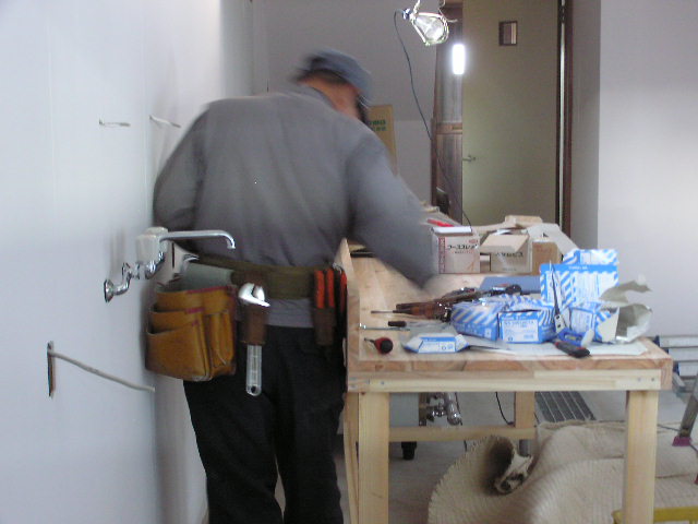 Hさん。ボード張りが終わったので、ビスの見直しやファイバーテープ貼りをやってくれました。